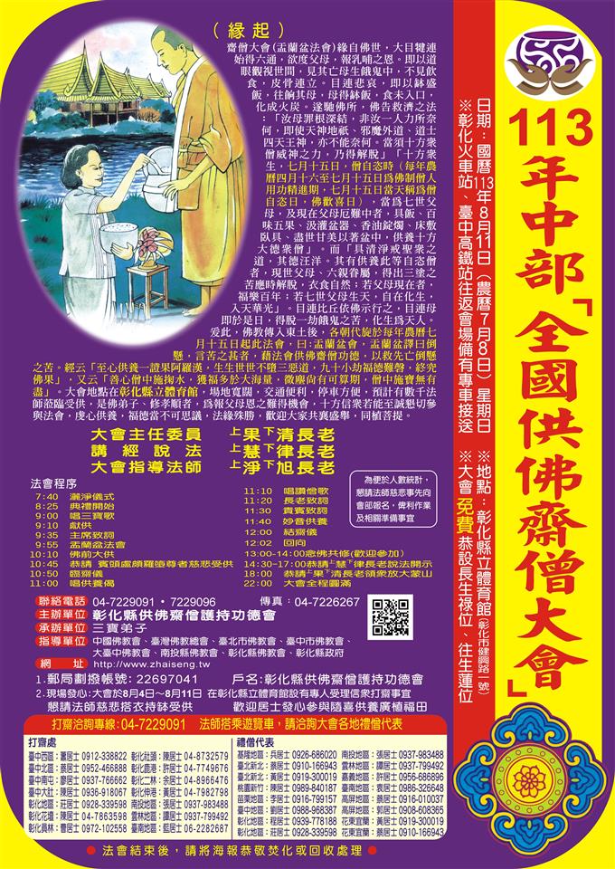 「113年中部全國供佛齋僧大會」訂於今(113)年8月11日在彰化縣立體育館莊嚴盛大辦理,民政處偕同主辦單位「彰化縣供佛齋僧護持功德會」,今(6)日上午11時於彰化縣政府新聞處前咖啡藝廊召開會前記者會,由中部全國供佛齋僧大會長老釋淨旭、理事長陳振吉、總幹事林國華、民政處代理處長曾金來參議等人與會,歡迎四方信眾8月11日前往彰化縣立體育館,齊聚祈福,同沐法喜,期藉由活動,弘揚孝道,淨化人心。 釋淨旭長老指出,中部全國供佛齋僧大會,從民國80年起,就開始在彰化縣立體育館舉辦,這是彰化的盛事,從舉辦以來,獲得縣府團隊的全力支持,也因此籌備的過程都非常順利,透過供佛齋僧大會能夠弘揚孝道,淨化人心,社會如果都能懂得孝順父母、報答父母恩情的話,就會使得社會更祥和,國家就會安定。 民政處代理處長曾金來表示,今年已是第31年舉辦,中間因疫情停辦三年,但大家仍盡心盡力來圓滿法會,在大家的用心、護持之下,參加人數越來越多,今年預計法師、信眾及義工與會人員將超過1萬8,000人,歡迎全國民眾8月11日來共襄盛舉,同植菩提,共創安和樂利的世界。 釋淨旭長老表示,8月11日中部全國供佛齋僧大會當天早上有盂蘭盆法會,下午有念佛大會,有請上慧下律長老來講經說法,晚上主任委員上果下清長老主持放大蒙山的儀式,可以說是冥陽兩利。供佛齋僧大會起源於在佛陀年代,目犍連尊者他的母親在世時因為慳貪,所以死後墮入餓鬼道,目犍連尊者為了救度他的亡母離苦得樂而請示佛陀,佛陀教法說,在結夏安居圓滿日來舉辦供佛齋僧大會,以此功德就可以救度亡母,就這個因緣,所以在佛陀那個年代就舉辦了供佛齋僧大會。 理事長陳振吉表示,感謝王惠美縣長與縣府團隊對於供佛齋僧活動的全力支持,讓每年的大會都非常的順利。彰化縣是一座福地,有八卦山大佛的庇佑,更有王惠美縣長、謝典林議長以及許多人一起為這塊土地不斷的努力,期望透過供佛齋僧大會,淨化人心,讓佛祖的慈悲造福所有民眾,化解人世間的苦難,也讓世人有更多的智慧,身心靈能夠安置,在更領域中都能有更好的發揮。 總幹事林國華表示,農曆七月民間有許多活動, 8月11日在彰化縣立體育館隆重舉辦中部全國供佛齋僧大會,在這一天將會有5千多位法師蒞臨現場,還有1萬多位的信眾共同來參與大會,現場備有免費齋食、還可以繕寫免費牌位、迴向功德、超度祖先。供佛齋僧,庇蔭眾生,一善破千災,竭誠歡迎所有大德一同前來共襄盛舉。 民政處表示,齋僧大會即盂蘭盆法會,源自2500年前佛陀釋迦牟尼佛時代,佛陀弟子目犍連之母罪根深結,墮餓鬼中,佛告救濟之法,應於7月15日供養十方大德眾僧,則現世父母六親眷屬,方得出三塗之苦。目犍連聞脫出之道,遵囑奉行,其母即於當日得脫一劫餓鬼之苦,化生為天人;自佛教傳入中國後,歷朝歷代皆於每年農曆7月15日發心虔奉此盂蘭盆法會,希藉法會普施佛僧功德,以救先亡倒懸之苦,並感念父母恩德,將功德迴向予現世乃至七世父母,以報父母長養慈愛之恩,此為齋僧-大會的開端。 「113年中部全國供佛齋僧大會」,訂於8月11日上午7時40分由「灑淨儀式」揭起莊嚴序幕,9時55分辦理「盂蘭盆法會」,13時「念佛共修」,14時30分恭請上慧下律長老說法開示,18時恭請上果下清長老領眾放大蒙山;法會現場免費恭設長生祿位、往生蓮位,供四方信眾及亡者一同沐浴佛恩,起歡喜心,並希望藉由法會「宏揚孝道、淨化人心」的理念,在循循善誘中使人心棄惡向善,促使社會更臻祥和,國家更加安定。 與會貴賓有中部全國供佛齋僧大會長老釋淨旭、理事長陳振吉、總幹事林國華、創會長陳振山、前會長黃龍水、秘書長陳美玉、副執行長葉瑞珠、曹月緣、陳翰諭、莊怡馨、常務監事陳銘敘、常務理事楊明輝、監事林素珍、李香琴、理事陳穎青、曾有照、許明裕、縣府民政處代理處長曾金來、新聞處長李俊德、民政處副處長陳俊南等人。