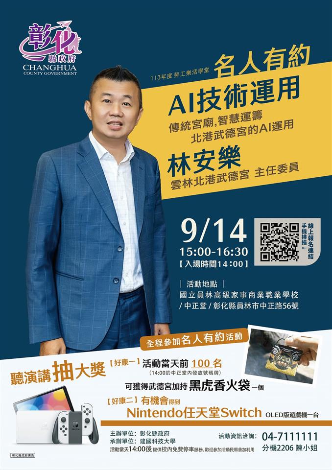 彰化縣政府今年首度推出的「勞工樂活-名人有約」活動,即將於9月14日在員林家商隆重登場。本次講座特邀雲林北港武德宮主任委員林安樂,以「傳統宮廟 智慧運籌」主題,分享北港武德宮的AI運用。活動全程免費,且現場還有精彩的抽獎活動,歡迎有興趣的民眾踴躍參加。 本場與彰化鄉親及勞工朋友有約的名人林安樂主任委員是財神開基祖廟北港武德宮的靈魂人物,不僅致力於傳統文化的保存和發展,更積極將AI人工智慧應用於宮廟事務。林主委引領武德宮以創新思維將AI技術融入傳統宮廟的日常運作中,如AI解籤、建立信眾資料庫…等,大幅提升了宮廟的智慧化管理和服務效率,更是業界的前瞻之作。活動當天,全程參與者不僅可以深入了解林主委對於傳統與AI融合的深刻見解,還可參加加碼舉辦的抽獎活動,全程參加者有機會獲得任天堂Switch遊戲機,而前100名到場的觀眾還將獲得限量由武德宮特製加持的黑虎香火袋。 此次講座旨在提供勞工朋友們最新的科技趨勢知識,讓我們透過主委的分享,了解先進的AI技術如何應用在傳統的寺廟運營、如何讓AI技術成為提升工作效能的神隊友,幫助我們在迅速變化的職場環境中提升自身技能和價值。無論您是對AI技術感興趣,還是希望了解傳統文化如何與現代科技相結合,都不容錯過這次難得的機會。 歡迎即刻掃描活動DM上的QR code報名參加,或致電專案服務人員洽詢,聯絡電話:(04)7111111分機2206,聯絡人:陳小姐。邀請所有勞工朋友到來一起運用AI成為工作神隊友。
