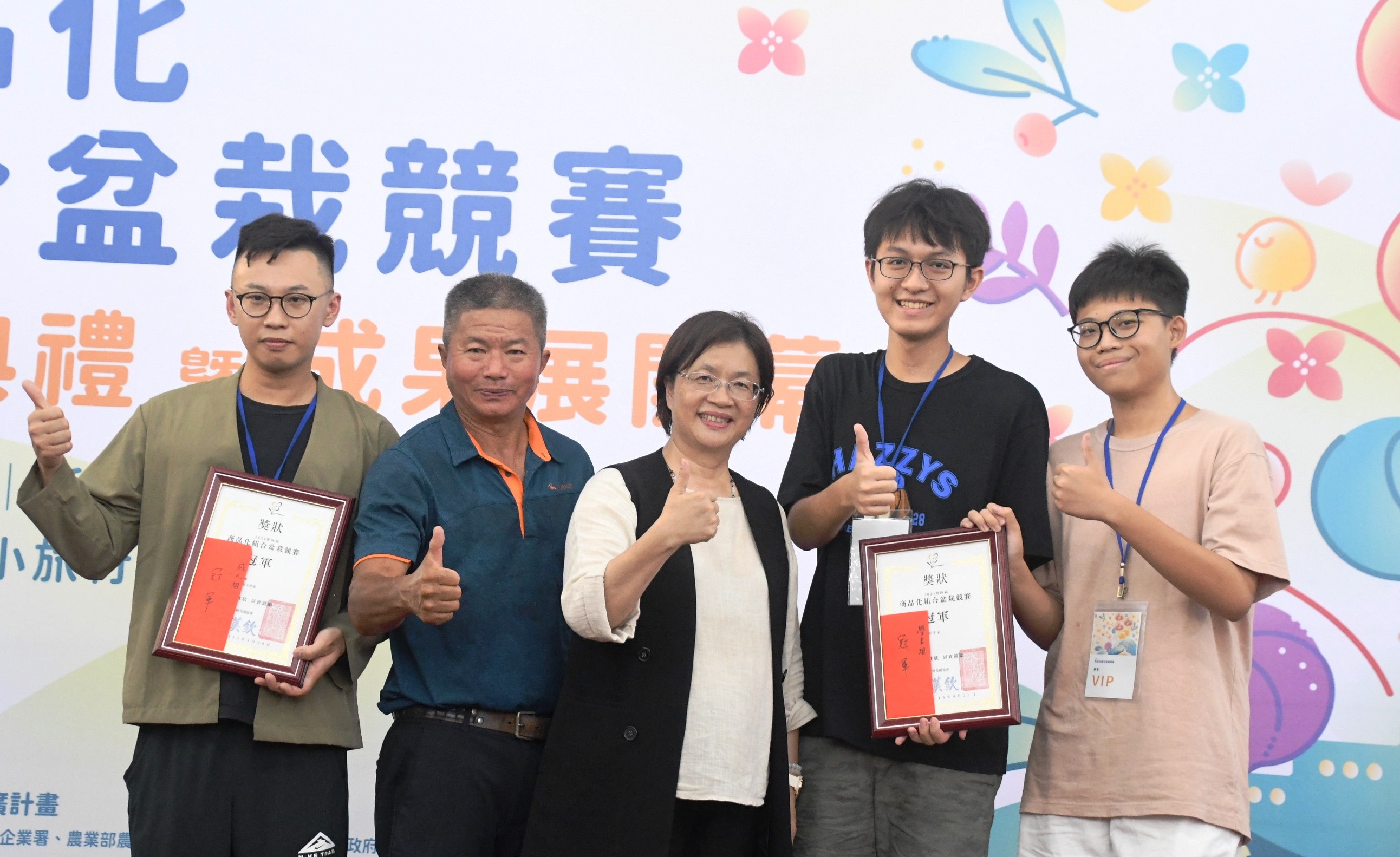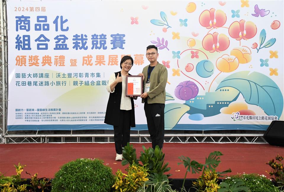 由社團法人田尾公路花園協會舉辦的2024第四屆商品化組合盆栽競賽,來自全台各地 60 組、近百位園藝好手共同創作組合盆栽,讓植物的質感加乘加倍,展現園藝之美,參賽作品中共評選出成人組與學生組共24組優秀作品,今(29)日在田尾鄉農會花卉夢想館舉行頒獎與成果展。彰化縣長王惠美與會,由王縣長與田尾公路花園協會理事長劉漢欽表揚二組的冠軍得主,學生組由陳宥程、謝秉均獲得第一名;成人組則由張逸旻獲得第一名。王縣長表示,恭喜所有得獎的參賽者,也感謝田尾公路花園協會劉漢欽理事長帶領團隊,推動田尾花卉觀光產業的用心,期許大家一起努力,讓更多人發現花都田尾之美。 王縣長表示,「商品化組合盆栽競賽」今年已邁入第四屆,期望透過競賽來提升盆栽花卉的品質,讓彰化的花卉更加國際化,往年只有成年組,今年特別開放「學生組」,讓園藝產業的推廣,融入更多年輕創意,未來再搭配2025台灣設計展在彰化,期待再讓這麼美的事物,讓更多人看見花都之美。彰化有兩個重要的旅遊區,一個是鹿港,為開放式的博物館;另一個就在田尾,為開放式的花園,一年365天,天天都是花季,相信是遊客的最佳首選。 這次競賽以「永續」為創作主題,在作品主題、素材選用上,以友善地球的永續概念發想出組合盆栽作品,參賽作品都非常有創意,且為減少創作過程的碳足跡,還特別選用田尾在地材料現場製作,不僅美觀,還很環保,這也展現了彰化縣在推動永續發展上的決心。 與會貴賓有立法委員謝衣鳯、陳素月、縣議員李俊諭、吳錦潭、行政院政務顧問邱建富、田尾鄉民代表會主席吳俊樑、田尾鄉農會總幹事吳政憲、全國368鄉鎮市長總會長洪參民、社團法人中華盆花發展協會榮譽理事長張滋佳、2024台灣國際蘭展藝術總總監吳維宏、中華盆花發展協會秘書長黃國棟、縣府經綠處長張寒青、各級民意代表、地方仕紳等。