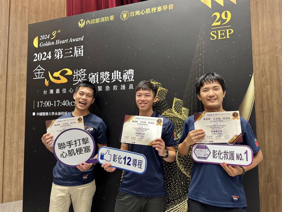 彰化縣消防局同仁於9月29日組隊參加社團法人台灣心肌梗塞學會辦理2024「到院前心肌梗塞救護大作戰」,於全國38組隊伍中脫穎而出,除了榮獲第3名殊榮,還有2組獲得優等的佳績,彰化縣消防局第1次參加就獲得好成績,代表平時訓練紮實,才能有如此好表現! 台灣心肌梗塞學會每年藉由辦理競賽活動來提升醫療及救護人員針對心肌梗塞診斷及處置的專業,本次競賽內容包括CPR操作準確度、12導程心電圖機操作與心電圖判讀以及心肌梗塞專業知識考詢等,參賽隊伍需在限時內完成5大關卡任務,考驗參賽隊伍的救護專業及團隊默契。本次共有38組隊伍參賽,其中也包含醫師隊伍,而彰化縣脫穎而出榮獲第3名的是鹿鳴分隊陳嘉驊、溪湖分隊吳茂榮以及埔心分隊王奕翔,3人消防年資約8年且都具有高級救護技術員證照,其中陳嘉驊及吳茂榮還是去年剛結訓的新科高級救護技術員。陳嘉驊表示,去年參加內政部消防署高級救護技術員訓練讓他學習成長且收穫滿滿,也成為這次比賽的養分,未來也將秉持初心,持續努力在救護工作上幫助更多的人。吳茂榮則表示,這次組隊參加不僅讓同仁的心更加凝聚,也感謝當初捐贈12導程心電圖機的愛心縣民及轄內各醫院醫師24小時線上即時判讀,讓所有救護人員把心電圖傳輸及判讀變成救護日常。而王奕翔說,為呼應消防局優異的到院前12導程心電圖傳輸系統,特別以「誠心守護」作為隊名參加競賽,果真從眾多隊伍脫穎而出,真的很開心可以讓大家都看到彰化縣的成長與進步。 消防局表示,彰化縣在108年創先於救護車全面配置12導程心電圖機並建立到院前12導程心電圖傳輸系統,執行以來已成功搶救心肌梗塞患者400人,讓400個家庭得以圓滿,更在112年獲得衛生福利部「112年臺灣健康城市獎項評選-韌性與創新獎項」殊榮。除此之外,消防局同仁在緊急救護工作表現優異,已連續3年榮獲醫界最高榮譽「金心獎」最佳救護技術員的殊榮,代表彰化縣的救護專業與品質廣受各界的肯定,消防局將持續培訓優秀人才,充實緊急救護裝備,提升彰化縣到院前緊急救護品質,持續守護縣民的健康。
