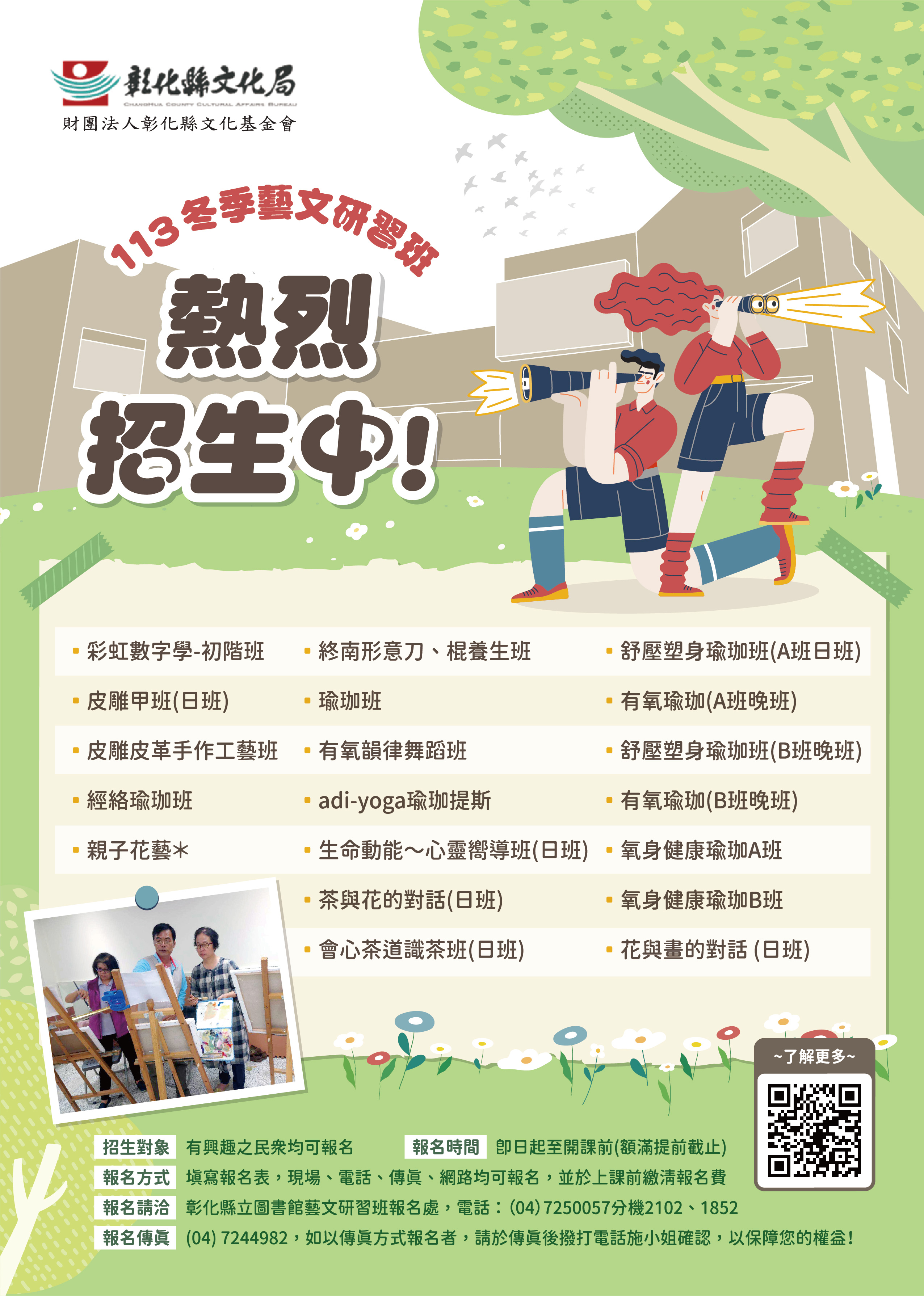 彰化縣文化局為發揮社教功能,增進民眾知識,充實休閒活動,提昇藝文欣賞能力,委託彰化縣文化基金會開辦藝文研習班,課程內容多樣性,有書畫美學成人班、生活工藝成人班、傳統工藝漆線、紓壓園藝、藺草編織、舒心手作拼布、輕鬆彈唱空靈鼓、手捏陶、兒童作文、音樂律動、創意美術、漫畫、書法、烏克麗麗、陶藝捏塑班,為期3個月,每班10堂課,報名費用僅1500元,物超所值,即日起受理報名,歡迎民眾報名參加。 本期新增成人班有藝術療癒成長班、傳統工藝漆線班、快樂編織班,課程內容結合地方文化特色,透過互動、觀察、聯想、體驗等多元化教學方式,啟發學員豐富想像力,與充實藝文創作內涵,詳細課程內容可參閱彰化縣文化局藝文快訊,或至彰化縣立圖書館、彰化縣立美術館、南北管音樂戲曲館,員林演藝廳、工藝展覽館、228暨人權紀念館索取課程簡章,亦可上網至彰化縣文化局/主題專區/研習活動/藝文研習班查詢,網址https://www.bocach.gov.tw/cl.aspx?n=1406,或電洽04-7250057分機1852、2102施小姐。