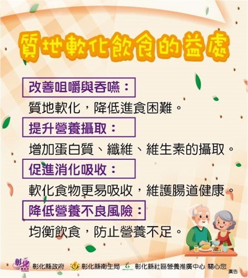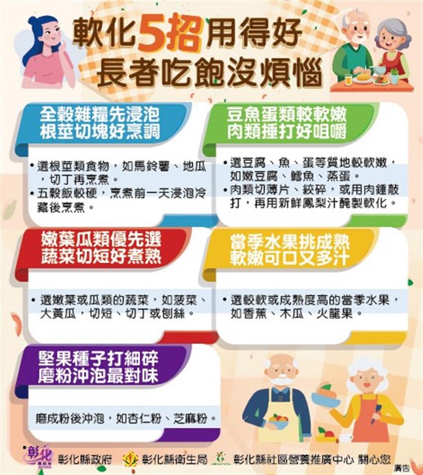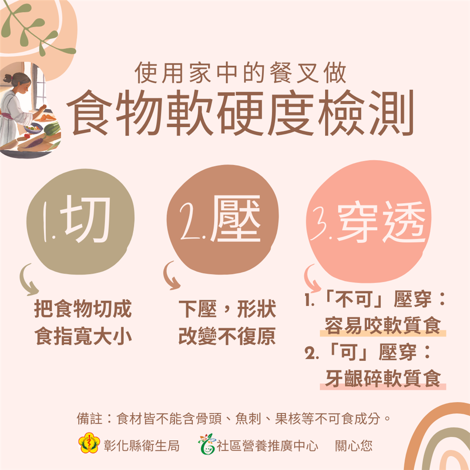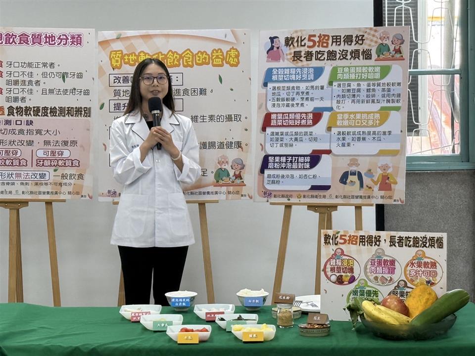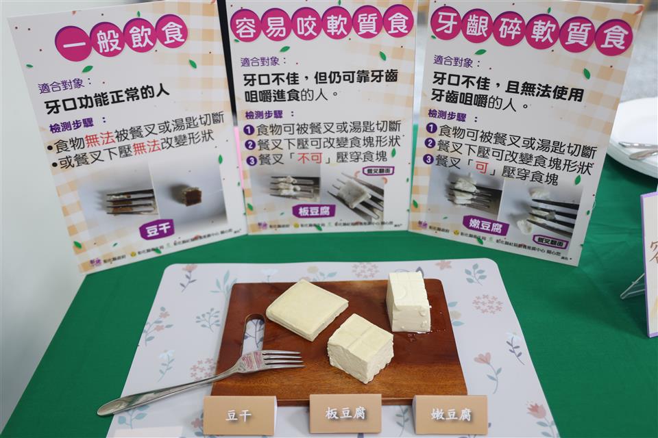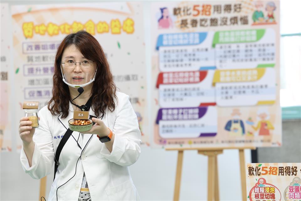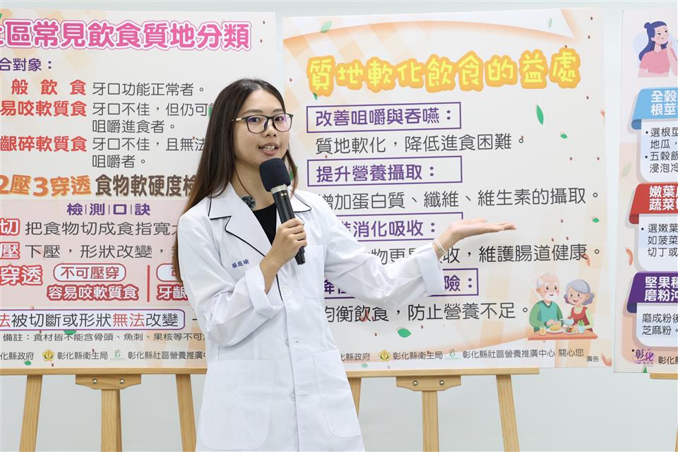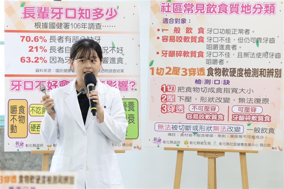 彰化縣衛生局於113年10月15日上午在本局一樓走廊舉辦「軟化食物有五招 長者備餐難不倒」記者會。此次活動旨在提升民眾對質地調整飲食的認識,鼓勵大家將食物軟硬度檢測方法及軟化技巧融入日常備餐,進而促進高齡者的飲食健康。 根據國健署106年調查發現,70.6%的長者有部分缺牙、21%的長者自覺牙齒狀況不好,63.2%的長者因為牙口狀況影響進食。若食物難以咀嚼時,長者的食物攝取種類受到限制,會導致營養不均衡,增加營養不良及衰弱的風險。 本次活動由衛生局副局長及多位營養師共同探討質地調整飲食的概念,並將飲食質地分為三類。「一般飲食」:適合牙口功能正常者;「容易咬軟質食」:適合牙口不佳,但仍可用牙齒咀嚼者;「牙齦碎軟質食」:適合牙口不佳,且無法使用牙齒咀嚼者。 詹元妤營養師分享了五個簡單的軟化食物技巧,幫助牙口不好的長者安心享用美食。第一招,全榖雜糧先浸泡、根莖切塊好烹調;第二招,豆魚蛋類較軟嫩、肉類捶打好咀嚼;第三招,嫩葉瓜類優先選、蔬菜切短好煮熟;第四招,當季水果挑成熟、軟嫩可口又多汁;第五招,堅果種子打細碎、磨粉沖泡最對味。 活動中,詹元妤營養師與社區長者一起體驗飲食質地檢測,使用質地檢測工具(餐叉)並配合檢測口訣「1切、2壓、3穿透」,檢測全穀雜糧類、豆魚蛋肉類、蔬菜類及水果類食物的質地,辨別其質地分類:一般飲食、容易咬軟質食及牙齦碎軟質食。最後再補充說明該類食物的軟化技巧,提供民眾多元的烹調選擇。 衛生局希望透過此次活動提升民眾對質地調整飲食的認識,讓民眾實際應用飲食質地調整技巧於平日餐食準備,以促進高齡者的飲食福祉與營養健康。未來,衛生局將持續推廣健康飲食理念,以提升民眾的健康意識。