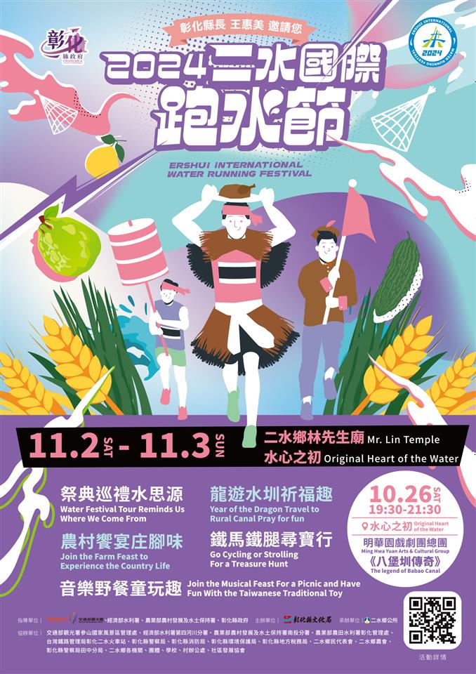 彰化縣一年一度盛大民俗文化慶典活動「2024二水國際跑水節」將在二水鄉熱鬧登場,由彰化縣政府結合交通部觀光署、參山國家風景區管理處、經濟部水利署、農業部農村發展及水土保持署,以及二水鄉公所等單位共同精心辦理一系列精彩活動,今(16)日上午在二水鄉林先生廟舉辦宣傳記者會,彰化縣長王惠美、參山處長曹忠猷、第四河川分署分署長李友平、二水鄉長蘇界欽、農業部農村發展及水土保持署南投分署副分署長陳存凱、農業部農田水利署彰化管理處長徐瑞旻等人與會,王縣長表示,「飲水思源」、「吃果子拜樹頭」,感恩先人開鑿八堡圳引入濁水溪之水,滋養彰化這片土地,二水國際跑水節將在11/2、11/3登場,一連3周的系列活動,10/19有星光電影院,10/20有農特產品展,以及10/26邀請「明華園戲劇總團」無敵小生孫翠鳳領銜主演,將於水心之初大草原演出《八堡圳傳奇》,故事傳達先人開墾的辛勞,特別是八堡圳的源頭就在二水地區,在此展演別具意義,還有11月2日也將舉辦草地音樂會及跑水之夜晚會,讓您可以從早HIGH到晚,11月3日創新辦理千人健行水上漂,要讓更多人知道二水的好山、好水、好人情,歡迎大家攏來二水齊跑水。 王縣長表示,今年以「經典三鐵跑水情,龍遊八堡感恩行」為主題,活動有5大亮點,第一,「祭典巡禮水思源」活動,藉由祭拜天地、林先生,感念先人;第二,「龍遊水圳祈福趣」活動,結合今年生肖年「龍」為主軸,帶領大家一起下去八堡圳跑水;第三,「農村饗宴庄腳味」準備了古早味農村饗宴,邀請在地海鮮餐廳廚師陳佑宣,推廣「食當季,吃當地」觀念,也讓大家吃好料;第四,「音樂野餐童玩趣」邀請學校及知名歌手來表演;第五,「鐵馬鐵腿尋寶行」活動,今年度更嶄新辦理「千人健行水上漂」活動,透過健行活動,讓大家漫遊彰化,老少咸宜,大小朋友都可以一起來參與。另外,大家可以到APP系統下載「二水國際跑水節AR雙語導覽系統」操作使用,體驗AR實境探索,透過AR虛實整合,認識地方文化。 二水鄉長蘇界欽表示,二水國際跑水節的源由是希望大家都能緬懷先賢、感恩天地,賦予濁水溪導入八堡圳,讓彰化有這麼豐沃的水源能灌溉土地,滋養出這麼多優質的農特產品,今年雖在11月2、3日是跑水節主軸,但活動提前從10月19日就開始有食農教育、星光電影院等其他系列活動,感謝中央、彰化縣政府、及二水鄉農會的共同支持,還要感謝王惠美縣長及縣府團隊特別規劃10月26日邀請明華園演出《八堡圳傳奇》,還有 11月3日活動首度以千人健行水上漂,今年主打輕鬆休閒,一家老少都能參與,歡迎來二水健康走、求發財。 參山國家風景區管理處長曹忠猷表示,二水魅力無窮,二水國際跑水節不僅列為國際觀光年曆,還有鐵道櫻花等各項活動,今年蒸汽火車的車頭因修復問題無法出動,但沒關係,還有「海風號」與「山嵐號」,將從彰化來到二水。明年二水鐵道旅遊將增加彩繪,添加二水的觀光亮點,期待二水國際跑水節帶來更多國旅的遊客,讓地方繁榮,彰化更熱鬧,觀光人次衝衝衝。 經濟部水利署第四河川分署分署長李友平表示,每年濁水溪菅芒花盛開時,就是二水跑水節活動開始的時候,所有二水鄉民都會動起來,因此每年都很熱鬧。今年活動更是推陳出新,在八堡圳取水口北面的風水寶地「龍仔頭山」辦理活動。八堡圳在300多年的歷史中,灌溉彰化平原,產出的糧食養活眾多百姓,在神明及先人護佑,以及後人的努力下,歷經多次風災後依然維持正常引水功能。上次凱米颱風雖然沖毀了砂石車便道,第四河川分署將爭取經費,重建砂石車便道,保護二水與八堡圳。 農業部農村發展及水土保持署南投分署副分署長陳存凱表示,在彰化推展順著河流去旅行,順著濁水溪,希望透過遊程的帶動,把整個魅力農村介紹給大家,去年他也有參加活動,他覺得很有意義,食果子拜樹頭、飲水思源,也歡迎大家有空可以多參與農村小童粉絲專頁的活動。 農業部農田水利署彰化管理處長徐瑞旻表示,八堡圳從300年前林先生引水,施世榜集資來開鑿八堡圳,傳說經過林先生的指點,讓八堡圳開圳成功,灌溉彰化平原的水利設施,讓彰化平原得以富饒。跑水節的圳頭祭一直以來是很重要的歷史文化祭典,後來縣府把跑水節發揚光大成為國際跑水節,讓更多人可以透過活動瞭解在地的河川、歷史與常民文化,並提醒大家「食果子拜樹頭」,要懂得飲水思源。 文化局表示,今年為推廣二水鄉特色,還有策劃許多精彩豐富的活動,有「龍來跑水親子趣」、「水水星光電影院」、「創玩石笱逗陣Play」、「足踏黑泥力拔山河」、展售彰化各地農特產及融入在地傳統特色的體驗活動「大地豐收感恩祭-食農教育暨農產推廣活動」,其中「古早味農村饗宴」,邀請在地海鮮餐廳廚師陳佑宣,以胭脂茄、白玉苦瓜、二水好米等入菜做佳肴,推廣「食當季吃當地」觀念,民眾用餐之餘,也能享受二水田園風光,即日起至10月21日,開放民眾上網訂購(報名網址:https://reurl.cc/ly29zj)。此外二水鄉公所與經濟部水利署第四河川分署辦理水資源及愛護河川宣導,主持人會同時在跑水節活動現場進行愛護河川有獎徵答,水是生命之源,跑水更要護水,希望能達到「治水、利水、親水、活水」等水流域有效管理,共同維護這片美麗的青山綠水。 文化局表示,本次活動重頭戲-於水心之初大草原舉辦「跑水草地音樂會」及「跑水之夜