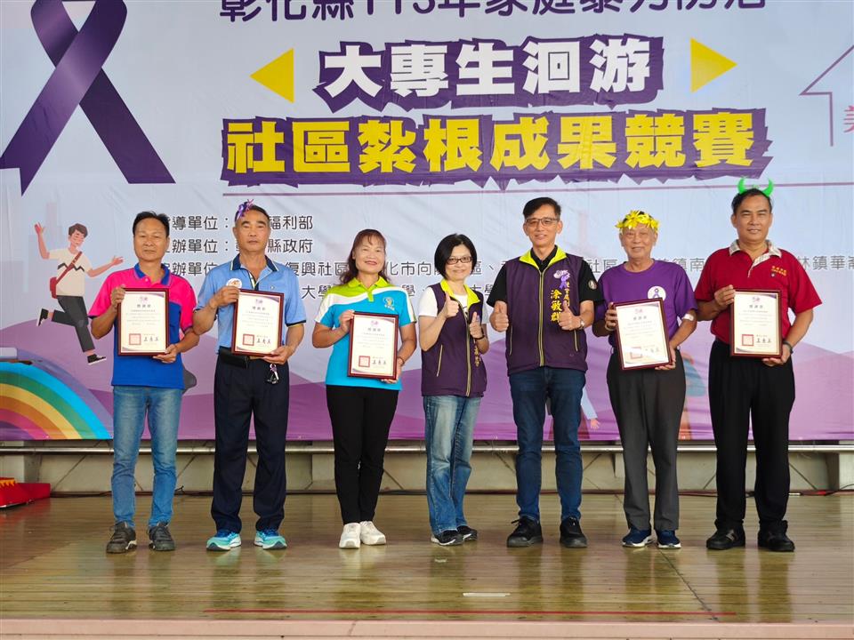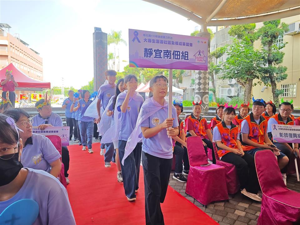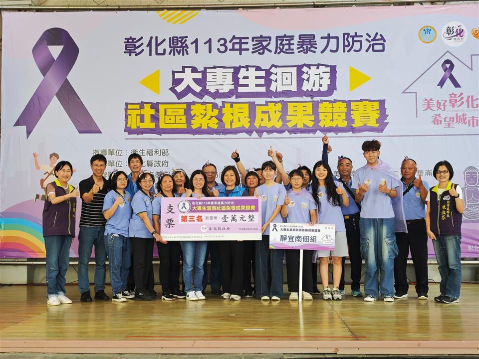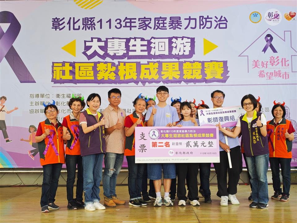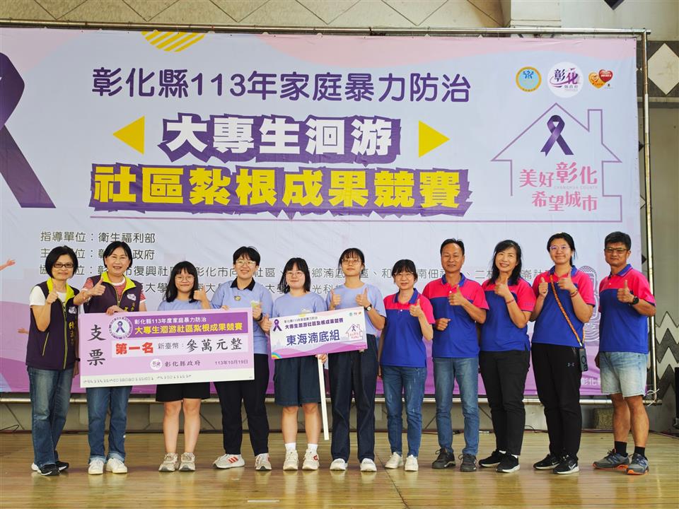 於19日在彰化縣原住民生活館舉行大專生洄游社區紮根成果競賽,本(113)年度共有5隊來自中部各大專院校學生,分別為國立彰化師範大學、東海大學、靜宜大學及弘光科技大學師生所組成,活動開場由社會處涂敏群副處長至會場為大專生們加油打氣;邀請台中教育大學管理學院社會企業中心柯勇全執行長、亞洲大學陳秀靜老師以及靜宜大學江禹嫻老師擔任評審委員。 彰化縣政府多年來持續重視家庭暴力防治的議題,為減少家庭暴力的發生率,運用政府資源結合社區來推動各項家庭暴力防治工作;為因應社區人口老化及中壯年人口外移的情況,彰化縣政府開始辦理「家庭暴力防治大專生洄游社區紮根計畫」,透過年輕人的熱情活力及創意發想,為社區在家暴初級預防的推動上,注入一股新動能。 成果競賽分別以書面靜態展示及簡報報告方式呈現,大專生在成果發表舞台上,向與會者分享社區方案執行的成效、學習經驗與服務點滴,各校同儕透過相互交流、成果分享及競賽方式,促進彼此學習與切磋的機會,並將這半年以來的努力在成果競賽上展現出來,讓更多民眾看見彰化縣在推動家暴防治上的努力,也讓家暴防治的觀念向下紮根並永續化發展。經過激烈的評比後,競賽第一名東海湳底組獲得獎金3萬元、第二名彰師復興組獲得獎金2萬元、第三名靜宜南佃組獲得獎金1萬元、優勝各可贏得獎金6千元。 113年家庭暴力防治大專生洄游社區紮根計畫,執行期間為113年5月至9月,學校指導老師帶領學生,針對社區問題與需求進行資源盤點、依照社區人口特性與在地特色設計家暴防治活動方案,產出宣導影片、手作DIY反暴小物、四格漫畫、設計社區反暴吉祥物、防暴大富翁桌遊等活潑創意的方式。 王處長感謝各校師生及社區熱烈的參與,透過洄游計畫鼓勵大專生深入社區關心在地議題,將防暴知識與創意發想帶入社區,為社區注入新能量;同時也呼籲家庭暴力的預防勝於事後修補,民眾若遇家庭暴力相關問題,適時撥打113保護專線,即時撥打110求救專線。