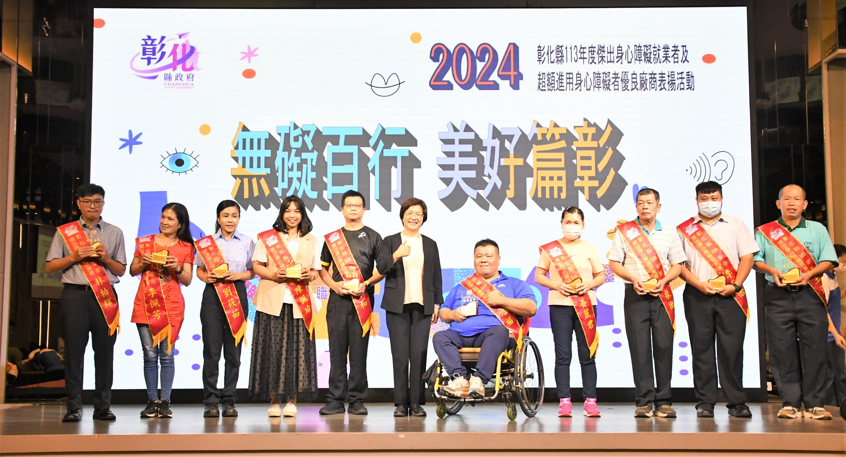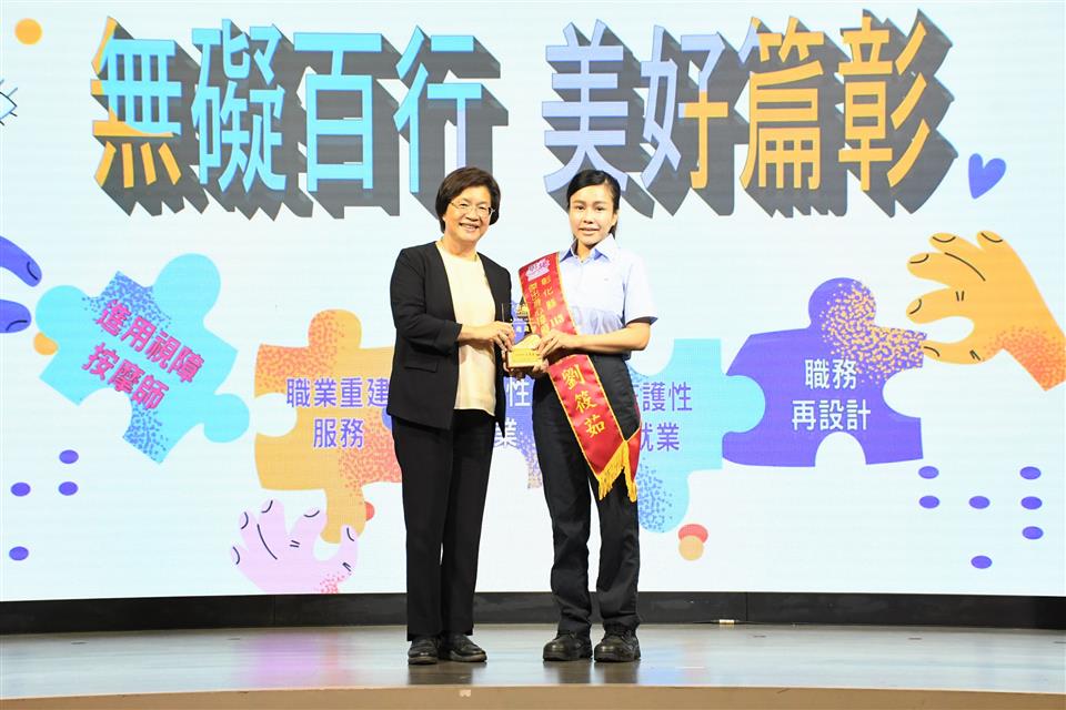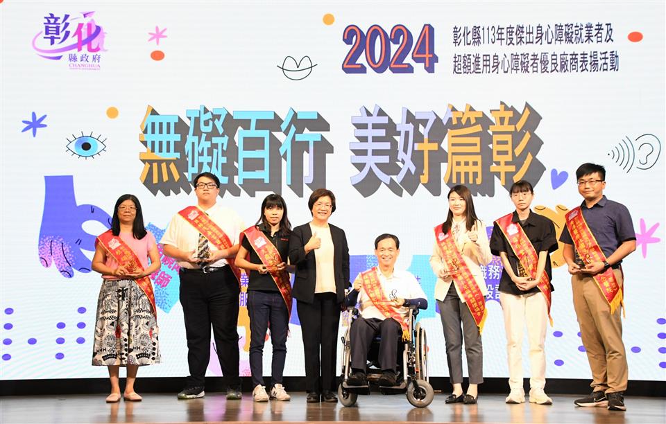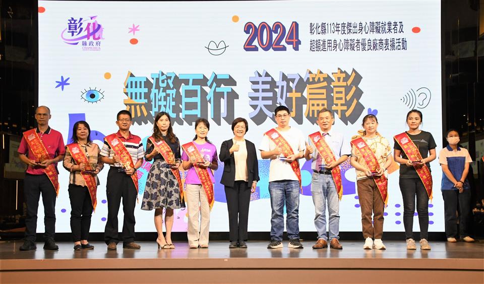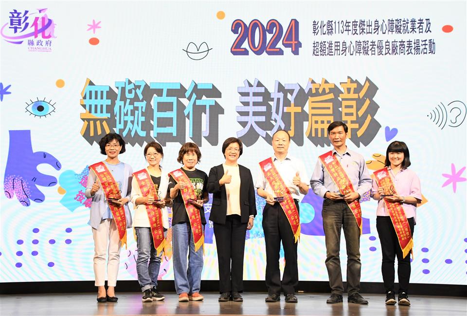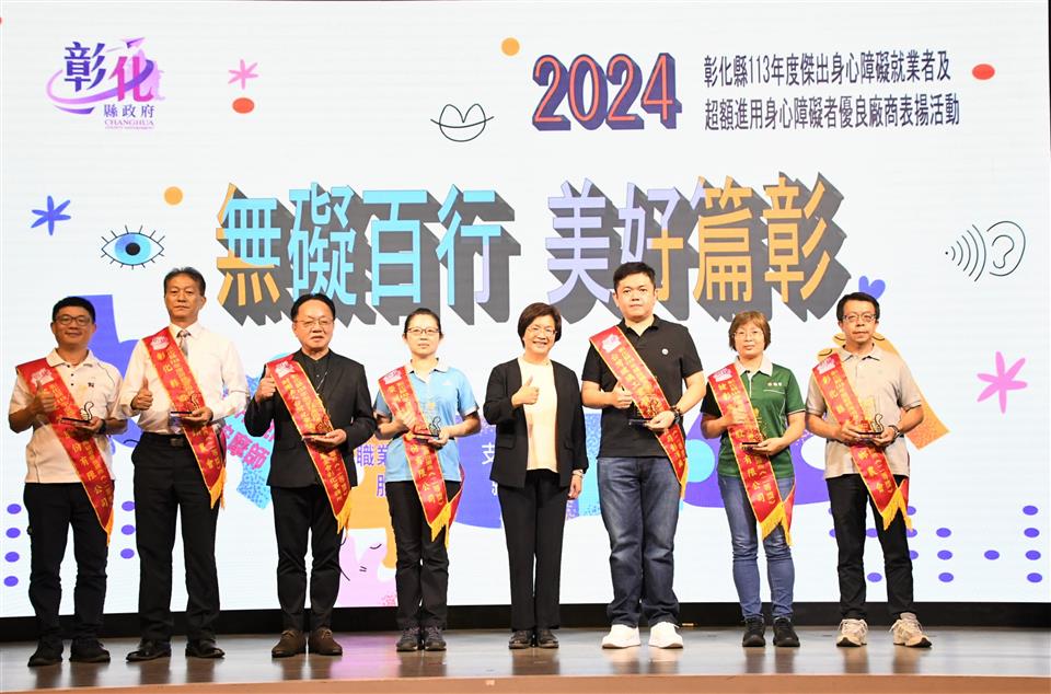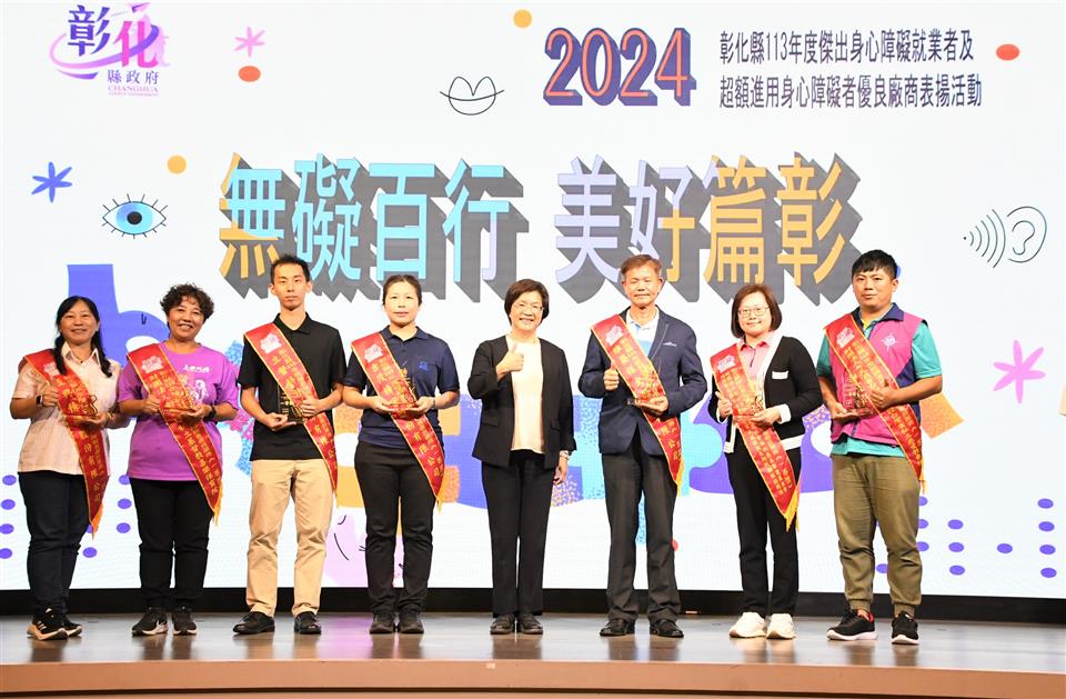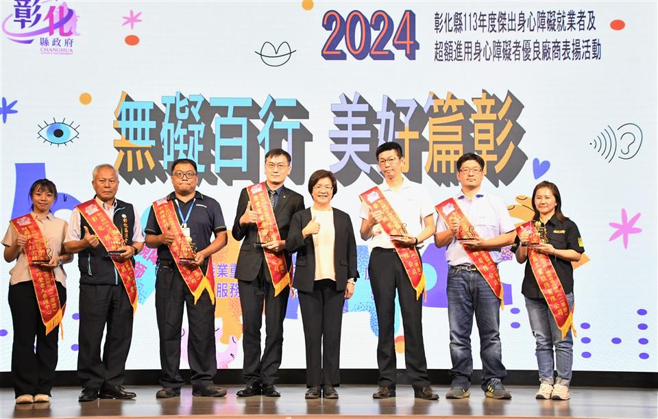 「無礙百行 美好篇彰」,彰化縣113年度傑出身心障礙就業者及超額進用身心障礙者優良廠商表揚活動,10月25日下午在大中華國際美食會館盛大舉行,彰化縣長王惠美出席表彰縣內10位傑出身障朋友及8家優等獎、15家一等獎及47家二等獎,共計70家超額進用身障朋友的優良廠商。王縣長表示,彰化是個非常有愛心的好所在,謝謝非常多有愛心的企業進用身障人士,身障朋友們也發揮所長盡心盡力的,讓企業來重用,呼籲更多企業來進用身障朋友,給他們一個機會,相信他們的表現一定能夠如您所願。 王縣長表示,恭喜10位獲獎的身障朋友,由於您們在職場上的用心努力與傑出的工作表現,獲獎可說是實至名歸。這幾年,縣府團隊不斷致力於維護身障朋友們的就業權益,透過多元適性的輔導、訓練,培養他們的就業能力,且協助各公私立單位運用職務再設計,提供身心障礙朋友就業機會。截至113年9月底,彰化縣超額進用身障人數達1,238人,特別謝謝縣內70家超額進用身心障礙者的優良事業單位,尤其是「彰山環保服務有限公司」同時榮獲本年度「永續力量獎」的肯定,該公司連續十年超額進用身心障礙者,且進用人數累計最多、進用比例更是達到5%以上,為業界樹立了很好的典範。 王縣長指出,現場也特別展出「擁抱愛 無障礙」庇護工場攝影比賽得獎作品,讓大家知道這7家庇護工場的優質產品,自用送禮兩相宜,歡迎大家多多支持選購,鼓勵這些身障朋友,給他們更多的就業機會。另外,也邀請縣內視障按摩師進行免費視障按摩推廣活動,讓大家體驗師傅們精湛純熟的手藝,也鼓勵企業進用視障按摩師來加碼勞工福利,創造雙贏。 彰山環保服務有限公司處長陳力瑋表示,彰山很榮幸能夠獲得這次身心障礙的永續力量獎,彰山在近20年期間都會進用身心障礙者,只要對方願意來到彰山工作,彰山公司永遠大門敞開,歡迎身心障礙者加入。 113年獲獎的傑出身心障礙就業者劉筱茹是透過縣府職業重建服務的協助,經職管員訓練面試技巧及就業市場需求規範等職前準備,再由就服員推介至台灣玻璃工業(股)公司,從事看顧機台、更換緯紗及整理玻纖廢料等機械操作,筱茹表現主動積極、認真負責、樂於助人,也與同事相處融洽,用積極樂觀、不屈不撓的態度面對人生,實足為身心障礙者就業楷模。 另一位獲獎者陳佩瑜從事教育工作,長期在特殊教育領域耕耘,積極進取努力向上,教學用心投入,不論是個人或指導學生參加比賽皆屢獲佳績,更是家長及孩子心目中的好老師,為杏壇綻放芬芳。 勞工處表示,在縣府團隊與各界共同努力下,截至113年9月底,縣內802家義務機關機構(公立204家、私立585家),法定應進用人數1,819人,實際已進用3,057人,超額進用身障人數達1,238人,相較目前全國公私立企業約一成未足額進用身障朋友的狀況,彰化縣在提供身心障礙朋友就業服務上可說是最有愛心、最照顧身障朋友的城市。 本次表揚的10位傑出身心障礙就業者為林柏輝、李佩芳、劉筱茹、陳佩瑜、林澤和、洪添福、姜麗君、巫泉衡、李聖佑、王正雄;8家優等獎包括台灣玻璃工業股份有限公司鹿港廠、帝寶工業股份有限公司、建大工業股份有限公司、彰山環保服務有限公司、富山精機廠股份有限公司、正新橡膠工業股份有限公司、全興工業股份有限公司、許瑞興工業股份有限公司。 與會貴賓有勞動部勞動力發展署中彰投分署副分署長阮啟釧、縣議員賴清美、和美鎮公所主任秘書葉炳模、彰化縣脊髓損傷重建協會執行長江信行、財團法人彰化縣私立慈生仁愛院長楊文玉、財團法人彰化縣私立慈恩社會福利慈善事業基金會董事長李金水、社團法人彰化縣喜樂小兒麻痺關懷協會執行長陳忠盛、社團法人彰化縣白玉功德會附設彰化縣私立秀老郎綜合式服務類長期照顧服務機構理事長邱暉智、彰化縣商業會副理事長楊曜聰、勞工處長何俊昇、副處長吳秋蘭、各級民意代表與地方仕紳。