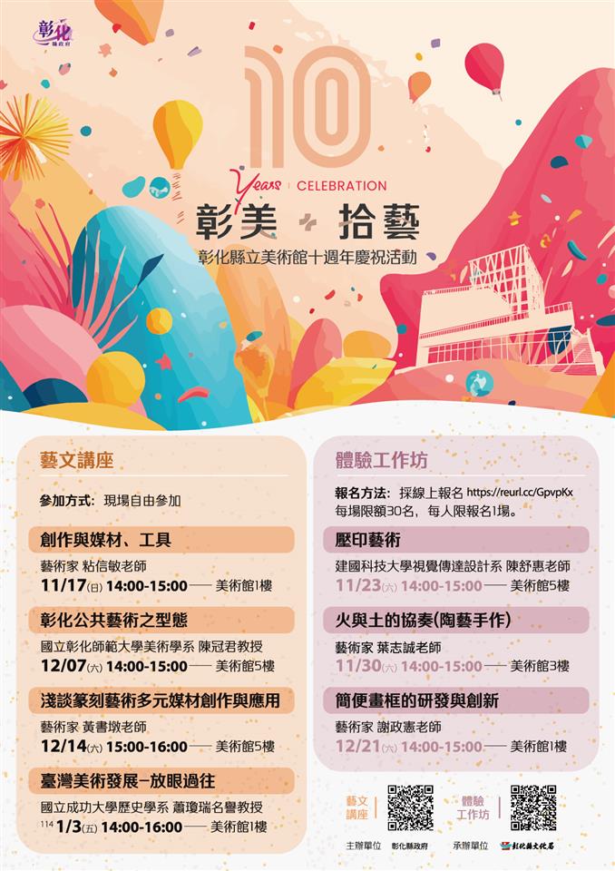 想體驗被藝術品包圍並在美術館過夜的感覺嗎?想瞭解藝術發展及創作媒材的資訊嗎?想感受親手創作藝術的樂趣嗎? 彰化縣立美術館開館10週年慶祝活動連發,113年11月23至24日及12月7至8日將各舉辦1梯次「毛克利夜宿美術館2.0」活動,此外113年11月17日至114年1月4日縣立美術館10週年慶期間,美術館內也安排了多場藝文講座及體驗工作坊,活動豐富精彩,趕快報名參加。 為了慶祝彰化縣立美術館自103年11月25日起正式開館營運即將10週年,彰化縣文化局於今(113)年11月23至24日及12月7至8日在彰化縣立美術館各舉辦1梯次「毛克利夜宿美術館2.0」活動,第一天活動以藝術作品為媒介,結合美術館體驗教育、肢體美學及動手創作課程,讓孩子們透過實地操作與藝術創作,累積美學經驗。第二天則透過「文學步道探涉」讓孩子們在戶外中體驗大自然之美,並在遊戲當中共同協作、發揚童軍精神。凡就讀於彰化縣國民小學4~6年級學生即可報名參加,自11月1日(五)中午12時起至11月7日(四)下午5時止開放網路報名(https://reurl.cc/1bNMpG),每梯次錄取32名,額滿即止。想讓孩子擁有一個與眾不同的美術館過夜體驗,記得把握時間、上網報名。 除了夜宿美術館活動外,美術館也推出一系列的藝文講座,講者卡司堅強,場場都精采,有11月17(日)下午2時知名藝術家粘信敏老師的「創作與媒材、工具」、12月7日(六)下午2時彰師大美術學系陳冠君教授的「彰化公共藝術之型態」、12月14日(六)下午3時藝術家黃書墩老師的「淺談篆刻藝術多元媒材創作與運用」及114年1月3日(五)臺灣重要的美術史研究者蕭瓊瑞教授的「臺灣美術發展-放眼過往」,採自由入座。 為了邀請民眾一同歡慶美術館開館10週年,美術館亦舉辦體驗工作坊,有11月23日(六)下午2時建國科大陳舒惠老師的「壓印藝術」、11月30日(六)下午2時陶藝家葉志誠老師的「火與土的協奏(陶藝手作)」及12月21日(六)藝術家謝政憲的「簡便畫框的研發與創新」,活動採網路報名(https://reurl.cc/E65aEA),每場限額30位,每人限報名1場,網路報名如有剩餘名額,將開放現場報名,喜愛親手創作的民眾,千萬不要錯過。 彰化縣立美術館10週年慶系列活動詳細資訊請上文化局活動官網查詢(https://www.bocach.gov.tw/10chcam/),一起來彰化縣立美術館,感受10週年慶的歡樂氣氛!