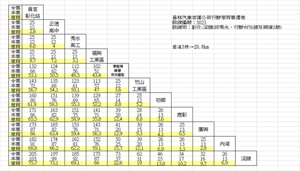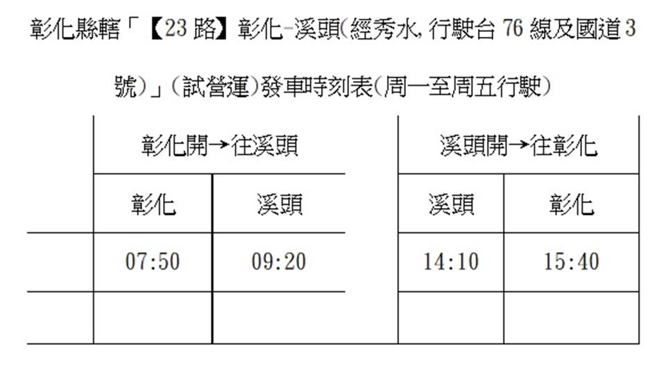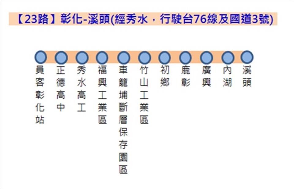 本縣溪頭公車路線深受縣民喜愛,目前營運中之【9路】「彰化火車站-溪頭」、【9路A】「鹿港-彰化火車站-溪頭」、【9路B】「和美鎮公所-彰化火車站-溪頭」、【10路】「員林轉運站-溪頭」、【10路A】「溪湖-員林轉運站-溪頭」及【15路】「二林-溪頭」經常出現供不應求的現象。因此,本府為滿足縣民前往南投縣溪頭風景區之旅運需求,並擴大本縣溪頭公車服務範圍,特別新闢市區客運【23路】「彰化-溪頭(經秀水,行駛台76線及國道3號)」市區客運路線,本路線經本府召開彰化縣政府市區汽車客運業暨大眾運輸業審議會評選後,由員林客運取得路線經營權,即日起正式營運服務。民眾可搭乘公車直達溪頭,以最直捷的運輸方式服務縣民,省卻舟車勞頓之苦,即可享受森林浴,歡迎鄉親踴躍搭乘。 市區客運【23路】「彰化-溪頭(經秀水,行駛台76線及國道3號)」路線係本縣第一條服務秀水鄉及福興鄉至溪頭之市區客運路線,路線係由員客彰化站發車,行駛台19線彰水路途經秀水鄉及福興鄉後,行駛台76線及國道3號至溪頭風景區,全長75.7公里,行車時間約90分鐘。沿途停靠員客彰化站(起站)、正德高中(下莿桐腳)、秀水高工、福興工業區、車籠埔斷層保存園區、竹山工業區、初鄉、鹿彰、廣興、內湖、溪頭。營運期間為每周一至每周五上午7點50分於員客彰化站發車,回程14點10分於溪頭發車。 民眾可於發車前2日透過電話預約,預約專線請撥打員林客運彰化站04-7223153,如有預約及搭乘問題,可撥打員林客運公司客服專線04-8321141或0800-785-688,將由專人為您服務。