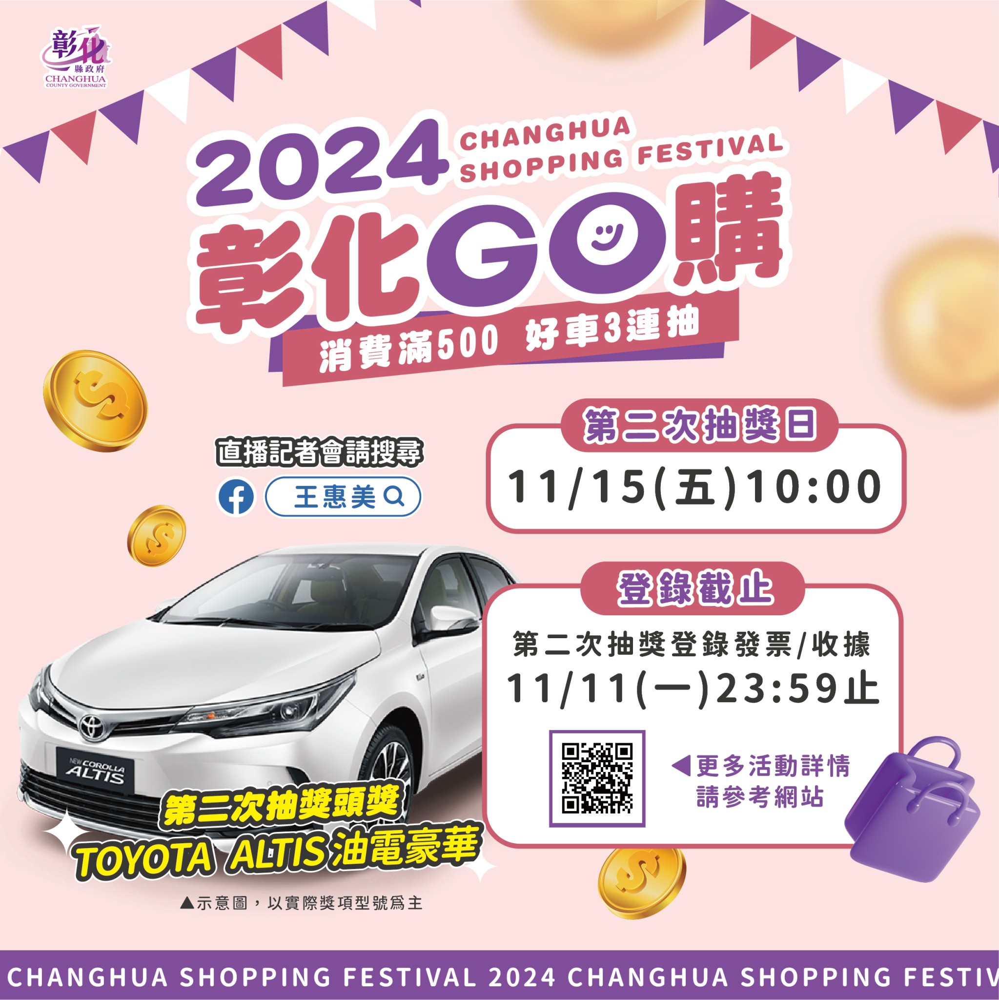 彰化縣政府為振興地方經濟,推出超吸睛的「2024彰化GO購」消費抽獎活動!不僅能讓你在彰化購物、吃喝玩樂,還有機會抱回各種豪華大獎!第二次抽獎就在113年11月15日強勢登場,還沒登錄的朋友要把握最後機會,11月11日是登錄截止日喔! 縣府表示第二波抽獎的獎品超豐富,除了人人夢寐以求的汽車,特別獎電動機車,還有10萬元現金、昇財麗禧酒店等6家住宿券、包括賀得製襪、明奇食品等22項品牌的年份獎,更有機會拿到彰化超夯的新口味蛋黃酥、彰化木瓜牛乳大王,總共有7,828個超讚獎項等你來拿! 縣府經濟暨綠能發展處也分享如何增加抽獎機率的小秘訣,第一步,在超過400家的特定消費店家,消費滿500元以上就可額外多一組抽獎序號,或在11月10日田中馬拉松、11月17日鹿港馬拉松及11月24日二林的伯立歐公益馬拉松等活動,於活動期間在該鄉鎮消費,也可額外多1組抽獎序號;第二步,綁定雲端發票載具(手機條碼),省時省力又有專屬獎!歡迎大家一起來彰化𨑨迌,消費購物,就有機會獎金好禮拿不完。 經綠處強調,第二波抽獎登錄截止日為11月11日,呼籲民眾把握最後機會,趕快衝刺消費!抽獎將在縣長王惠美的臉書直播,抽獎當天也會同步call out給幸運的汽車得主!更多資訊請搜尋「彰化GO購」或上活動官網(https://changhua-go.chcg.gov.tw/)查詢,快來參加吧!