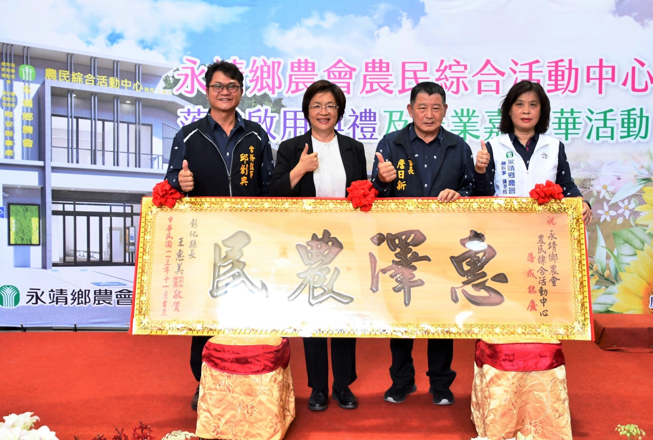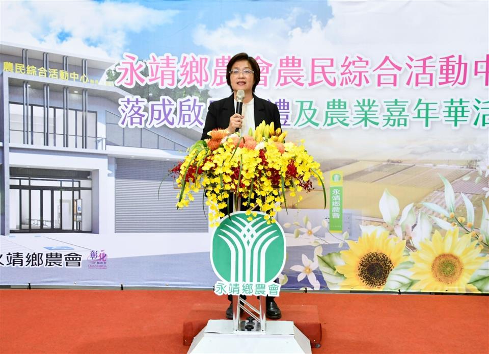 永靖鄉農會農民綜合活動中心於今(17)日正式落成啟用,並舉辦盛大的農業嘉年華活動,彰化縣長王惠美、永靖鄉農會理事長詹日新、常務監事邱創典、總幹事陳翠玲、各級民代等人與會,王縣長致贈「惠澤農民」匾額予以最大的祝賀,王縣長表示,永靖鄉農會農民綜合活動中心在去年八月動工,今天就已經剪綵落成,這項盼了20多年的活動中心,特別感謝永靖鄉農會理事長詹日新、常務監事邱創典、總幹事陳翠玲的用心協調,取得興建用土地,在同安分部興建農民綜合活動中心,且興建完成後可省下租用分社的費用約500~600萬元,特別也要感謝中央農業部的支持,地方在議長謝典林及議員們的預算支持下,共同來完成,提供農民朋友一個展示優質農品、農技交流、舉辦各種農民福利活動的空間,也成為永靖在地的新地標。 王縣長表示,再次感謝永靖鄉農會團隊的用心與努力,在今年就繳出了一張非常漂亮的成績單,恭喜永靖鄉農會榮獲113年第1屆洋香瓜評鑑團體組冠軍及彰化縣茄子果品評鑑競賽團體組亞軍、哈密瓜禮盒榮獲2023年台灣農會百大精品等獎項,真的很不簡單,讓大家看到彰化農民朋友的認真與打拚。 農業部農民輔導司司長陳俊言表示,永靖鄉農會相當用心,為了就近服務農民,積極爭取建設這座活動中心,落成後可以服務更多農民朋友,且彰化縣各鄉鎮市農會也都相當的認真,農業部也會持續支持地方農會的發展,照顧更多農民朋友。 永靖鄉農會理事長詹日新表示,感謝農業部及彰化縣政府的支持,永靖鄉農會農民綜合活動中心興建完成後,不僅能帶動當地的農業發展,也能擴大服務更多農民朋友們,相信永靖鄉農會未來會更好更進步。 彰化縣總幹事張建豐表示,永靖鄉農會農民綜合活動中心落成後,服務觸角將更向永靖西區延伸,相信能將服務量能更加提升,讓農友更加有信心。 與會貴賓有立委謝衣鳯、陳素月、農業部農民輔導司長陳俊言、農糧署中區分署副分署長鍾孟佳、台中區農業改良場科長吳建銘、楊嘉凌、縣議員黃正盛、永靖鄉長魏碩衛、彰化縣農會總幹事張建豐、永靖鄉民代表會主席林致安、副主席黃玉雪、縣政顧問張銘達、陳書友、農業處代理處長蕭麗玲、彰化縣工商發展投資策進會總幹事洪榮章、各農會總幹事代表、各級民代與地方仕紳、農民朋友等人。
