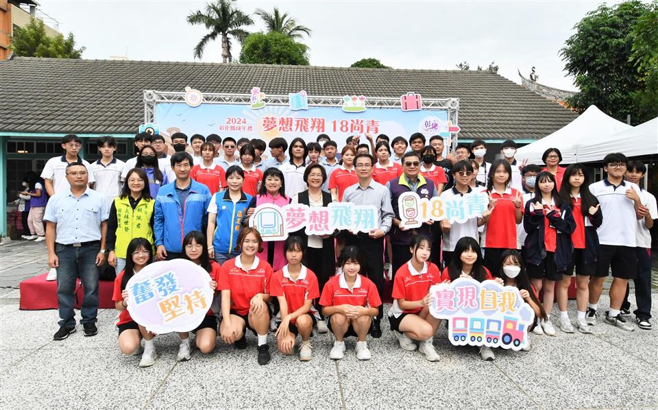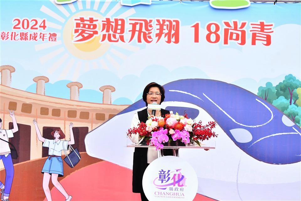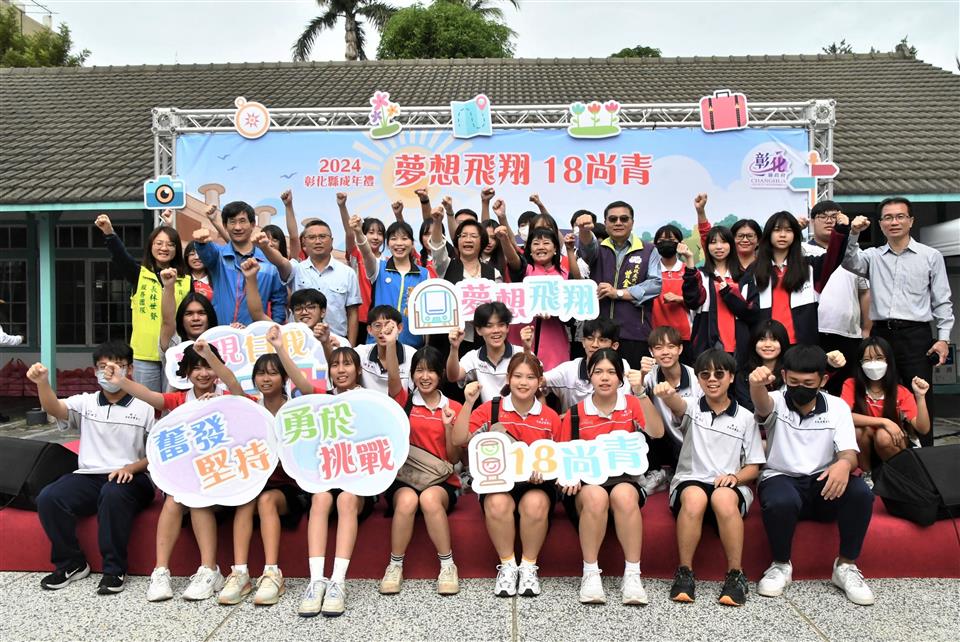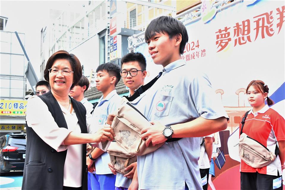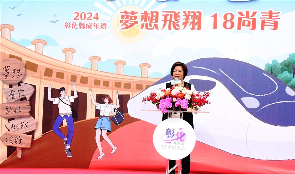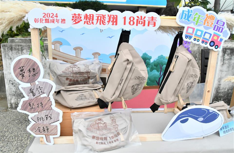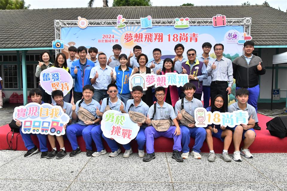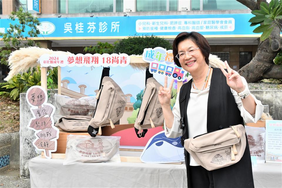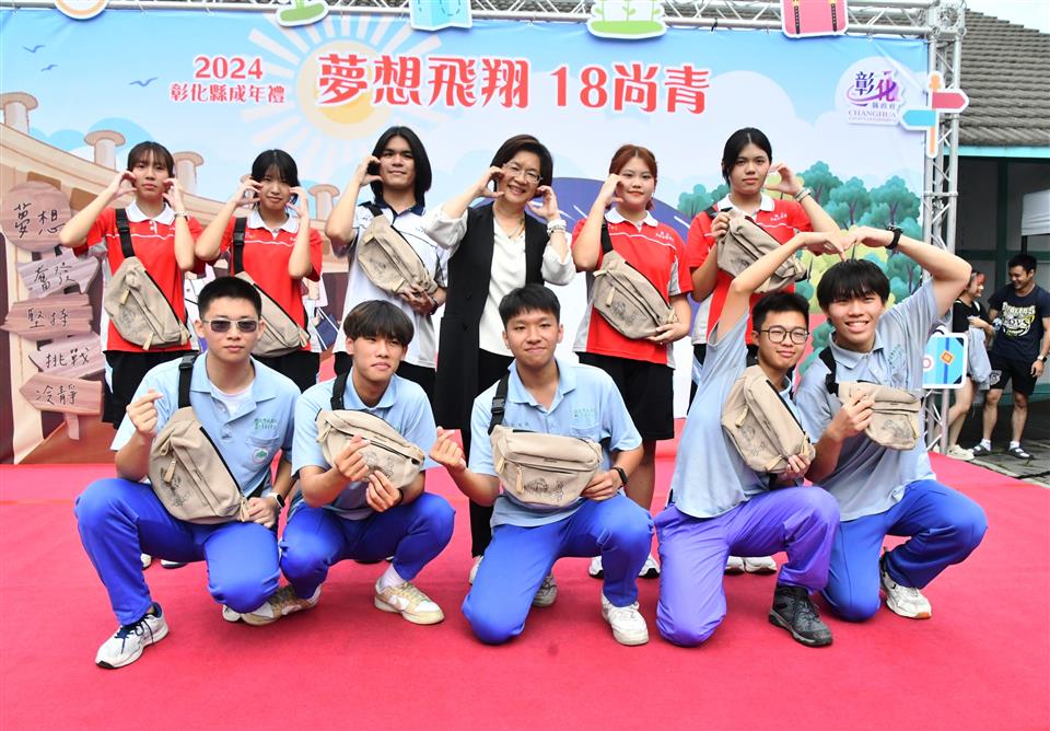 彰化縣2024成年禮宣傳記者會今(20)日在N型未來學院的戶外廣場舉行,彰化縣長王惠美與會恭喜青年學子「轉大人」,邁向人生的新階段!彰化縣政府今年首度設計專屬彰化縣成年禮禮品,融入彰化著名古蹟「扇形車庫」,象徵青年學子即將展開人生新階段,蘊含成長意涵。此設計以具體意涵傳遞縣府對年輕世代的祝福與期許,陪伴他們迎接人生新階段。記者會現場安排了一項別具意義的成年儀式──「18蹲」,王縣長及與會貴賓與來自彰化縣「國立員林崇實高工」及「國立秀水高工」的學生,以象徵成年挑戰的「18蹲」動作完成成年禮,象徵邁向成年的勇氣與決心。隨後,王縣長親自為每位學子背上專屬成年禮紀念包,鼓勵他們帶著勇氣與夢想,邁向人生新階段,次成年禮品將於近期分送至縣內各高中職學校,縣府希望每位高三學生都能勇敢實現夢想,成就自我,為自己的未來努力奮鬥。 王縣長表示,因過往縣府舉辦成年禮的活動名額有限,許多學子無法參與,今年縣府特別為全縣9,015位高三生精心準備了成年禮,以「夢想飛翔 18尚青」為主題,選用青年最愛的「時尚斜背包」做為成年禮品,顏色選擇為男女皆百搭的卡其色,禮品設計圖像則以彰化獨有百年歷史的扇形車庫意象為主,扇形車庫象徵著火車頭、象徵學子將踏出起點、未來的人生衝衝衝,並以「夢想、奮發、堅持、挑戰、冷靜」等激勵話語為核心元素,提醒學子在追夢路上保持冷靜與堅定,勇敢接受挑戰及承擔責任,激勵青年在人生旅程中勇於追夢、不懼挑戰,逐步實現自我成長。 王縣長指出,彰化縣政府也有提供青年創業基金,只要上滿30個小時的創業課程,寫提案經過專家學者審核通過後,最多補助經費30萬元;同學們想出國去留學部分,縣府也有提供留學的低利貸款基金,歡迎同學們多加善用。也感謝師長們對孩子們的照顧,期待學生們為自己的未來做規劃,人生過程中一定會遇到挫折,要如何堅持、持續不斷讓你的人生更加的完美,18歲尚青、尚讚、尚好,好好規劃人生,人生一定是彩色、光明的。 與會貴賓還有縣議員温芝樺、陳玉姬、彰化市公所專員賴佩君、國立彰化特殊教育學校校長謝秋樂、員林崇實高工秘書梁博華、田中高中圖書館主任鄭嵩諴、縣府民政處代理處長曾金來等人。。