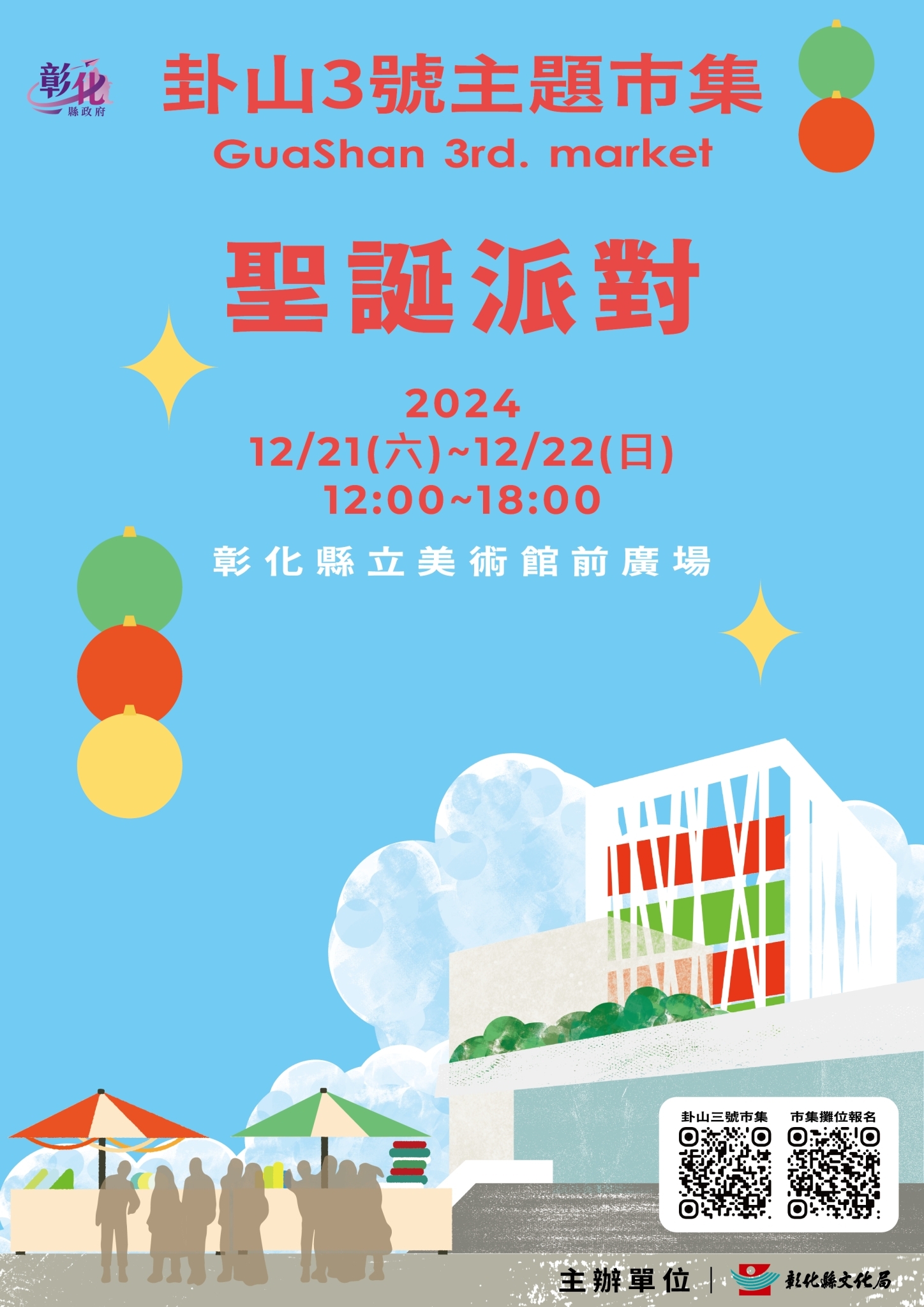 聖誕佳節即將到來,卦山3號主題市集特別推出年度壓軸活動「聖誕派對市集」,將於113年12月21日(週六)及22日(週日)中午12點至下午6點,在彰化縣立美術館前廣場熱鬧登場,邀請大家共享這場溫馨又充滿創意的歡樂派對! 本次市集精選20攤文創攤位,為遊客帶來獨具風格的原創作品,包括手工藝品、插畫商品、特色小物與生活植栽等,讓您輕鬆挑選充滿節日氛圍、最具心意的禮物。現場還有精彩的街頭藝人表演、親子互動活動,帶來滿滿的節日快樂與驚喜。 彰化縣文化局表示,卦山文創市集每月的第三個週末舉行,除了提供文創業者一個展示和交流的平台,也讓參與的民眾感受到文創產業的無限可能。活動當天凡於同攤位消費滿100元即可獲得摸彩券1張,將於114年1月抽出5名幸運民眾可獲得600元書店禮券,另在市集期間,參加打卡送好禮的活動,經服務臺人員確認後即可參加並兌換限量文創好禮4選1抽抽樂,每月各500份,歡迎喜愛藝術的民眾蒞臨縣立美術館廣場迺市集、買文創。節慶的鐘聲即將響起,聖誕派對市集正等著與您相遇!歡迎各位好朋友一起享受美好的午後時光,讓節日增添獨一無二的美好回憶。 卦山3號主題市集將於114年1月18日(週六)及19日(週日)帶來「新年開運市集」,刻正開放報名中,邀請文創業者夥伴們踴躍參與,一起迎接新年的創意饗宴!有意設攤者請前填寫報名表單(報名連結:https://reurl.cc/lgnW36)。