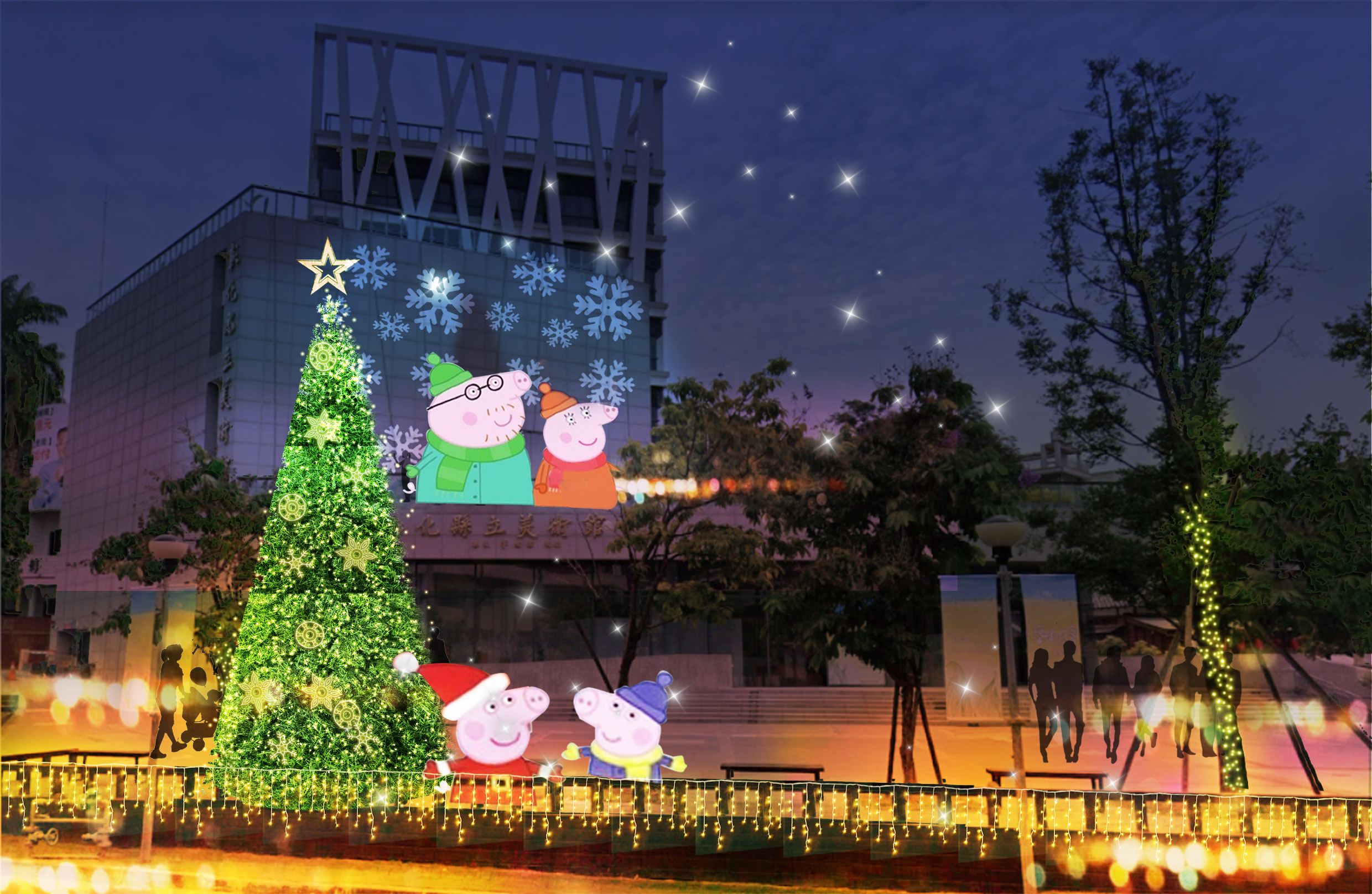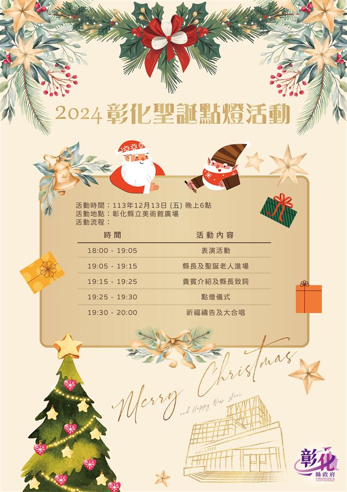 12月感恩月份,彰化縣政府即將於12月13日(五)晚間6時在彰化縣立美術館前廣場舉辦聖誕點燈活動,今年有高達10公尺的巨型聖誕主燈、五光十色的絢爛燈飾,還有深受小朋友們喜愛的知名動畫「粉紅豬小妹」家族氣偶,與大家一同歡慶繽紛聖誕節,彷彿走進夢幻的卡通世界!活動邀請學校、社區團體帶來一系列熱鬧滾滾的精采表演,並邀請教會牧師帶領大家一同禱告,共同為縣民祈福。彰化縣長王惠美邀請大家帶著家人朋友前來參加,與佩佩豬一起共同迎接聖誕佳節! 行政處表示,聖誕樹主燈點燈後,將展至明(114)年2月16日,其餘燈飾展燈至明年3月2日,每天晚上5點30分至10點開燈,邀請大小朋友前來拍照打卡! 城觀處表示,「2025彰化月影燈季」將接續於113月12月28日登場,展出至114年3月2日,今年將整個八卦山大佛風景區打造成歡樂、可愛的「emoji樂園」,也有精彩燈光秀及可愛emoji光雕秀,將給你不同以往的可愛、熱鬧氛圍。