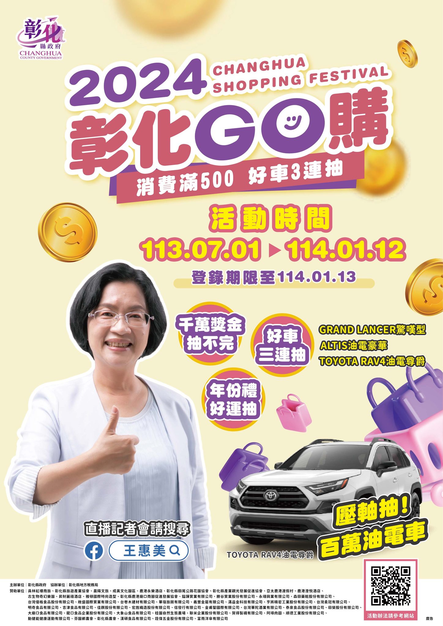 「2024彰化Go購」活動,最後一台百萬轎車,將在 1月15日抽出,從113年7月1日114年到1月12日期間,只要在彰化消費滿500元,發票或收據上網登錄,就有機會抽中大獎,彰化縣長王惠美提醒大家,還沒登錄的鄉親好朋友,趕快把握1月13日最後登錄的機會! 「2025花在彰化」,在溪州公園,白天賞花,自大年初一到十五(114年1月29日至2月12日)隆重登場,每日上午9點到下午6點免費開放,附近還有北斗美食小吃、田尾公路花園,邀請大家來體驗在地風光、嘗美食。 「2025彰化月影燈季」,在八卦山大佛風景區,自即日起展出至114年3月2日止,每天晚上5點30分至10點,今年主題規劃emoji樂園,璀璨閃亮燈光加上各種可愛emoji裝置及燈光秀,歡迎前來遊彰化。
