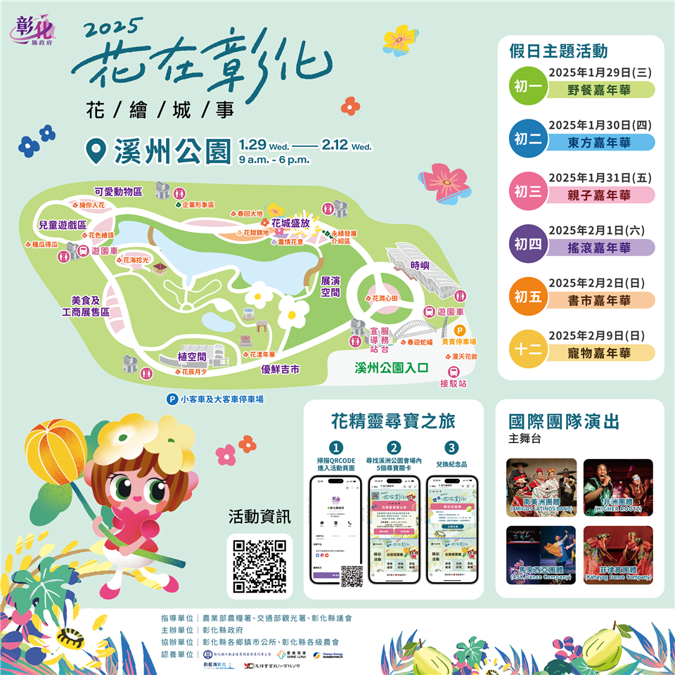 全台首選走春活動「2025花在彰化-花繪城事」,將於大年初一(1月29日)到十五(2月12日)在溪州公園隆重登場!縣府今(16)日上午於彰化縣警察局中庭舉辦宣傳記者會,由縣長王惠美與貴賓一同揭幕活動亮點。王縣長表示,走春首選花在彰化,大年初一到十五,每天早上九點到晚上六點在溪州公園免費入場,2025花在彰化有兩大亮點,一是以「花繪城事」為活動主題,以花為筆,描繪彰化的城市故事,讓美麗盡情綻放,兼具永續跟設計理念的花卉展,有絢麗的花卉盛宴,融合花卉藝術、永續理念及沉浸式體驗呈現;二是有精彩的假日活動嘉年華:包括有六大假日主題嘉年華、四大國際團隊演出及特色市集活動,邀請全國民眾新春期間來彰化賞花漫遊、尋寶、吃美食。 王縣長表示,「2025花在彰化-花繪城事」,兩大展館各有特色,彰化是花的故鄉,田尾及永靖是全國花卉種植的重鎮,在主展館「時嶼」,融合花卉藝術及SDGs理念,運用社頭織襪、廢棄的葡萄藤,打造出兼具美學、環保意識的裝置藝術,還有一個夢幻打卡熱點「花海希望」互動展區,是時下熱門的動態投影技術,相當新鮮有趣。在小展館「植空間」,過去只有一個展覽,這次小展館有三個檔期不同的花藝作品展,春節期間歡迎來欣賞不同的花卉風貌,小展館還有提供適合親子的食農教育手作課程、組合盆栽與綠生活市集,療癒身心靈,現場還可以填問卷送鮮花。 王縣長表示,精采的六大假日主題嘉年華,從大年初一(1/29)野餐嘉年華、初二東方嘉年華(1/30)、初三(1/31)親子嘉年華、初四(2/1)搖滾嘉年華、初五(2/2)書市嘉年華、十二(2/9)寵物嘉年華,還有假日限定市集,比如初一胖卡美食、初二傳統小吃市集到大年十二的寵物市集,初一登場的野餐日活動即日起開放報名,參加者可獲得超值野餐墊及餐具組,當然還有每個農會用心推廣的彰化優鮮農產及地方美食,以及園區內還有數位集章闖關活動,完成就有機會抽中驚喜好禮。另外,也有四大國際團隊,分別來自馬來西亞、非洲、南美洲和菲律賓現場演出,不用出國也可以看到國際級的世界文化。 王縣長指出,春節期間彰化縣南花北燈,還可串聯八卦山大佛,扇形車庫、鹿港老街、田尾公路花園、台灣優格餅乾學院等5個「台灣觀光100亮點」,再加上「員林燈會」、「白色海豚屋」總共8個景點,只要在現場參加集章活動,使用LINE掃描指定QRcode,完成兩個章即獲得1次抽獎資格,最高累計4次抽獎機會,完成5個章還能兌換限量紀念品。 農糧署中區副分署長鍾孟佳表示,彰化縣是花的故鄉,種植面積約有五千多公頃,佔全國四成,數量與品質都是全國第一。花在彰化活動今年邁入第19年,入園人次從數十萬成長到百萬,是全國鄉親在過年走春旅遊的首選,今年活動以「花繪城事」為主題,展現彰化花卉特色。另外,彰化有得天獨厚的氣候與地理條件,擁有優良的土壤與水質,加上農民用心栽培,所生產出來的濁水米、葡萄、紅龍果等農產品不僅是產量最多,品質更是優良。邀請全國鄉親從大年初一(1/29)到十五(2/12),來彰化走春,不僅可以欣賞美麗的花卉,還可以品嘗通過3章1Q「彰化優鮮」的農產品。 溪州鄉長江淑芬表示,溪州有在地的農產品、好吃的美食,如溪州的羊肉爐及芭樂等等,歡迎全國的好朋友來彰化溪州走走,把錢花在彰化,祝福大家開心、圓滿幸福。 彰化縣農會總幹事張建豐表示,花在彰化每一年都有不同的特色,吸引全國好朋友來彰化走春,看到彰化農業的進步,今年的主題結合SDGs理念來呈現,相信今年會讓大家看見不一樣的風格,也感謝王縣長在花在彰化的盛大活動中,讓26鄉鎮農友都設攤位展售農產品,相信全國各地好朋友來溪州公園一定可以買到最優質的農產品。 縣議員李俊諭代表致詞時表示,花在彰化活動在王惠美縣長的支持下越辦越好,尤其從在規劃活動時的貼心及細心安排,如停車場的規劃,越來越好,離展館也越來越近,也讓鄉親能直接步行,沿途欣賞優美的田園風光,就可以看出來王惠美縣長縣府團隊的用心。溪州不僅舉辦「花在彰化」,還有豐富的農特產品,如芭樂、羊肉等,充分展現彰化農業的實力與特色。 與會貴賓有縣議員李俊諭、凃淑媚、曹嘉豪、陳玉姬、溪州鄉長江淑芬、農業部農糧署中區副分署長鍾孟佳、農村發展及水土保持署南投分署副分署長陳存凱、農業部臺中區農業改良場副場長蕭政弘、彰化縣農會總幹事張建豐、溪州鄉農會總幹事彭顯賦、埤頭鄉農會總幹事王宋民、和美鎮農會總幹事謝燕如、田尾鄉農會總幹事吳政憲、員林市農會總幹事黃豐盛、福興鄉農會總幹事林坤宏、永靖鄉農會總幹事陳翠玲、溪湖鎮農會總幹事陳金源、線西鄉農會總幹事王嘉琪、彰化縣青年農民聯誼會長孫崇鈞、彰化縣觀光休閒農業發展協會理事長張梅嬌、總幹事黃錫瑋、新聞處長李俊德、縣府農業處代理處長蕭麗玲、埔心國小校長廖松圳、各級民意代表與地方仕紳。 官方活動資訊: 白天賞花:溪州公園-花在彰化 活動期間:114/1/29~114/2/12 9:00~18:00 活動官網:https://www.ch-flower2025.com.tw 夜間賞燈:八卦山-月影燈季 點燈期間:113/12/28~113/3/2 17:30~22:00 活動官網:https://ch-emoji.mystrikingly.com