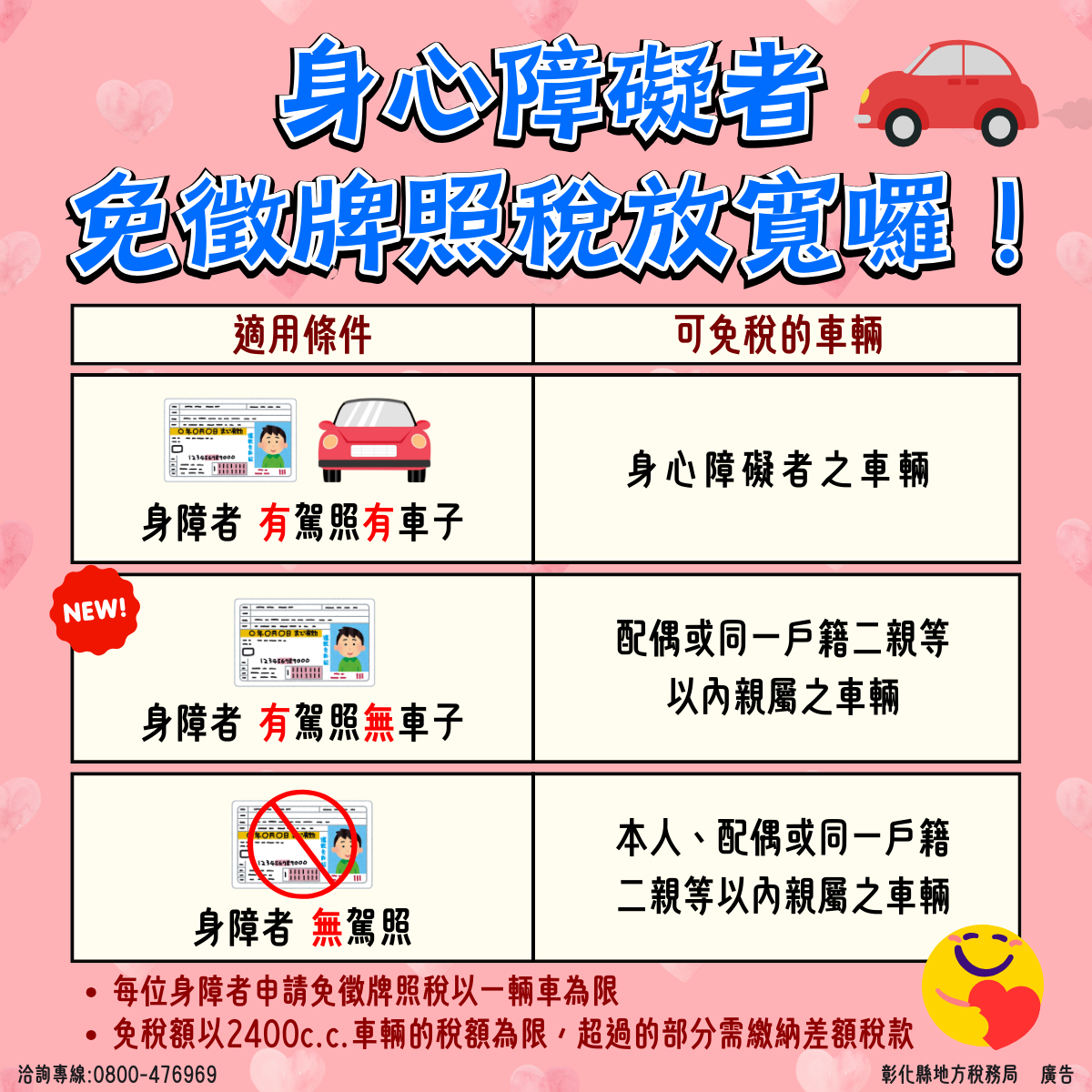 彰化縣地方稅務局表示,自114年1月17日起,財政部核釋放寬領有駕駛執照之身心障礙者名下如無車輛,可以其配偶或同一戶籍二親等以內親屬所有車輛,申請免徵使用牌照稅,每一身障者以1輛為限。 稅務局說明,以往有駕照的身心障礙者只能以自己名下車輛申請免徵使用牌照稅,無車輛者則無免稅適用。財政部考量領有駕照身心障礙者可能因個人、家庭或其他因素,未以本人名義購買車輛,而由共同生活家人名下車輛供身心障礙者使用,為使身心障礙免稅規定更臻合理,落實身心障礙者權利保障,於本(114)年1月17日起,有駕照無車輛身心障礙者,得比照無駕照身心障礙者,以其配偶或同一戶籍二親等以內親屬所有供該身障者使用之車輛,申請免徵使用牌照稅,每一身障者以1輛為限。 稅務局提醒車主,車輛免徵金額仍以汽缸總排氣量2,400cc級距稅額(以自用小客車為例,為新臺幣1萬1,230元)為限。如符合規定,請儘速提出申請,可自申請日起免稅,以維護自身權益。 民眾如有使用牌照稅疑問,可撥打稅務局免費服務電話0800-476969或7239131轉162-169、177洽詢。