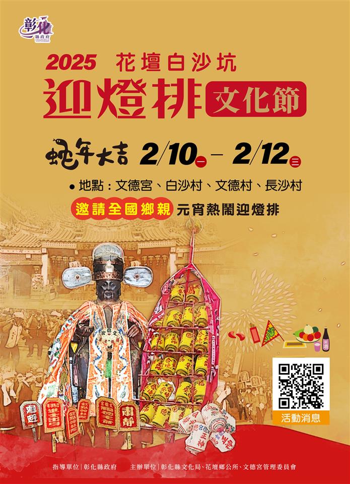 擁有全國最悠久歷史的元宵節盛事「白沙坑迎燈排」,將於2月10日至12日(元宵節)在花壇鄉文德宮熱鬧登場,今(2/5)日上午在文德宮舉辦活動宣傳記者會,彰化縣長王惠美、花壇鄉長顧勝敏、文德宮主委李錫圭等人共同邀請全國鄉親來體驗全國獨一無二的迎燈排民俗活動,共享元宵文化之美。王縣長表示,一年一度的白沙坑迎燈排活動,是全國最具文化特色的傳統燈會,自民國97年登錄公告為彰化重要無形文化資產,至今已經傳承197年,元宵節北天燈、南蜂炮、中迎燈排,文德宮供奉福德老爺是全國唯一頭戴官帽的土地公,神尊已有三百多年歷史,非常感謝花壇鄉長顧勝敏用心協助籌劃活動,感謝花壇鄉白沙坑文德宮主委帶領團隊用心執行,期望藉由福德老爺繞境賜福給廣大信眾,保佑合境健康平安。有人說,「拜土地公,身體很健康,拜福德老爺,大家會很「好額(有錢)」,歡迎大家還可以來祈求功名、步步高升,升官發財特別靈驗,香火十分鼎盛,傳說是開台翰林曾維禎,道光八年時,隨皇帝賞花燈,曾翰林見景傷情,感到家鄉父老無福欣賞,希望辭官還鄉,道光皇帝嘉慰其孝行,特賜在花壇鄉白沙坑,每年元宵節均仿照京城「迎花燈」與鄉民同歡。 王縣長表示,今年一連三天2月10日至12日活動精采,系列活動還包括「明世界掌中藝術團」、「梨芳園北管樂團演出」、「擲筊祈求招財金」、「蛇年小提燈發放」、「Q版老爺公仔請回家」、「創意燈排比賽」、「闖關遊戲」、「平安御守DIY」、「舉燈排體驗」、「活動才藝SHOW」、「迎燈排繞境」、「美食來結緣」、「十二生肖花燈展示」等。其中,「擲筊祈求招財金」將於2月11、12日,每日上午10時至11時、下午2時30分至4時整,讓民眾擲筊祈求;「蛇年小提燈發放」將於2月10日下午6時起、2月11、12日上午10時30分起,下午6時起,每場次限量400份,送完為止,請民眾把握時間,另外,2月11日有文德宮舉辦的「喜慶元宵摸彩晚會」、12日元宵當天還有花壇鄉公所舉辦的「白沙坑迎燈排慶元宵晚會」,歡迎大家來慶元宵。 王縣長指出,今年縣府與地方旅行社合作,特別推出長青卡旅遊行程,鼓勵65歲以上長輩可以利用機會來花壇走走逛逛、拜土地公,讓長輩不僅能觀光又能夠體驗到百年傳承的文化慶典。此外,大年初一至十五,溪州公園有「花在彰化」,八卦山有「月影燈季」,在2月8日及2月14日,還有第3波及第4波的小提燈發放,在員林市還有辦理「員林燈會」,都歡迎大家一起來參與。 花壇鄉長顧勝敏表示,感謝王惠美縣長縣府團隊對花壇鄉的建設及活動的支持,才能讓每年的迎燈排活動一年比一年精彩,也適逢過年前東彰浪漫台三線通車,如同王縣長所說,30分鐘生活圈,實現交通便利,從台中、南投來到花壇大幅縮短交通時間只要約30分鐘就可以到達,好玩又不用趕,一連三天活動精采可期,歡迎大家來慢遊花壇。 文德宮主委李錫圭表示,感謝王惠美縣長縣府團隊的支持及協助辦理迎燈排活動,也感謝縣議員、花壇鄉公所、代表會、各級民代與地方仕紳的支持,文德宮之所以香火越來越興旺都是靠大家的支持與幫忙,非常感謝大家。 文化局表示,每年彰化花壇白沙坑民眾都會舉辦燈排繞境,此項富有歷史意義的民俗活動,今年將於2月12日晚上6時30分進行點燈儀式,邀請長官及地方仕紳點燈,舉燈排參拜及扶轎福德老爺出巡。迎燈排小旅行今年特別推出長青卡行程,於2月10、11、12日活動期間,有彰化旅行社及喬國旅行社等推出「花在彰化、花壇文德宮求錢母」一日遊行程,報名贈送限量旅行包或麻布袋(2擇1隨機贈送),文德宮加碼提供Q版老爺公仔及10枚紀念幣供遊客參與擲筊活動。報名請洽彰化旅行社電話04-7221277,喬國旅行社電話04-7321421。歡迎鄉親朋友們,相揪鬥陣來彰化,一起拜福德老爺,庇佑全家平安健康、財源廣進、金榜題名。 與會貴賓有縣議員顧黃水花、李成濟、許雅琳、莊陞漢、立委黃秀芳服務團隊、議員陳銌銌服務團隊、議員楊子賢服務團隊、花壇鄉長顧勝敏、彰化市長林世賢、花壇鄉民代表會主席沈文盛、文德宮主委李錫圭、總幹事陳榮昌、彰化縣文化局長張雀芬、縣府新聞處長李俊德、秘書黃智裕、彰化縣警察局彰化分局副分局長鍾振邦、各級民意代表與地方仕紳。
