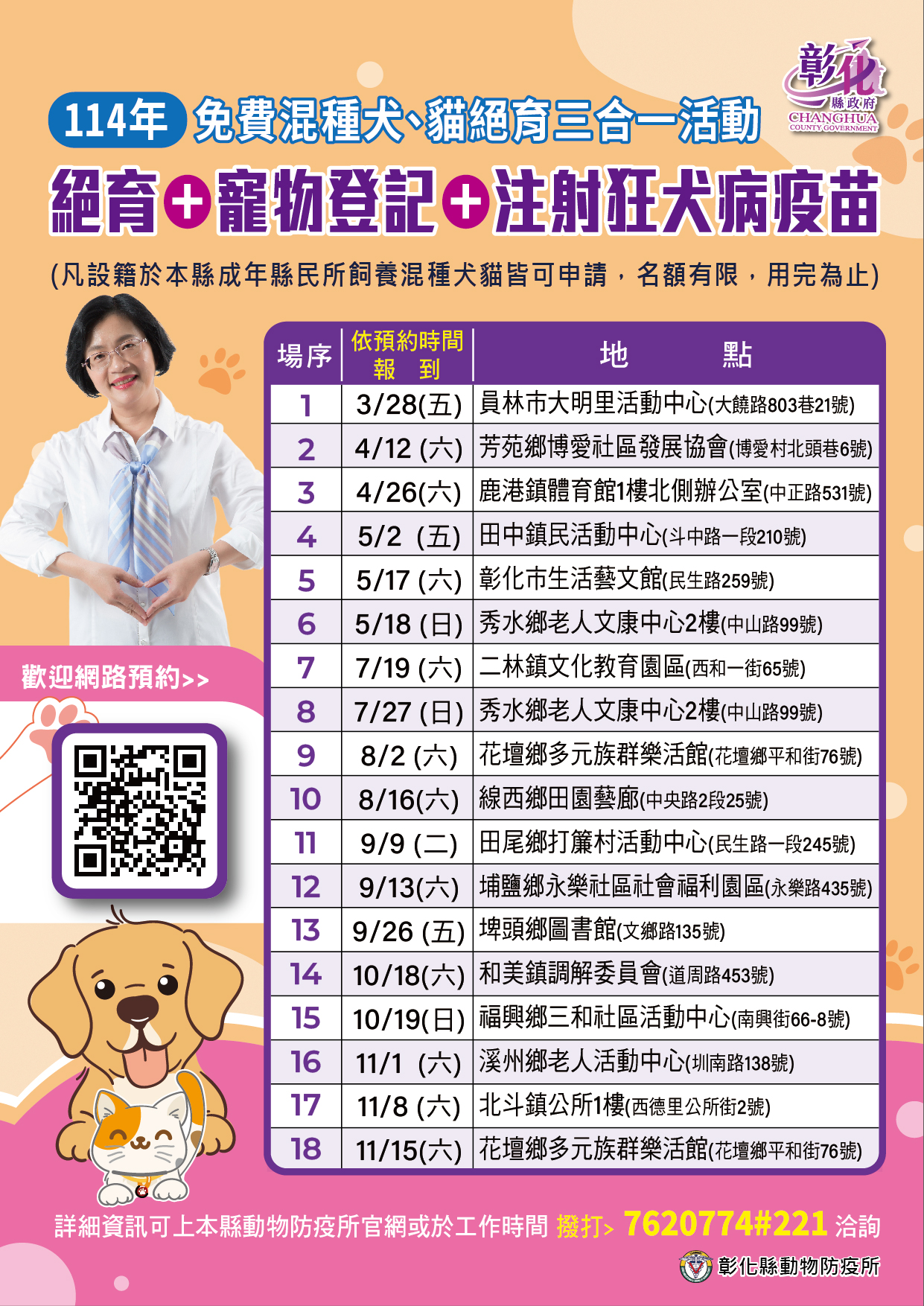 本縣動物防疫所為全面推動寵物絕育,進行犬貓源頭管理,減少流浪動物產生,持續推動本縣下鄉巡迴免費混種犬貓絕育、寵物登記及狂犬病疫苗注射三合一工作,期能降低流浪犬貓數量。今年目前預訂舉辦18場。凡設籍於本縣並年滿18歲縣民所飼養之混種犬貓或於本縣流浪狗中途之家認養之犬貓(持有絕育券)皆可報名申請。本計畫係委託天恩雅動物醫院、新長庚動物醫院及永勤動物醫院辦理,報名採網路預約,網址為https://forms.gle/YgXPhMWpwZz8HASa7 ,歡迎踴躍報名參加,名額用完為止。 請參加活動之縣民保持聯絡電話暢通或注意彰化縣動物防疫所網站公布最新消息,活動當日飼主報到填妥資料後即可先行離開,待寵物絕育三合一工作完成後,工作人員會以電話通知飼主再至活動現場帶回寵物即可,詳細活動資訊可上動物防疫所官網(https://www.chcgadcc.gov.tw/),或電話04-7620774#221洽詢。