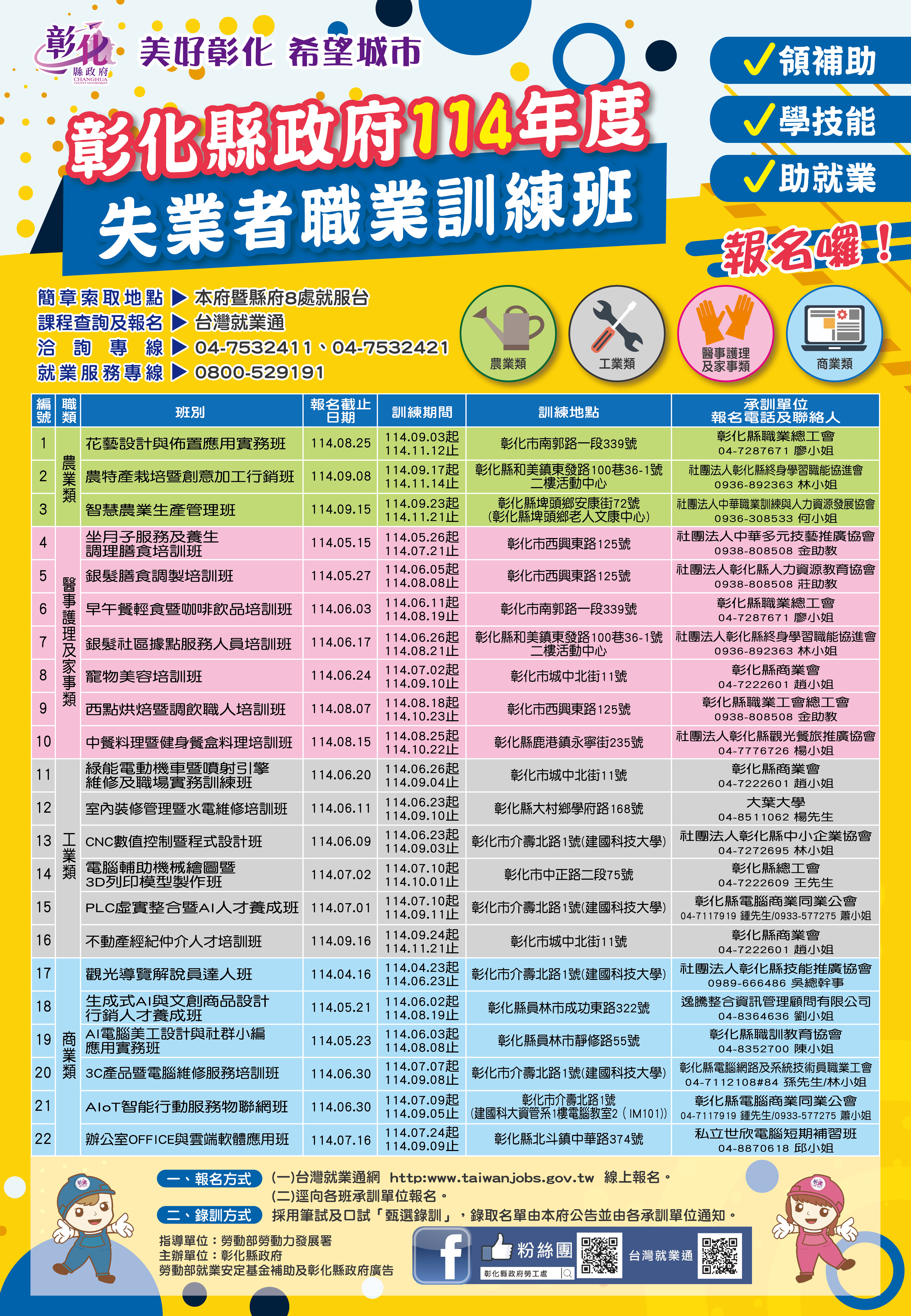 為協助縣內勞工培訓技能、輔導就業及考取相關證照,彰化縣政府今年度將辦理22班失業者職業訓練班,課程種類多元,包含生成式AI應用、AIoT物聯網、文創商品設計、社群小編應用、雲端軟體應用、花藝佈展、農特產加工、智慧農業、坐月子服務、西點烘焙、飲品調製、中餐暨健身餐盒料理、銀髮膳食調製及據點服務、寵物美容、室內裝修暨水電維修、3D列印、綠能電動機車維修、CNC操作、3C產品暨電腦維修、不動產經紀人培訓及觀光導覽等,自即日起開放民眾報名。訓練課程除培訓學員學習專業技能,亦輔導學員取得相關證照,及協助訓後就業媒合。 本府今年將在大型就業博覽會辦理「職訓借問站」活動,4場次分別在彰化縣各生活區, 5月24日在鹿港高中、7月19日在北斗國中、8月23日在和美實驗學校、9月27日在二林文化教育園區等地辦理,展示職前訓練資訊並提供即時諮詢。民眾報名參加縣府職前訓練,如符合法定各類參訓者資格,檢附所規定的證明文件,即可以免費參加,由政府補助全額費用,若為一般失業者,政府亦補助百分之八十訓練費用,另為照顧弱勢民眾,安心受訓,縣府亦協助特定身分民眾申請職訓生活津貼,以安定訓練期間的生活。 另為了協助縣內失業勞工再就業,並協助勞工求職、轉職及企業徵才,縣府今年度除辦理大型就業博覽會外,另辦理2百多場小型及單一徵才活動,積極協助勞工及雇主能夠順利就業及找到好人才。又為協助民眾就創業,陸續開辦免費創業研習課程,包括百工百業、文創啟航就創業研習、女力展翅就創業促進課程等,邀請各領域實務界講師指導應具備的創業技能與行銷技巧,歡迎有興趣的民眾踴躍參加。 相關職業訓練課程、創業獎勵補助及徵才訊息,可至縣府所設立的8處就業服務台洽詢,或撥打免付費就創業服務專線0800-529191(我愛就業就業)、或至彰化縣政府勞工處網站、勞工處臉書粉絲團、台灣就業通網站、彰化就業通平台查詢。 彰化縣政府勞工處網站(https://labor.chcg.gov.tw ) 勞工處臉書粉絲團(https://www.facebook.com/labor.chcg/) 台灣就業通網站 (http://www.taiwanjobs.gov.tw) 彰化就業通平台(https://job.chcg.gov.tw/)