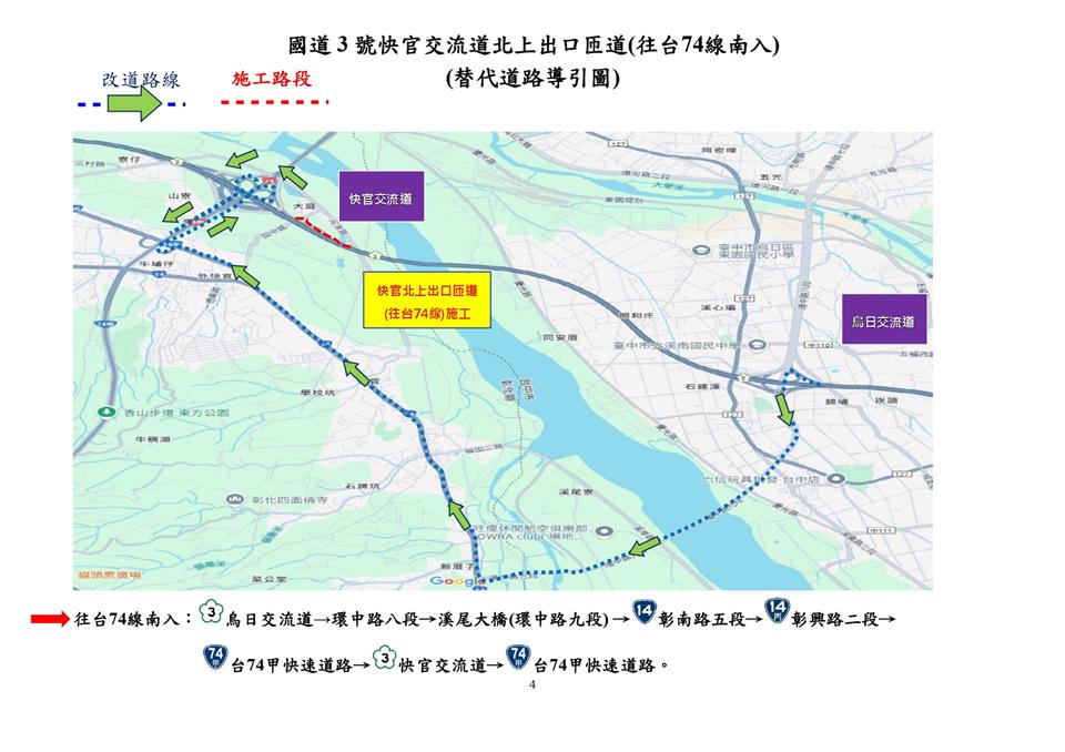 一、為維護國道行車安全,高速公路局中區養護工程分局採分車道封閉方式,針對國道3號快官交流道北上出口匝道(往台74線)進行伸縮縫更換,倘提早完成,將隨即開放通車,施工時段及位置如下: (一)114年5月12日(星期一)9時至5月14日(星期三)12時封閉國道3號快官交流道北上出口匝道(往台74線)內側車道施工。 (二)114年5月14日(星期三)12時至5月16日(星期五)12時封閉國道3號快官交流道北上出口匝道(往台74線)外側車道施工。 二、施工期間行經該路段用路人,可利用下列改道路線,避開壅塞路段。 1.欲利用國道3號快官交流道北上出口匝道往台74線北上入口匝道(台中方向)之用路人,請於 烏日交流道北上出口駛離→左轉(往霧峰方向)進入環中路八段→溪尾大橋(環中路九段)→向右轉進入 彰南路五段→ 彰興路二段→向左轉進入 台74甲快速道路接續往北行駛。 2.欲利用國道3號快官交流道南下出口匝道往台74線南下入口匝道(彰化方向)之用路人,請於 烏日交流道北上出口駛離→左轉(往霧峰方向)進入環中路八段→溪尾大橋(環中路九段)→向右轉進入 彰南路五段→ 彰興路二段→向左轉進入 台74甲快速道路→於 快官交流道往(和美)方向前進→上交流道前右轉銜接 台74甲快速道路接續往南行駛。 三、行經前述交通管制區域減速慢行,請用路人依既有指示牌面及施工單位所設導引牌面行駛,並請遵守管制人員導引,以確保行車安全,造成不便,尚請見諒與配合。 四、請用路人隨時注意本路段資訊可變標誌顯示訊息,亦可撥打1968(路況查詢專線)及收聽警察廣播電台,或上高速公路局全球資訊網www.freeway.gov.tw以瞭解最新施工路況。 五、聯絡方式: 施工單位:蘭陽營造有限公司 工地負責人:洪瑞敏 電話/行動電話:0935-205598 監造單位:昇鍠工程顧問股份有限公司 監造經理:謝明哲 電話/行動電話:0931-118673 督工單位:高速公路局中區養護工程分局斗南工務段 段長:馬信宏 電話/行動電話:0933-558973