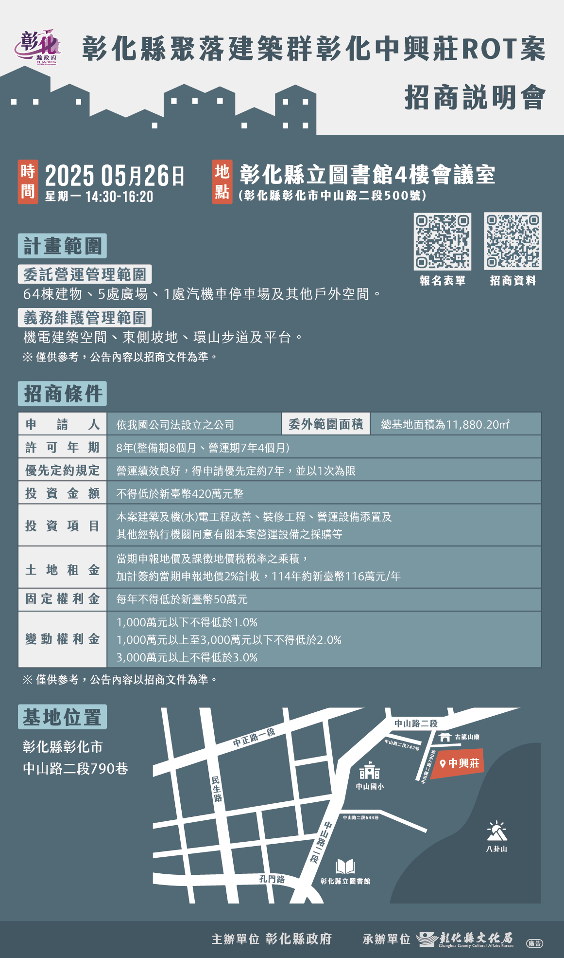 彰化縣聚落建築群彰化中興莊ROT案,已完成可行性評估及先期規劃,進入招商階段,彰化縣文化局訂於114年5月26日(星期一)下午2時30分,於彰化縣立圖書館4樓會議室舉辦「彰化縣聚落建築群彰化中興莊ROT案」招商說明會,歡迎有興趣投資人或關心本案人士踴躍參加。 彰化中興莊是國防部選定全國13處眷村文化保存園區之一,深具歷史特殊性及軍眷生活空間文化價值。彰化縣政府深知中興莊之歷史與文化意義,自108年起力推文化資產之保存工作,竭誠促進跨機關協調與合作,經多方努力,完成文化保存業務,更啟動眷村保存計畫、戮力完成國有土地撥用。民國110年將其類別調整為「聚落建築群」,使其保存與再利用能更有彈性,並進行「再現彰化眷村味中興莊再造歷史現場:彰化縣聚落建築群彰化中興莊修復工程」,目前工程進度已達80%,完成建築結構修復及空間整備,為後續活化運用奠定堅實基礎。 彰化縣文化局表示,中興莊與一般國軍制式眷村有所不同,全村眷戶格局相同,精實克難無官階區分,每戶都肩負著艱苦與堅韌的精神,不僅見證歷史的變遷,亦在此扎根、繁衍生息。基地座落於彰化市區重要的文教設施帶,鄰近八卦山大佛風景區、中山國小、彰化藝術館、彰化圖書館、1895抗日保台史蹟館、彰化美術館、彰化武德殿、節孝祠、彰化孔廟等,具備串聯文化廊帶之優勢條件,且規劃為多功能複合式園區,具高度再利用及發展潛力。 本案以ROT(改建-營運-移轉)模式辦理,依《促參法》公告徵求民間參與,期望引進專業經營團隊,活化場域空間,同時維護文化價值,兼顧永續營運。規劃項目涵蓋: B-2類:供商品批發、展售或商業交易之場所 B-3類:供不特定人餐飲,且直接使用燃具之場所 B-4類:供不特定人士休息住宿之場所 D-2類:供參觀、閱覽、會議之場所 未來園區將提供展演、餐飲、旅宿、零售等多元空間,打造結合文化體驗與生活機能的創新場域。透過引進文創品牌、特色餐飲、在地設計師、青年旅宿與藝文團體等不同業態與人才進駐,不僅提升場域活力,更將帶動整體文化園區發展,形塑富有地方特色與國際觀的文化聚落。本案營運期程(含裝修)共計8年,營運期間將定期評估經營績效。若評鑑結果達「良好」等級,且符合優先定約條件,得於原契約期滿前申請續約一次,續約期間最長為7年。此機制有助於穩定經營權益,提升投資意願,同時確保園區永續發展與文化價值維持並進。 彰化縣文化局誠摯邀請各界踴躍參與本次招商說明會,共同投入這項結合歷史、文化與創新的再生計畫,為中興莊注入新生命,開創地方發展新契機。若有興趣參加,可預先於線上填寫報名表單:https://forms.gle/XSyc5g9uSnYxCaqe6。或洽詢彰化縣文化局,聯絡人王先生,電話:04-7250057分機1861。報名時間:即日起至114年5月22日(四)下午5點止,歡迎踴躍報名。