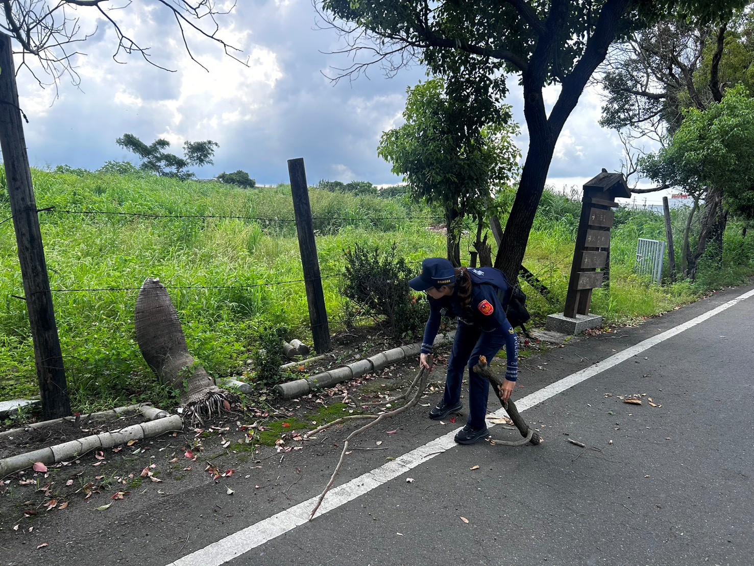 疑似病蟲害導致路樹有部分枯萎,加上瞬間強風不堪負荷而折斷掉落路面影響行車安全,員警路過發現場協助將其清除恢復道路通行,備受路過駕駛及附近住家民眾讚許。 鹿港分局秀安派出所警員陳柳蓁、郭珈羽,日前執行轄區巡邏勤務時,於15時15分許行經秀水鄉陝西村番花路附近,有路樹樹枝折斷掉落路面阻擋道路通行,陳、郭等2員路過時發現前路車輛怎會都突然打方向燈繞行而過,心中存有疑惑,直至抵達現場時才看清楚狀況,原來車道上有掉落樹枝擋道,便立即下車徒手將掉落樹枝移置路旁,並擺設交通錐警示,使現場交通暫時恢復順暢,並通知相關單位前來善後,路過車主及附近民眾見員警捲袖清除的舉動感到相當窩心,頻頻感謝警方的幫忙,讓用路人能安心使用道路。 本案警員陳柳蓁、郭珈羽處理事故態度積極、敏覺性、能及時給予關懷及協助,發揮同理心精神,能感同身受民眾焦急心態,並善用溝通技巧使民眾情緒恢復平穩,民眾對警方作為表達高度肯定與感謝,充分提升警察的正面形象。