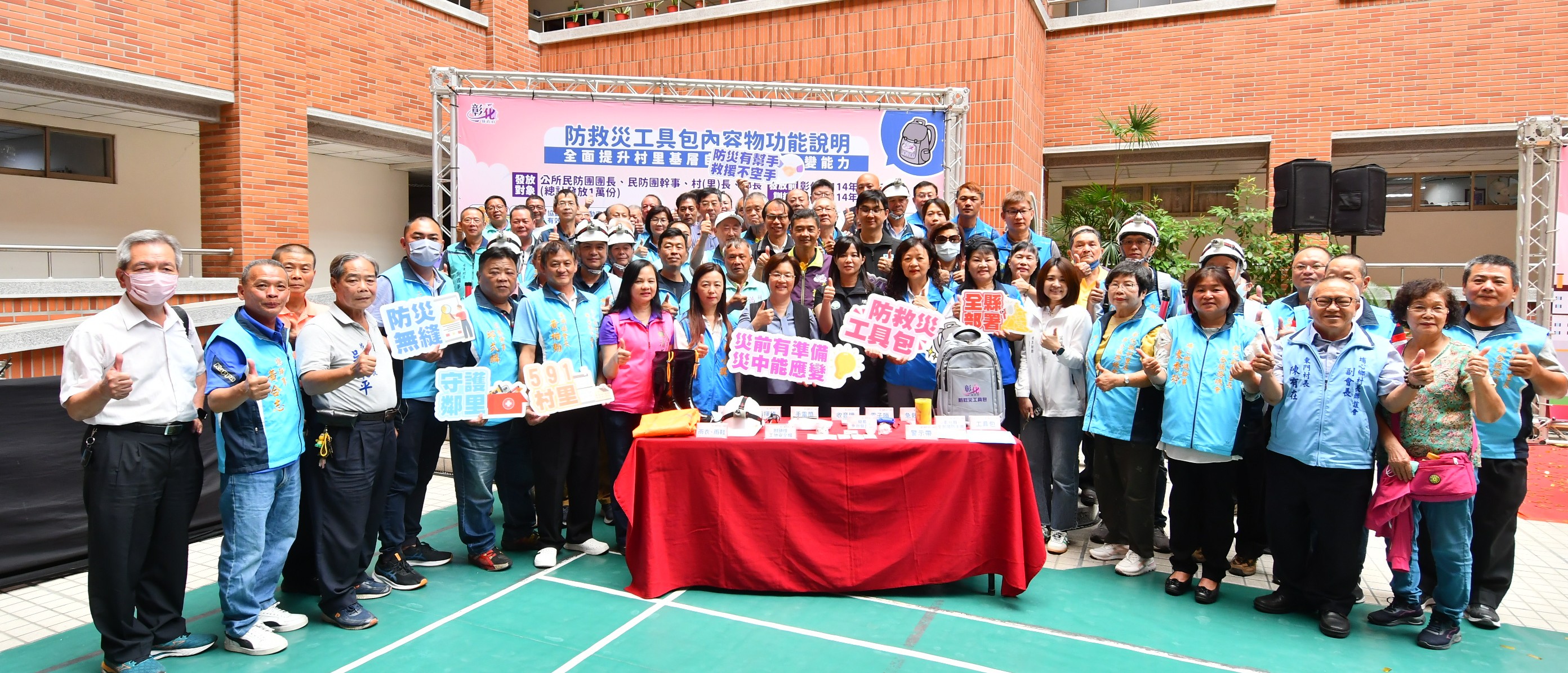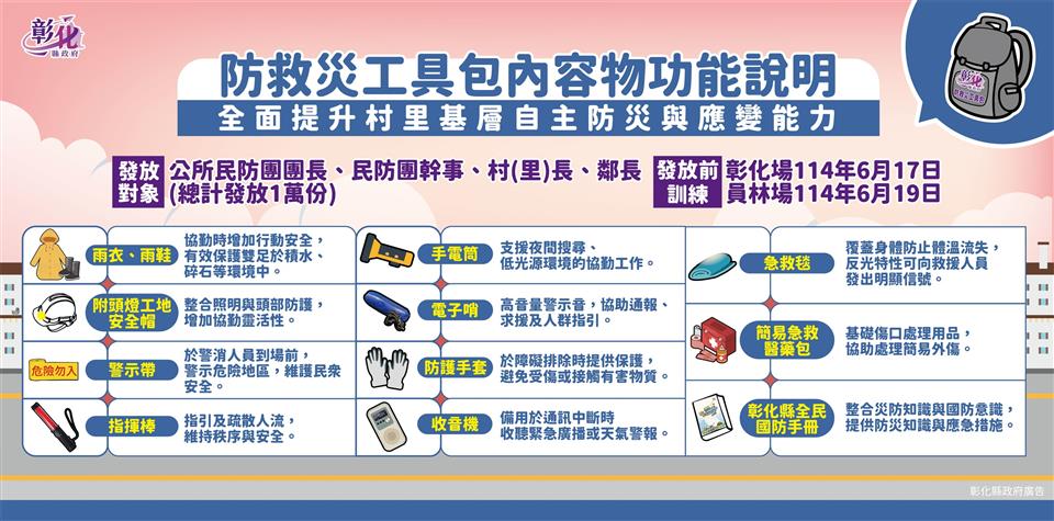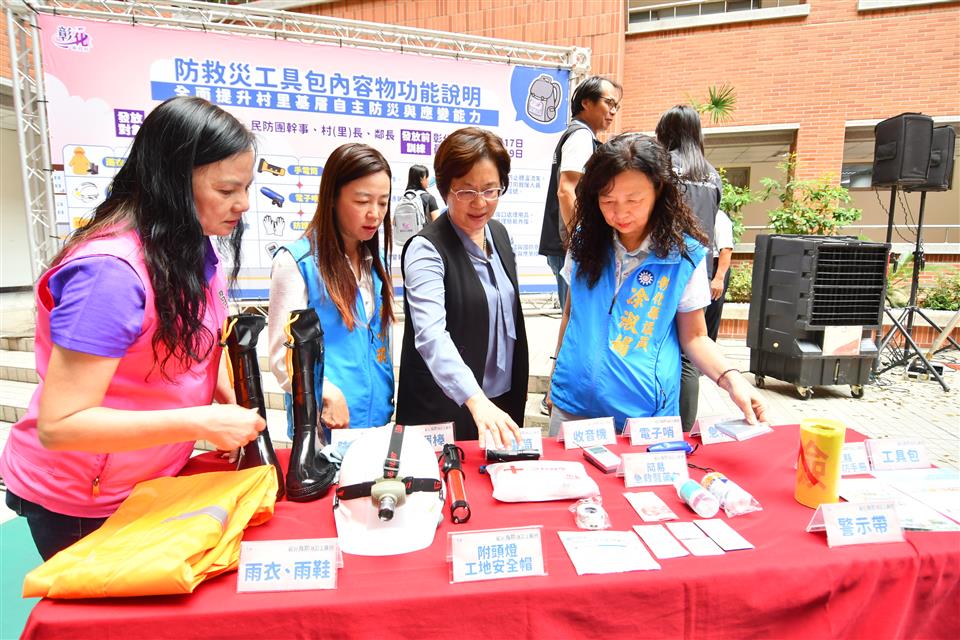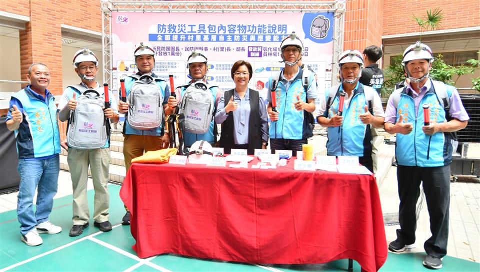 為強化基層防災與緊急應變能力,彰化縣政府今(27)日上午在彰化縣警察局中庭舉辦「彰化縣防救災工具包發放記者會」,彰化縣長王惠美等人與會,將防救災工具包發放給村(里)長、鄰長、公所民防團團長及民防團幹事等重要基層防災人員,希望能藉此提升災害發生時的即時應變與避災能力。王縣長表示,感謝謝典林議長及所有議員的支持,編列預算1,500萬元,購置實用的支援裝備,這次配發的防救災工具包內含雨衣、雨鞋、附頭燈安全帽、指揮棒、防護手套、手電筒、電子哨、警示帶、簡易急救醫藥包、收音機、急救毯及全民國防手冊等物品,兼顧避災、防護、照明、指揮等多項功能,總共1萬份,將配送到各公所指定地點,由公所協助發放。 王縣長表示,隨著極端氣候加劇,颱風和地震對地方的威脅也日益增加,為了確保鄉親的生命安全,必須在第一時間掌握災情並迅速應變,特別感謝所有長期堅守在第一線的基層防救災人員,正是他們的辛勞與付出,讓災害損失降到最低,這次配發的防救災工具包,將提供第一線夥伴基本保護與應變工具,縣府也在六月份舉辦了兩場教育訓練,提升基層人員的防災應變能力,期望透過教育訓練及提供實用的防救災工具包,進一步提升基層防災應變能量,守護鄉親的安全,實現「災前充分準備、災中有效應對、災後迅速恢復」的目標。 王縣長指出,縣府非常重視防災工作,今年下半年度,消防局將繼續輔導溪州等9個鄉鎮公所,進行避難收容處所暨防災協作中心演練;警察局也將於7、8月規劃辦理全縣26鄉鎮市的民防團進行常年訓練;消防局也將於10、11月辦理一系列防災教育日活動,透過這些演練與教育宣導,強化各機關的應變能力,並提升民眾的防災意識,讓彰化的防災工作更完善、更進步。 與會貴賓有縣議員凃淑媚、陳玉姬、賴清美、黃千宴、吳韋達、林小琪、蕭文雄、埔鹽鄉長許文萍、縣府民政處長劉玉平、彰化縣消防局長施順仁、各鄉鎮市公所代表、各村里長代表、各級民代、地方仕紳等人。