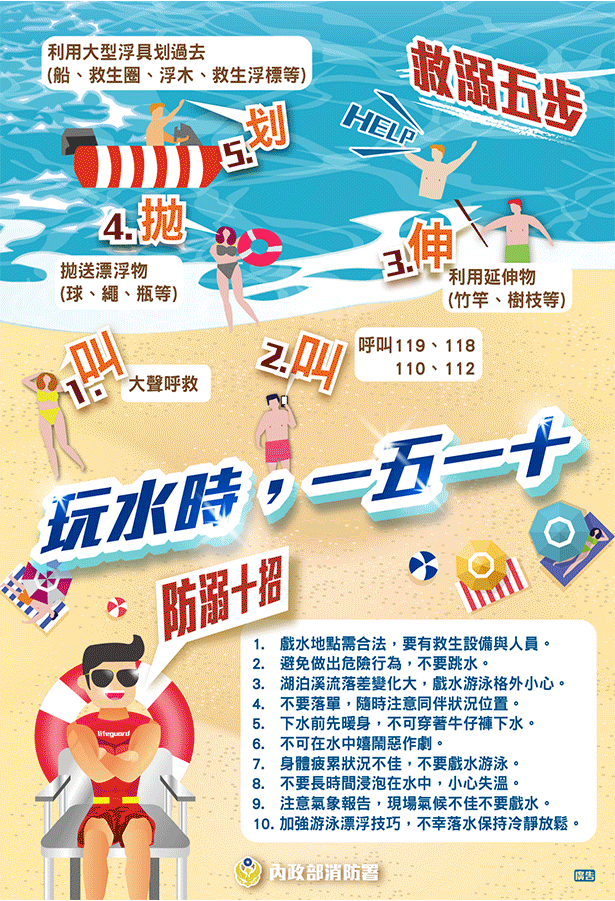 時序已進入夏季,戲水人潮漸增,彰化縣消防局統計近3年水域救援案件,111年至113年每年約平均發生12件,其中以失足不慎溺水佔多數,另彰化縣沿海地區多有沙洲灘地等地形的水域,民眾喜好前往挖文蛤或岸邊踏浪,因不諳潮汐而造成沙洲受困亦不在少數,彰化縣消防局呼籲民眾,戲水場所要慎選,切勿到無人管理或設有禁止戲水告示牌的水域,以免發生危險。 彰化縣消防局指出,彰化縣內較容易發生溺水事故或因潮汐受困地點包括:貓羅溪、烏溪、濁水溪、八堡圳、伸港什股海域、鹿港彰濱海域,線西肉粽角海域等七大水域,這些地點由於水流湍急、地形複雜、潮汐變化快速,均為溺水事故的好發地點,彰化縣消防局呼籲民眾減少前往這些危險水域,戲水應選擇設有救生員駐守、具有救生設備、經主管機關核准的合法安全水域,才是真正聰明又安心的選擇。 除了選對地點,事前的防溺觀念與急難處置知識更是關鍵,彰化縣消防局提醒民眾牢記「防溺十招」與「救溺五步」: 防溺十招包括: 一、 出門前先看氣象預報,天候不佳就應改變目的地。 二、 選擇合法戲水地點,現場要有救生設備與人員。 三、 下水前先暖身,不可穿著牛仔褲下水。 四、 衡量自己的身體狀況,如感到疲累就不應下水。 五、 湖泊溪流的地形落差較大,玩水時需格外小心。 六、 不落單、隨時注意同伴狀況位置。 七、 不可在水中嬉鬧、惡作劇。 八、 避免做出危險行為、不要跳水。 九、 不長時間泡在水中避免失溫。 十、 加強仰漂、水母漂等漂浮技巧,不幸落水保持冷靜放鬆。 救溺五步則是看到有人溺水時,需把握的「岸上救援」原則,口訣是簡單易記的「叫-叫-伸-拋-划」五字訣: 叫:大聲呼救。 叫:呼叫119(打電話)。 伸:利用竹竿、樹枝等延伸物將溺者拉上岸。 拋:拋送漂浮物(如浮筒、球、救生圈等)給溺者。 划:划大型浮具(船艇)救援。 炎炎夏日雖是戲水消暑好時機,但快樂戲水的同時,安全永遠擺在第一位。彰化縣消防局再次提醒民眾,選擇合法水域、掌握防溺知識、尊重自然水域的危險性,就是守護自己與家人最重要的一步,讓我們一同用行動落實「安全戲水、平安回家」的目標!