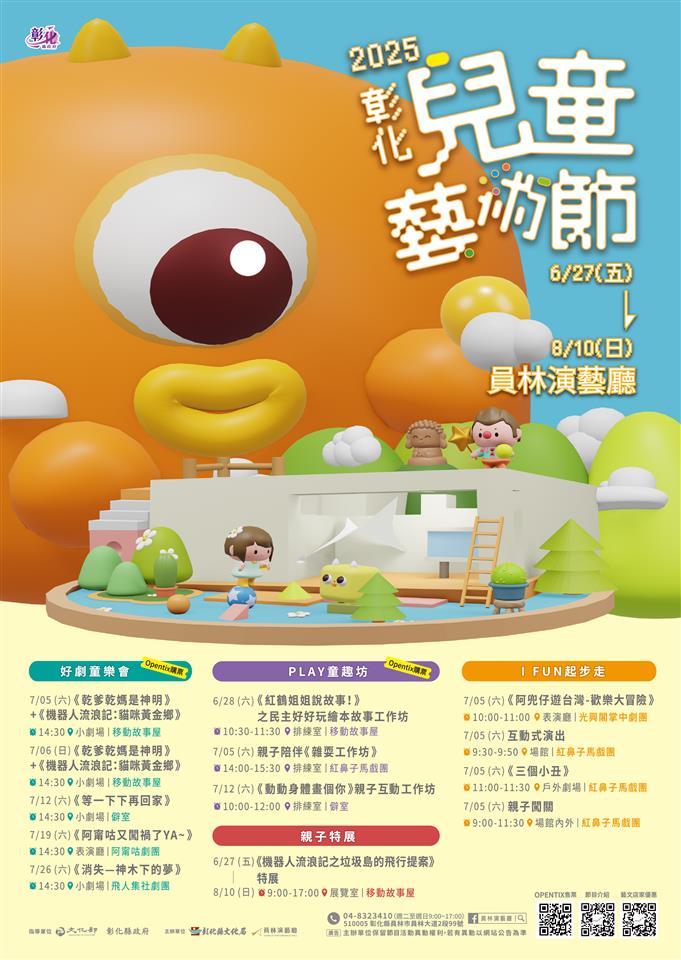 很多爸媽及親子敲碗的彰化兒童藝術節今(7/5)日上午開幕活動「I FUN起步走」在員林演藝廳熱鬧登場,現場結合精彩的小丑馬戲雜耍演出、好笑又好玩的掌中戲、親子AR特展,以及親子闖關、消防局翻轉夏令營闖關等,為「2025彰化兒童藝術節」相關活動拉開序幕,縣長王惠美歡迎全國各地大朋友、小朋友在8月10日前來員林演藝廳欣賞演出、體驗工作坊,感受表演藝術的多元美好,共同用藝術點亮夏日生活。 王縣長表示,「2025彰化兒童藝術節」今年有四大亮點,第一是有「紅鼻子馬戲團」帶來免費好看又精湛技藝的馬戲雜耍表演,表演廳內則有「光興閣掌中戲」上演好笑又好玩的布袋戲,帶您感受傳統藝術的魅力。第二有規劃「親子馬戲闖關」和「消防局翻轉夏令營闖關」,只要闖過5關,就能獲得精美小禮物。第三是展覽室的「《機器人飛行提案》特展」結合冒險故事與AR技術,透過手機或平板體驗一場科技與藝術交織的奇幻之旅,今年還受邀至大阪做相關表演,非常值得一試!第四是在今日上午11點半前,到員林演藝廳服務台現場購票滿額400元,即可試手氣抽大禮。 王縣長指出,今年活動除了今天的開幕活動以外,還有國內6大優質團隊帶來6檔,包括移動故事屋、僻室、阿甯咕劇團、飛人集社劇團、紅鼻子馬戲團及光興閣掌中劇團等帶來精彩劇場演出,還有3檔親子故事工作坊及1場AR特展,內容精采可期。 王縣長指出,另今日下午在白色海豚屋(自然生態教育中心)還有舉辦「海FUN一夏」慶安水樂園的開幕活動,現場有SUP、獨木舟、水上自行車等水上活動,10月10日至10月26日有台灣設計展,屆時歡迎大家一同共襄盛舉,一起感受設計的魅力,了解彰化更深層的文化底蘊。 文化局表示,兒童藝術節期間有4檔「好劇童樂會」精彩節目在員林演藝廳售票演出,分別有7/5(六)至7/6(日)移動故事屋以體感聲光特效,透過180度環形動畫、說書人互動演繹共創沉浸式互動體感親子劇場,一場次帶來兩個作品《乾爹乾媽是神明》及《機器人流浪記:貓咪黃金鄉》;7/12(六)僻室《等一下下再回家》藉由真實孩童的視角,讓觀眾跟著主角小寶一同踏上一場關於勇氣與成長的心靈旅程;7/19(六)阿甯咕劇團《阿甯咕又闖禍了YA》藉由「能闖禍的孩子就有超能力」為創作核心,傳達相信孩子、支持探索的重要價值;7/26(六) 飛人集社劇團《消失—神木下的夢》故事講述一對姊弟在尋找媽媽的過程中,展開一場奇幻的旅程,途中發現關於人生、親情的深刻寓意,適合親子共同觀賞與思考。 另配合演出規劃「PLAY童趣坊」,分別有7/5(六) 親子陪伴《雜耍工作坊》以及7/12(六)《動動身體畫個你》親子互動工作坊,讓大小親子觀眾與演出團隊有更多互動機會,有興趣的親子民眾可至「兩廳院文化生活售票系統」購票。憑2025彰化兒童藝術節票券至藝文店家消費即享有一票雙享優惠及折扣,邀請全國鄉親7月至8月週末來趟員林輕旅行,遊員林、看好戲、樂悠活。 與會貴賓還有縣議員張錦昆、劉惠娟、凃俊任、員林市代理市長賴致富、溪湖鎮民代表會副主席黃佳惠、縣府秘書游筑凱、彰化縣文化局長張雀芬、彰化縣消防局第二大隊大隊長葉明波、防火宣傳大隊長葉慧君、各級民意代表與地方仕紳等。 購票請上OPENTIX兩廳院文化生活售票系統https://pse.is/7caulc或洽員林演藝廳活動網頁https://gov.tw/CDR。