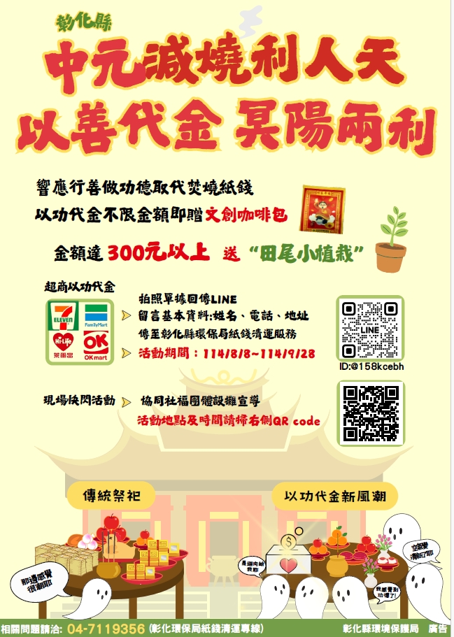 農曆7月將至,彰化縣長王惠美縣府團隊為推動中元普度環保轉型,今(114)年彰化縣環保局續推中元節以行善做功德替代焚燒紙錢,凡於8月8日起至9月28日期間前往四大超商以功代金捐款並指定「彰化縣」社福團體,即可憑超商捐款收據,上傳至彰化環保局紙錢清運Line帳號(ID:@158kcebh),兌換環保局向社福團體訂製的「文創咖啡包」1包,另單筆捐款金額達300元(含)以上,即可贈送田尾鄉植物小盆栽1份,敬邀民眾踴躍參與,一同守護環境、挺公益、支持在地農產品。 環保局表示,自112年首度於中元節推動以功代金捐款送咖啡活動,113年持續推動贈送埔鹽順澤宮冠軍帽,彰化縣113年捐款總額超過21萬元,相較112年的14萬元,成長5成。今年再創新結合在地「花的故鄉」田尾小盆栽,精選兼具觀賞與實用功能的小盆栽,不僅為空間增添綠意,更兼具淨化空氣、調節微氣候的功效,這些植栽能有效釋放有益健康的負離子,具維持環境穩定性與舒適度,為日常生活注入滿滿正能量。 為提升「以功代金」的推廣力道,環保局今年持續攜手慈善社福團體舉辦實體快閃活動,活動將於8月8日、8月24日、9月13日及9月21日舉辦,詳細活動地點及時間可掃瞄環保局廣告文宣QR code查詢。現場協同社福團體聯合擺攤,透過面對面互動方式,鼓勵民眾將原本購買紙錢的費用轉為捐款行善,提供民眾近距離了解「以善代金、冥陽兩利」的環保祭祀方式,並可直接參與捐款活動,兌換咖啡包與田尾小盆栽,落實環保與地方創生雙重價值。 「紙錢集中清運服務」可洽各鄉鎮市公所清潔隊、撥打環保局紙錢集中清運專線04-7119356,或是加入環保局Line線上紙錢清運帳號(ID:@158kcebh)進行預約,並請於清運前5日完成預約登記,預約時間為週一至週五8:00~17:00。為讓民眾安心響應紙錢集中焚燒,環保局訂於114年8月14日邀請專業法師至溪州焚化廠舉辦「中元節淨爐科儀」,以莊嚴的祈福儀式確保紙錢焚燒符合傳統禮俗,並兼顧環境保護。 環保局鼓勵民眾一起加入紙錢新三燒「集中燒」、「適量燒」及「替代燒」,除可挹注善款幫助弱勢團體,更可達成回饋社會及改善空氣品質之雙贏目標,同時讓祭祀的敬意不減。