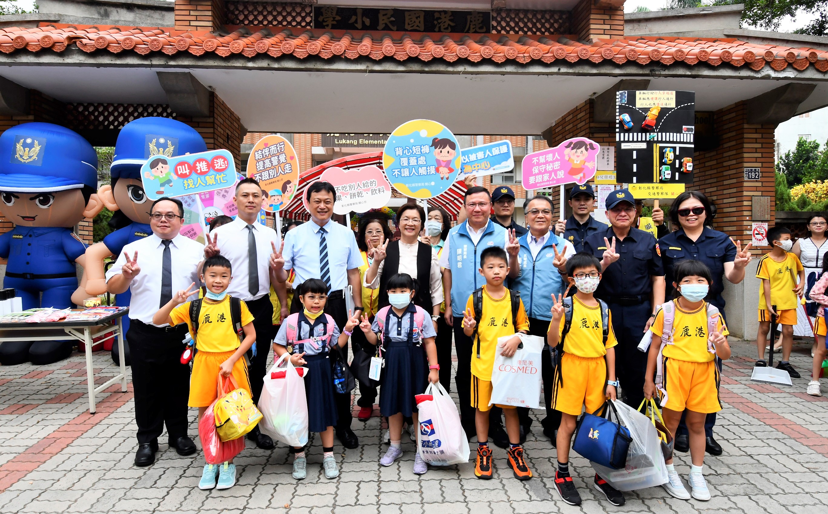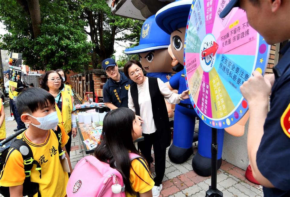 今(114)年9月1日為國小開學日,為維護學童上、放學安全,彰化縣警察局全面開始執行「護童專案」勤務,彰化縣長王惠美特別前往鹿港國小關心警察局「護童專案」及校園安全宣導活動。王縣長表示,彰化縣有173所國小,感謝警察局出動187名警力及199名志工夥伴協力,全力配合執行護童專案,並同時宣導婦幼安全觀念,期許有限警力下結合無窮民力,共同維護學童安全。 王縣長表示,今天是國小開學的日子,感謝校長及學校老師在迎接孩子上所做的用心及努力,在警察局加上199位志工夥伴的協力下,於新學期的開始共同執行護童專案。今天在鹿港國小的婦幼及交通安全宣導攤位,也提醒孩子學會保護自己,以強化孩子們的自我保護意識。希望從新的學期開始,彰化學童都能快樂學習,平安健康成長。 王縣長指出,如何營造更好、更棒、更安全的教育環境,一直是縣府努力的方向。希望國家未來的主人翁,在縣府、學校、警察局與民間共同協力之下,都能夠得到最好的照顧,成為國家未來的棟樑,繼續為社會盡心盡力、發光發熱。 彰化縣警察局鹿港分局長黃世德表示,今天結合警察局及志工媽媽執行校園的安全維護勤務,希望營造一個讓學童安全上下學及父母安心接送的環境。 鹿港國小校長龍東湖表示,確保孩子平平安安來上學、快快樂樂回家去,是學校師長的首要任務,今天謝謝王縣長來到鹿港國小關心護童專案,感謝縣長以及所有家長和老師們一起努力,維護孩子們的安全。 王縣長與警察同仁、鹿港國小校方師長及家長一同守護學童的上學安全,孩童們見到縣長媽媽出現,紛紛歡呼「縣長媽媽好!」現場氣氛熱烈,縣長媽媽也親自護送孩童過馬路,與學校老師、導護媽媽共同打造一個兒童健康平安成長的上學環境。 彰化縣警察局表示,本次護童專案警察局特別邀請退休員警「嗶嗶哥」江敦霖擔任護童志工,運用他獨特的哨音及手持活潑有趣的立體宣導牌,於現場進行婦幼及交通人身安全宣導,教導學童及用路人正確的用路觀念。並於現場警察局婦幼隊的宣導攤位,播放防制性影像《小紅帽與暗黑獵人—防範兒少性影像外流的守護故事》電子書影片以及發放30份繪本,宣導兒童安全。轉動大轉盤唸出宣導標語也能獲得精美的宣導品,縣長更與孩童一同朗讀安全口號「不要拿陌生人的糖果;不拍攝、不散布性影像」,讓大家在輕鬆愉快的氛圍中學習知識,強化孩子們的自我保護意識。 到場共同關心的貴賓有彰化縣警察局長陳明君、鹿港分局長黃世德、婦幼警察隊長張彩鈴、教育處長蔡金田、鹿港國小校長龍東湖、各級民代與地方仕紳等。