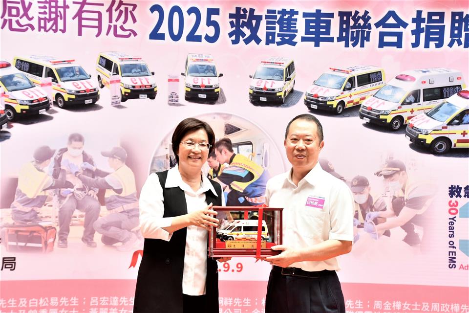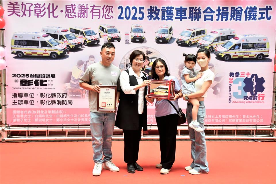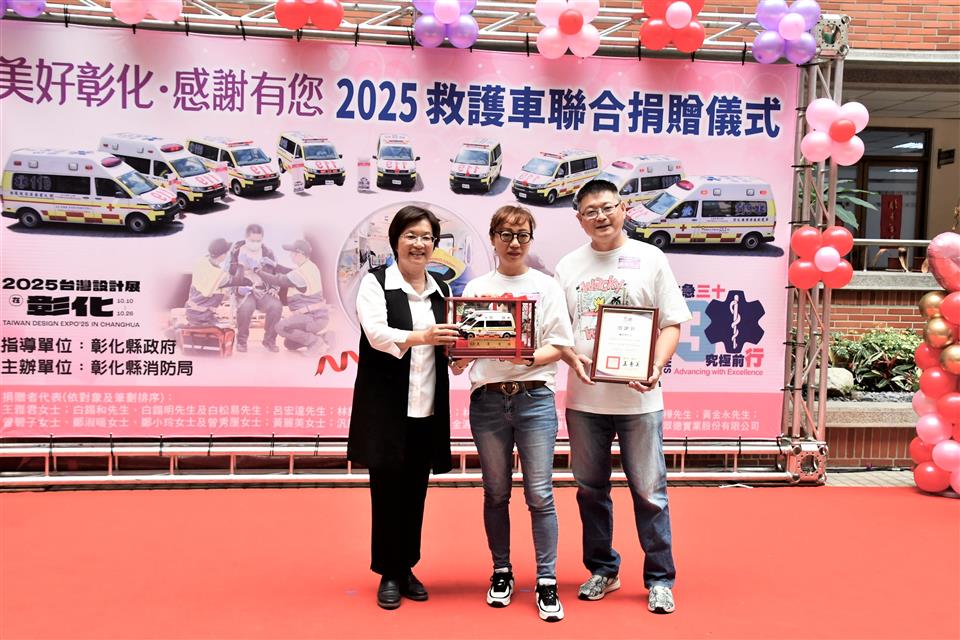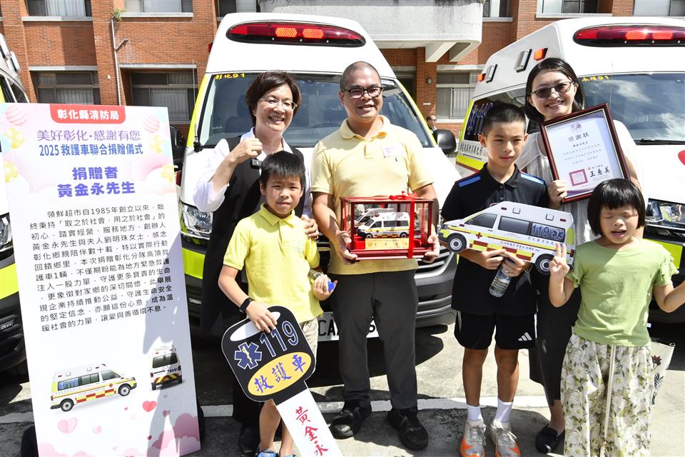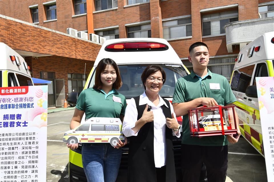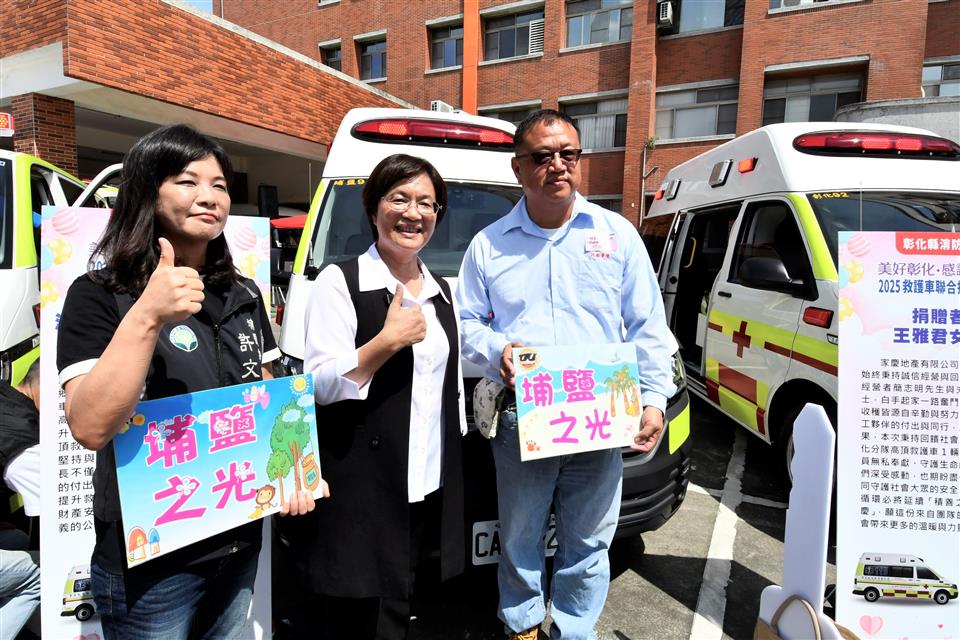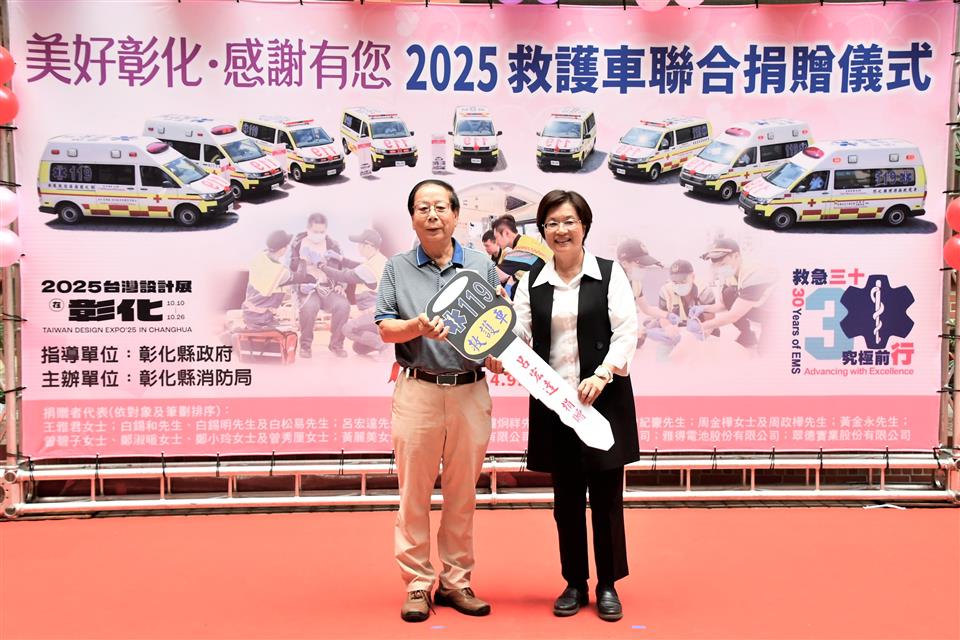為感謝各界善舉,彰化縣消防局今(9)日「全國救護日」於警察局中庭舉辦「美好彰化 感謝有您~2025救護車聯合捐贈儀式」,由縣長王惠美代表接受21位捐贈者共同捐贈的13輛全新救護車。王縣長表示,彰化人很有愛心,經濟實力也不差,甚至有因捐贈意願踴躍,需排隊等候的情形,這是為確保每輛救護車都能按實際需求分發,避免資源浪費。感謝所有捐贈救護車的企業和鄉親朋友,因為有你們,彰化縣的救護能量再次升級,這次迎來13輛全新的救護車,總金額達到4,814萬元,加上去年這兩年共獲得32輛救護車,總金額高達1億1,524萬元,創下史無前例紀錄,堪稱全國最強的公私協力合作紀錄。 王縣長指出,本次捐贈的13輛救護車,其中8輛為高頂救護車,每輛造價370萬元,其餘5輛為平頂救護車,每輛造價320萬元。都是根據各分隊需求量身訂製,新車採用最新的「巴騰堡格紋」反光設計,能有效提高能見度,保障出勤安全,車內配備高階急救器材,如自動體外心臟電擊去顫器、12導程心電圖機及自動給氧甦醒器等,讓救護人員能在第一時間提供最佳急救,也代表救護車已從傳統的「送醫工具」進化為具備高度急救能力的「行動急診室」。 王縣長強調,因為車輛及設備的挹注,近年來已成功挽救了459位急性心肌梗塞患者,救護車的救活率也從108年的20.4%,提升到113年的33.08%,感謝所有救護人員的付出與努力。今天不僅是「全國救護日」,也是台灣推動救護30週年的里程碑,30年來的進步有目共睹,未來也將持續培養更多專業的救護人員,引進更先進的器材,並與醫院緊密結合,讓救護體系更完善,幫助更多需要的鄉親。 彰化縣議會秘書長陳三民代表致詞表示,今天很開心見證各位捐贈者的愛心公益,正如王縣長所言,每一份對公益的付出會擁有千千萬萬倍的社會回饋,感謝各位捐贈者發揮大愛對社會的奉獻與付出。 代表捐贈者翔威壇副壇主黃昭霖表示,非常榮幸代表本壇,捐贈一輛救護車給彰化縣消防局二林分隊,為守護鄉親健康及生命安全盡一份心力,本壇祀奉關聖帝君,帝君以忠義仁勇之精神,深植人心。彰化翔威壇秉持信仰不只是求平安,更是行善濟世的理念,今天捐出救護車,就是希望將關聖帝君的慈悲大愛,透過實際行動傳遞出去。一輛救護車不只是交通工具,更可能在關鍵時刻成為拯救生命的橋樑,希望這輛由關聖帝君庇佑,本壇信眾善心集結而來的救護車,能夠在未來的日子裡逆風而行,救人於前,協助醫療單位救助鄉親。希望他開到的每一個地方都能帶來平安,最後感謝彰化縣政府及各界支持協助,讓捐贈圓滿順利。 消防局表示,本次捐贈13輛救護車總金額達4,814萬元,數量及金額都創縣府歷年單次受贈新高,21位捐贈者包括王雅君女士、白錫和先生、白錫明先生、白松易先生、呂宏達先生、林鈺雯女士、鐘炯祥先生、林淑靜女士、曾紀豪先生、周金樺女士、周政樺先生、黃金永先生、曾碧子女士、鄭淑暖女士、鄭小玲女士、曾秀厘女士、黃麗美女士、汎錏營造股份有限公司、金源豐企業有限公司、雅得電池股份有限公司及翠德實業股份有限公司。其中,林淑靜女士與曾紀豪先生累計捐贈救護車4輛、雅得電池股份有限公司也於今年7月才剛捐贈1輛小型水箱車、汎錏營造股份有限公司也額外捐贈高級救護技術員個人高階救護裝備1批。展現彰化在地人滿滿的愛心,以行動積極投入社會公益,這些救護車將全數投入現有救護車的汰舊換新,強化救護量能守護鄉親。 與會貴賓有彰化縣議員莊陞漢、温芝樺、白玉如、黃千宴、李成濟、林宗翰、柯振杯、賴清美、蕭文雄、劉惠娟、陳玉姬、陳ㄧ惇、李俊諭、吳錦潭、施佩妤、林小琪、許書維、蕭妤亘、彰化縣議會秘書長陳三民、埔鹽鄉長許文萍、捐贈者簡玉英女士、簡珩祐先生、簡禎儀女士、鍾承芳先生、王涵御女士、金進豐化學工業股份有限公司董事長白松易、呂森銘先生、鐘炯祥先生、林鈺雯女士、周桂得先生、蘇明雪女士、周政樺先生、周金樺女士、黃乙策先生、林淑慧女士、黃麗美女士、曾碧子女士、曾秀厘女士、汎錏營造股份有限公司總經理施俊昇、金源豐企業有限公司董事長暨彰化翔威壇榮譽大總理劉俊敏、雅得電池股份有限公司總經理李美宜、翠德實業股份有限公司董事長顔錫文賢伉儷、彰化縣消防局長施順仁、義消總隊總隊長黃錢明、各級民意代表及地方仕紳等。