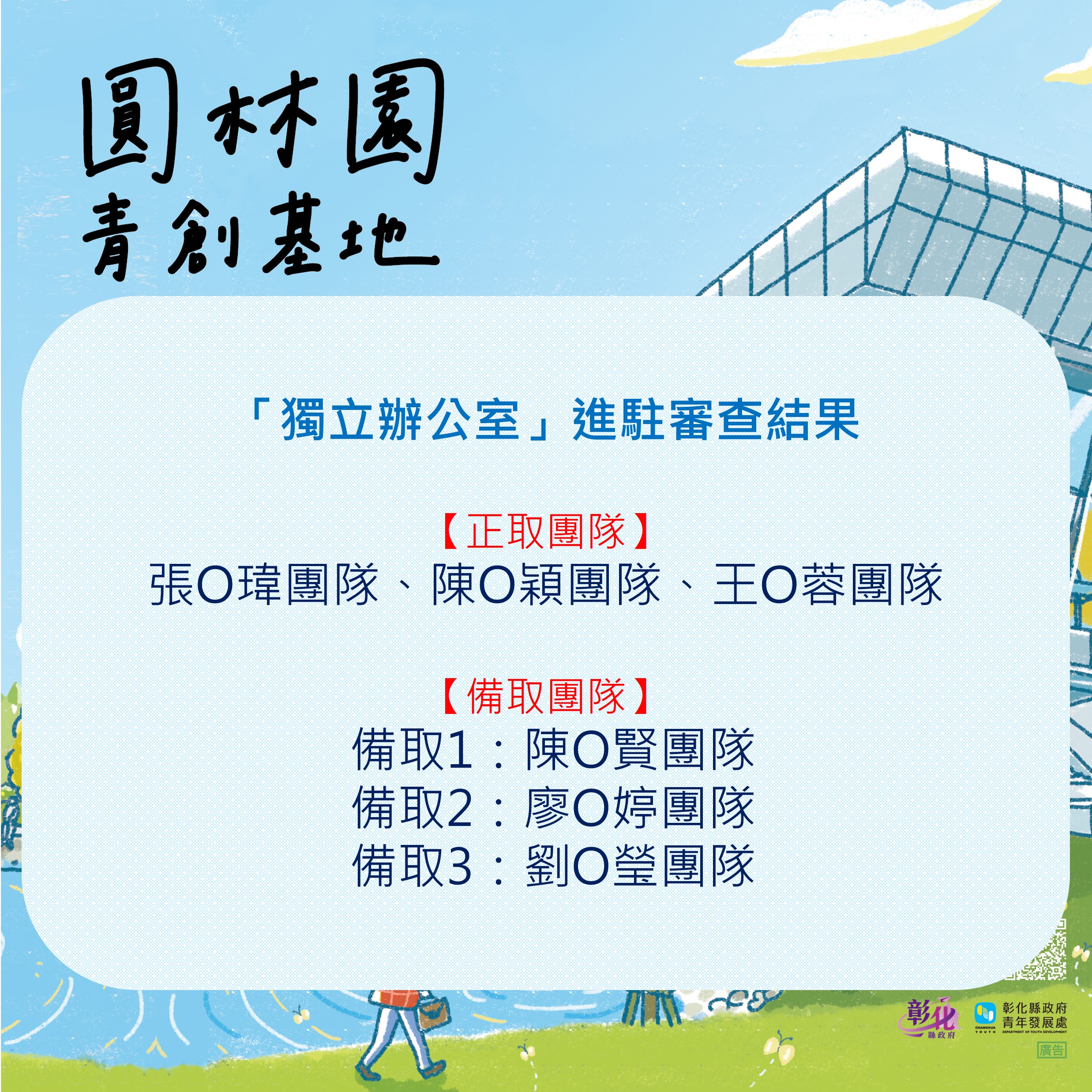 📢【圓林園青創基地公告】 獨立辦公室評審結果出爐啦!🎉 恭喜以下團隊脫穎而出: ✅ 正取團隊:張O瑋團隊、陳O穎團隊、王O蓉團隊 🔸 備取團隊:備取1-陳O賢團隊、備取2-廖O婷團隊、備取3-劉O瑩團隊 感謝所有青年朋友的參與與支持,讓我們一起在圓林園青創基地展開更多創業新篇章!