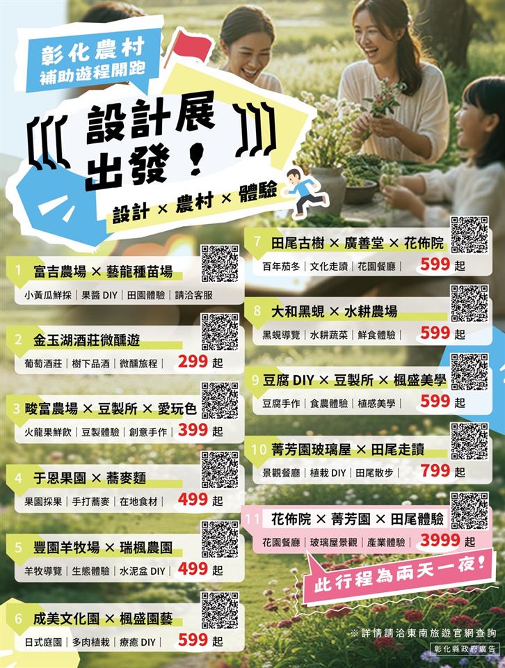 彰化縣政府推動的「2025農村旅遊風土提案所」休閒農業輔導計畫,今(25)日於縣府中庭展示成果,彰化縣長王惠美親自頒發金、銀、銅牌及優選獎,農業部農村發展及水土保持署南投分署副分署長陳存凱、農業部農村發展及水土保持署科長廖麗蘭與民代等人與會,王縣長表示,「彰化很有料,只是我們過去太低調」,感謝農業部農村發展及水土保持署長期輔導彰化縣休閒農業,感謝議長謝典林及議員們對預算的支持,還有各休閒農業區及農場,以及所有旅遊通路夥伴,一起為彰化農業觀光打拚。縣府結合農業、文化、旅遊,打造屬於彰化的農遊品牌,今年與中央一起輔導有5組獲獎團隊,推出11條農遊行程,串聯旅行業與2025台灣設計展,上架至擁有60萬會員的東南旅行社,遊程結合即將登場的「2025 台灣設計展」,讓到訪彰化的朋友,不只看展覽,還能走入田野,感受彰化獨特的風土民情。 王縣長表示,「2025 農村旅遊風土提案所」休閒農業輔導計畫,這次表揚5組團隊以創新思維深化「從產地到體驗」的服務設計,將「農業力」轉為「旅遊力」,推出的11條農遊產品化與上架旅遊通路,以「內容升級、通路連結、數位導流」打造可持續、可擴充、可複製的體系,讓「農業力、旅遊力、學習力」成為彰化風土的代名詞。 王縣長指出,這次計畫共辦理8場次,24小時培力課程,有100位業者一起共學,吸引17組團隊、近100家業者參與遊程競賽,最後有5條特色路線脫穎而出。榮獲金獎的「田間旅遊RPG|百大青農的邀請函」,展現青農創新與在地田野的深度結合;銀獎「農業1+1:土地共學 × 綠色共創」,呈現農業共學與環境永續的價值;銅獎「巡田計畫-田尾的循環美學旅」,把循環農業與地方美學巧妙串聯;優選的「斗苑微醺採果小旅行」與「食在風土,學在沿海:彰化海線風味教室」,則以輕旅行和文化風味展現農村體驗的多元樣貌。這些遊程蘊含農村的智慧與創意,從農場到餐桌,讓在地文化融入旅程體驗。 農業部農村發展及水土保持署南投分署副分署長陳存凱表示,這幾年彰化農村進步很多,身為彰化人,感到非常驕傲,後續將持續支持彰化的農村發展工作。 農業部農村發展及水土保持署科長廖麗蘭表示,王縣長提到彰化有許多休閒農業區,就像一顆顆珍珠般閃閃發亮,縣府透過遊程競賽,成功將這些珍珠串成一條線,未來將逐步擴大,形成「區域農遊」,結合旅行業者一起協助當地農遊業者行銷全國。 立委謝衣鳯表示,彰化縣政府在王縣長的帶領下,結合農村水保署及臺灣設計展的理念,提出非常好的遊程提案,希望藉由這次的台灣設計展可以帶動更多世界的遊客到訪彰化,共同來體會彰化的美好。 與會貴賓有立法委員謝衣鳯、縣議員陳玉姬、縣議員林宗翰服務團隊、農業部農村發展及水土保持署南投分署副分署長陳存凱、農業部農村發展及水土保持署科長廖麗蘭、格斯旅行社總經理李明效、山富國際旅行社經理蔡亦倫、五福旅遊經理賴素芬、彰化旅行社經理莊碧惠、勝景旅行社總經理陳麗英、東山旅遊副理黃曉豪、可樂旅遊旅行社協理蔡麗雪、永達旅遊總經理特助林詩菁、億貿旅行社業務林碧筠、縣府農業處長郭至善、各獲獎者、各級民代與地方仕紳等。 11條農遊行程: 1.富吉農場涼拌鮮採小黃瓜、藝龍種苗場果醬創意DIY 2.金玉湖葡萄酒莊、葡萄樹下品酒、微醺小旅行 3.畯富農場鮮飲火龍果、導讀豆製專門店、愛玩色創意館 4.二林于恩果園採果體驗、日式手打蕎麥麵體驗 5.豐園羊牧場生態導覽、瑞楓農園手作水泥盆植物組合體驗 6.台版兼六園成美文化園、楓盛園藝療癒多肉植物上板DIY 7.走讀田尾百年茄冬樹、廣善堂、花園地景花佈院餐廳 8.深入大和黑蜆基地、新鮮生菜番挖水耕農場 9.田野勤學食農豆腐DIY、導讀豆製專門店、植感楓盛美學 10.湖畔玻璃屋菁芳園景觀餐廳+小品組盆DIY、走讀田尾 11.花園地景花佈院、湖畔玻璃屋菁芳園、走讀田尾、產業體驗 遊程連結:https://www.settour.com.tw/act/mkt/allowance/index.html 「飲酒過量,有礙健康」