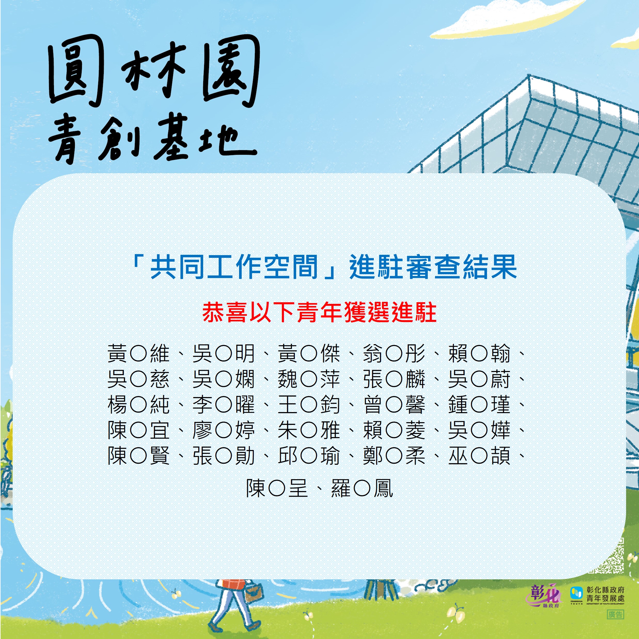 感謝所有青年朋友的踴躍報名,恭喜以下青年獲選加入: ✨ 黃○維、吳○明、黃○傑、翁○彤、賴○翰、吳○慈、吳○嫻、魏○萍、張○麟、吳○蔚、楊○純、李○曜、王○鈞、曾○馨、鍾○瑾、陳○宜、廖○婷、朱○雅、賴○菱、吳○嬅、陳○賢、張○勛、邱○瑜、鄭○柔、巫○頡、陳○呈、羅○鳳 👏 恭喜以上青年夥伴將成為圓林園青創基地的一員! 未來我們一起在這裡交流、成長、實踐夢想,讓彰化青年創業力量持續壯大!