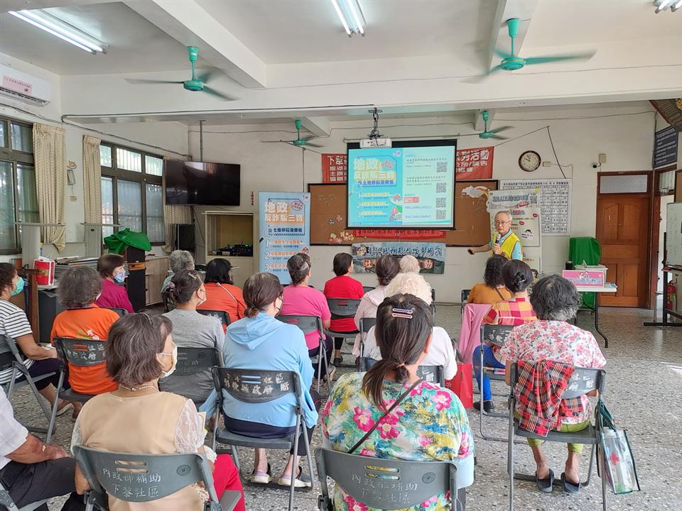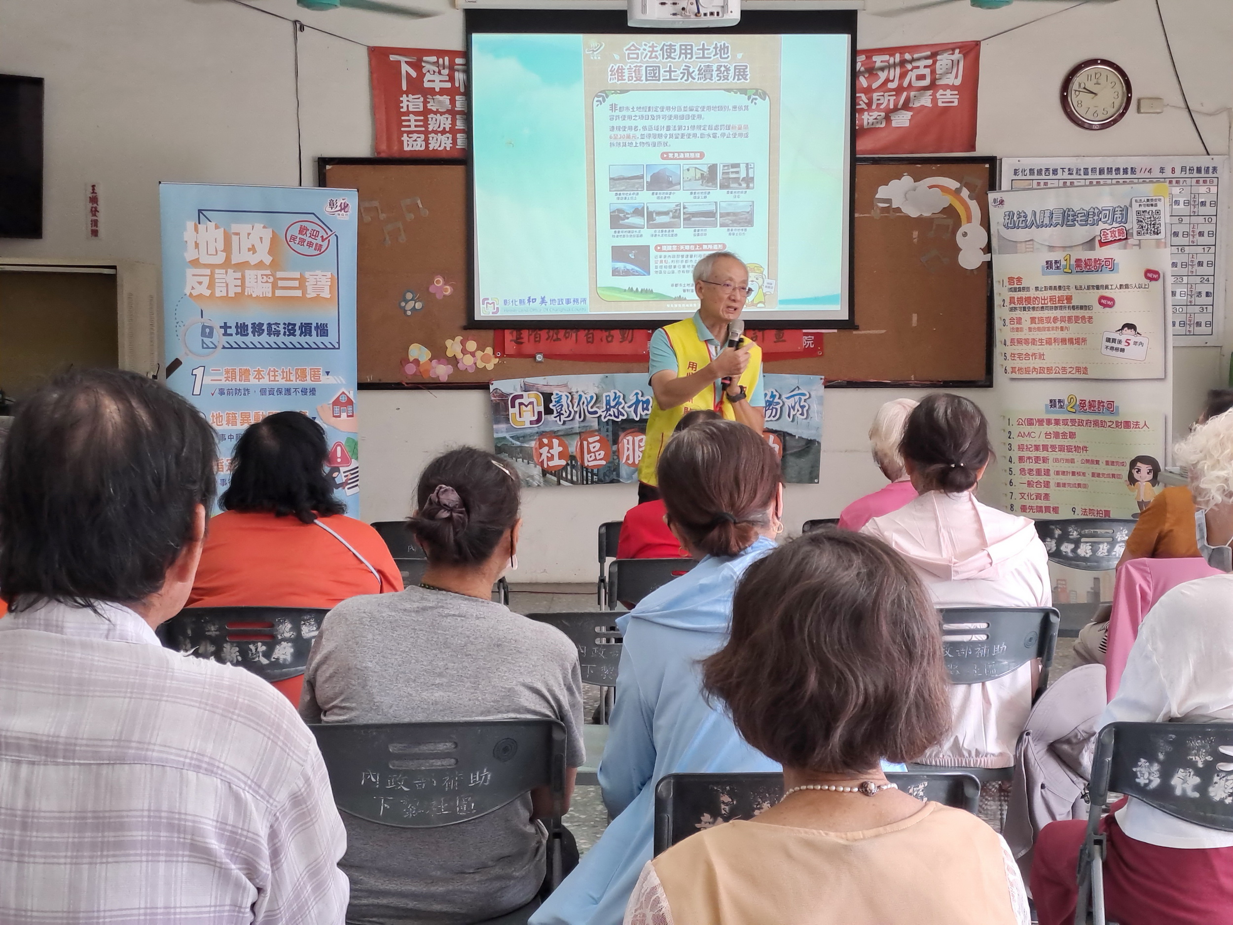 和美地政事務所於114年9月24日上午至彰化縣線西鄉下犁社區活動中心舉辦社區服務及宣導地政業務,推廣防詐地政三寶、宣講非都市土地使用管制之現行作法與行政機關作業思維,並解答在場民眾提問土地使用之疑惑。 下犁社區發展協會特別於社區年長者團康課程安排時段,讓和美地政事務所服務團隊宣導現行非都市土地管制作為及推廣地政防詐三寶作法,當日約有近20位民眾參與,由和美地政事務所服務團隊推廣地政防詐三寶—地籍異動即時通、第二類謄本地址隱匿、指定公文書送達處所,透過家人親友的互相關心來遏阻詐騙,藉由這些措施,以多重保護的方式,協力保障自身產權。另對於現行非都市土地違規使用的態樣予以說明,並說明中央行政、監察單位的處理思維,目前運用衛星影像定期搜查土地變異點的科技執法,地方政府執行層面經驗分享。另介紹和美地政事務所全功能櫃臺與中午服務不打烊的服務內容,讓鄉親可以更方便的洽辦事務。 和美地政事務所王建山主任表示,有鑑於詐騙事件層出不窮,因此將地政的阻詐措施介紹讓民眾知悉,提高民眾的防詐意識,並讓民眾對於土地使用管制的政府作為建立概念,期使和美地政事務所就權責執掌業務盡一份心力,並使各項業務及為民服務品質更加精進。 業務單位:和美地政事務所 聯 絡 人:林猷傑 電 話:7552217分機201