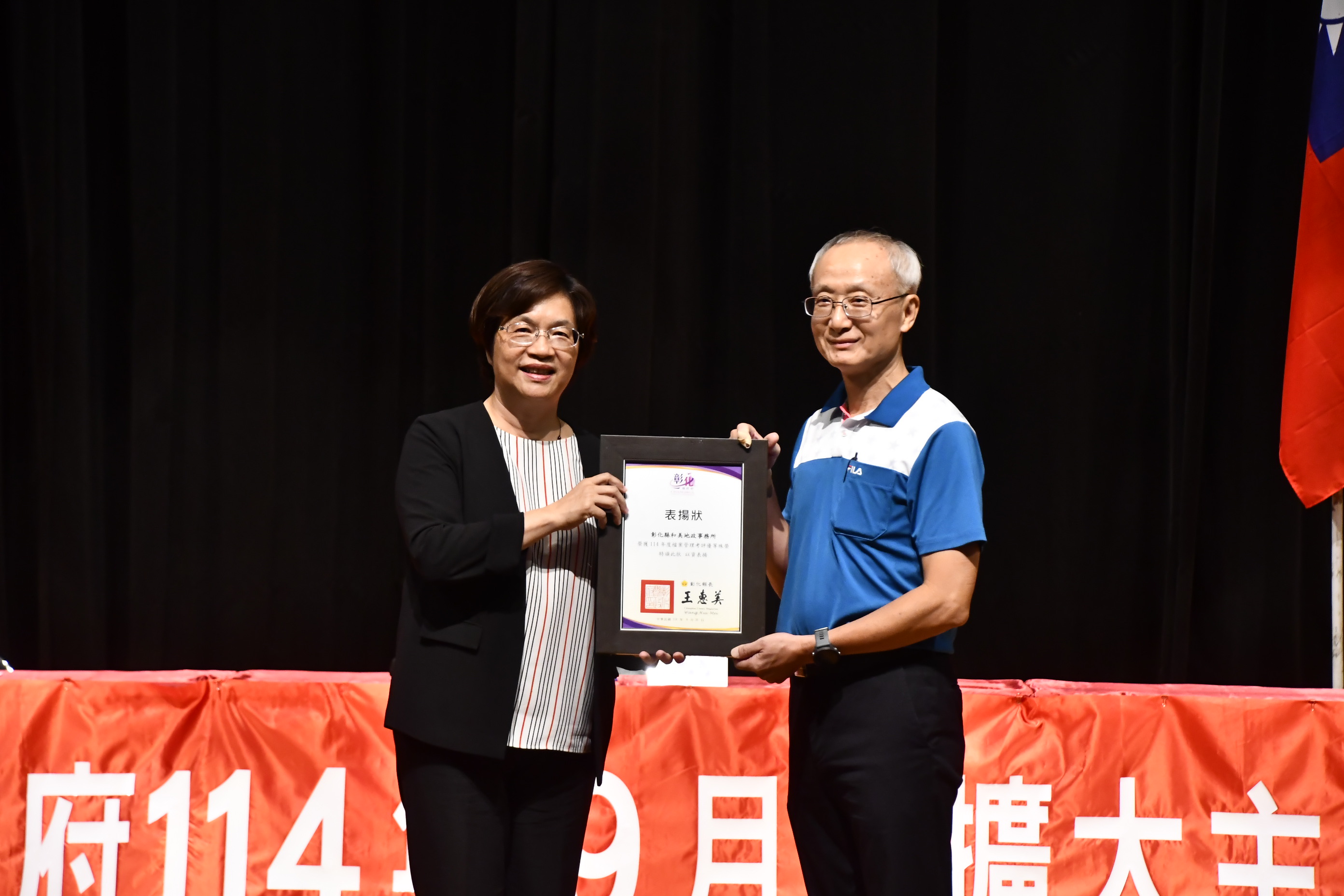 彰化縣政府114年9月份擴大主管會報於9月30日下午3時於彰化演藝廳辦理,會中並頒獎表揚第22屆金檔獎獲獎機關及本縣114年度檔案管理考評績優機關,和美地政事務所榮獲114年度檔案管理考評績優機關,並由王建山主任代表接受王惠美縣長頒獎表揚,璀燦的榮耀讓整個和美地政事務所倍感光榮。 本次會議由彰化縣王惠美縣長於會議中頒發各獲獎機關獎牌,和美地政事務所由王建山主任代表上台領獎,並與縣長及獲獎機關代表合影。和美地政事務所王建山主任表示,此次考評內容包含檔案的「立案編目」、「保存維護」、「鑑定與清理」、「檢調與應用」、「機密檔案管理」、「資訊化」等,和美地政榮獲114年度檔案管理考評「優等」機關,首要感謝平時縣府給予該所檔案管理專業的輔導及建議,更要感謝考評時委員們的悉心評核與青睞。未來和美地政將持續精進,以更專業更用心的態度,讓檔案管理更臻完善,提供民眾更優質的服務。 業務單位:和美地政事務所 聯 絡 人: 謝小姐 電 話:7552217#308