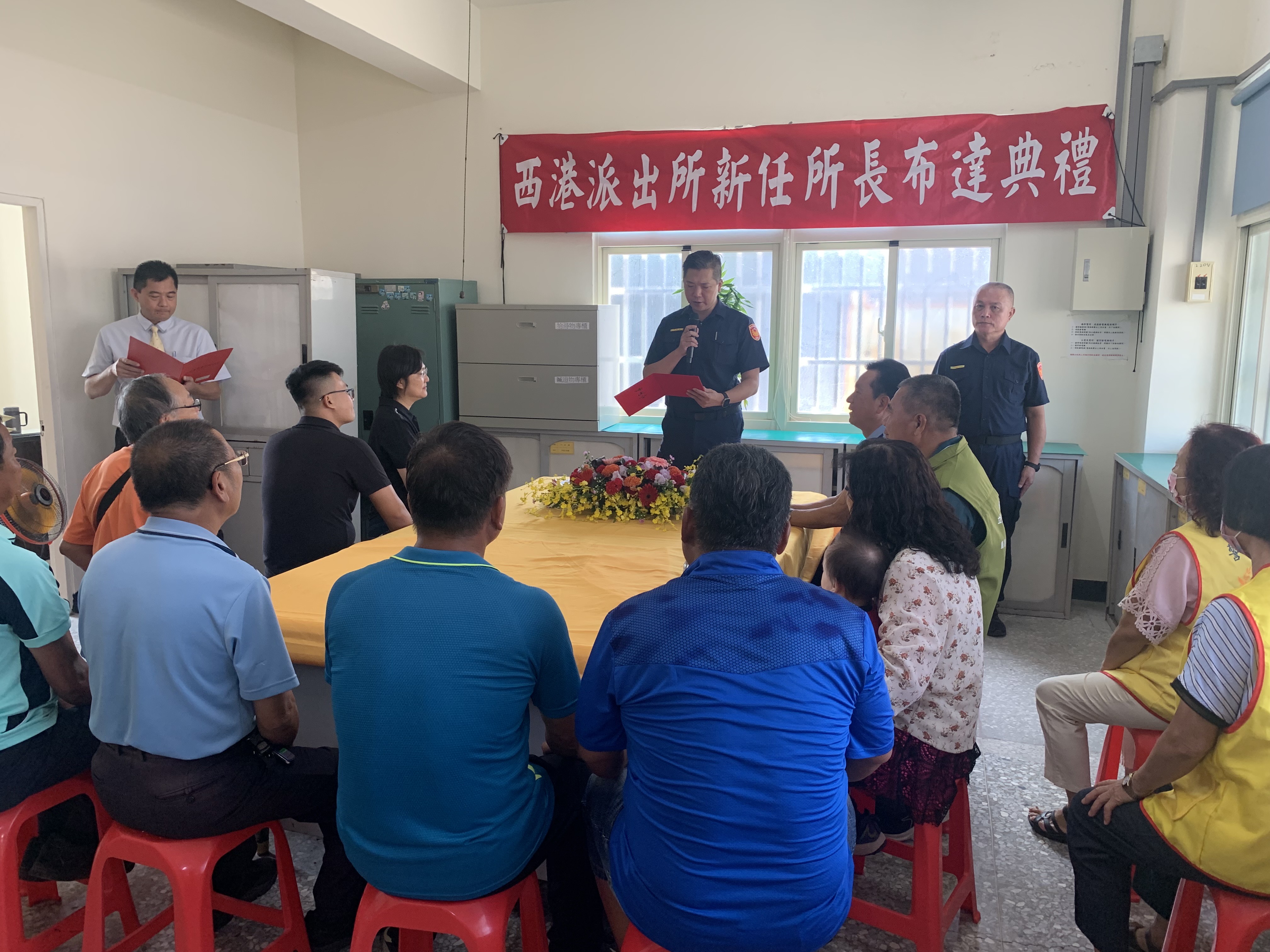 芳苑分局西港派出所於114年10月7日上午10時辦理新任所長布達典禮,由分局長宋俊良親自主持,並邀請大城鄉鄉長陳玉照、縣議員助理、村長與地方仕紳,及義警、民防、志工、守望相助等民力團體出席觀禮,現場氣氛熱絡。 新任西港派出所所長由員林分局同安派出所巡官兼所長謝松霖接任,謝所長實務經驗豐富、工作積極認真,分局長期許謝所長到任後發揮所長,對轄區地方治安、交通維護及為民服務方面等重點工作,能展現一番新的風貌,並期勉秉持熱忱、深入社區,強化民眾共同維護治安觀念,也竭誠歡迎各界人士提供寶貴警政意見。