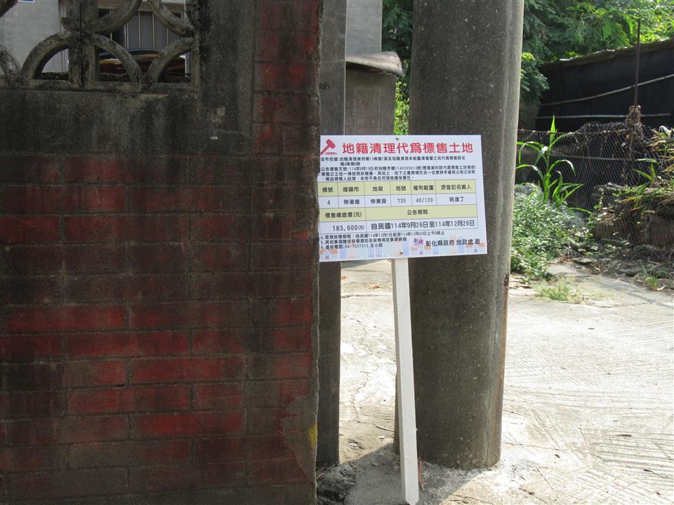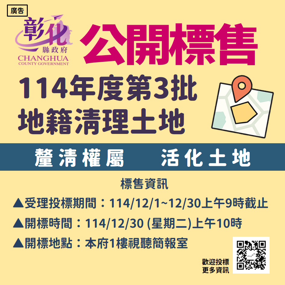彰化縣政府代為標售114年度第3批地籍清理未能釐清權屬土地,自即日起至114年12月26日止公告3個月,受理投標期間為114年12月1日起至114年12月30日上午9時止,並訂於114年12月30日(星期二)上午10時辦理開標作業,本次共公告23標土地,歡迎有意投標且符合投標資格的民眾踴躍參與投標,以免向隅。 本次標售底價最便宜18萬3,600元係第4標伸港鄉伸東段735地號,為都市計畫內住宅區、面積20平方公尺、權利範圍40/120,持分面積6.67平方公尺,每平方公尺2萬7,526元;標售底價最高2,253萬6,432元係第3標和美鎮福澤段398地號,為鄉村區乙種建築用地、面積3,322.12平方公尺、權利範圍216/864,持分面積830.53平方公尺,每平方公尺2萬7,135元。 地籍清理主要係解決臺灣光復初期遺留之權利內容不符或與現行法令規定不符之地籍問題,經公告後倘逾申請登記期限,仍未有權利人申報或申請登記,除公共設施用地外,由本府辦理代為標售。提醒有意投標人,本次各標號土地多有占用情形,標售一律按現狀標售,其地上物及一切應辦手續或占用之排除,概由得標人自理,欲參加投標之民眾可向本府地政處地籍科免費索取投標書件,亦可至本府地政處網站(https://land.chcg.gov.tw/)下載使用。 地政處表示,各標號土地權利人及利害關係人於決標前,仍可檢具相關證明文件,向彰化縣各地政事務所申辦登記或向各主管機關辦理申報,另外有符合規定之優先購買權者,請主動於決標後10日內書面申請主張優先購買權,以確保自身權益。 標售資訊:https://gov.tw/nuF