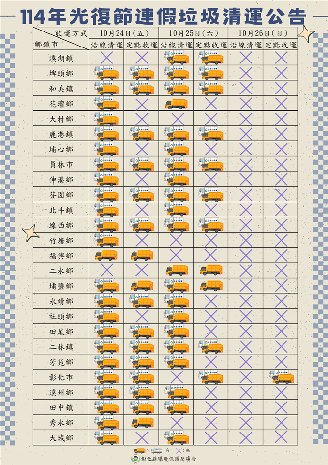 隨著雙十國慶及光復節連假將至,彰化縣部分鄉鎮市將配合國定假日調整垃圾收運服務。彰化縣環保局提醒民眾,出門前務必留意各地清潔隊公告的收運時間,提早排出垃圾,避免影響出遊安排。 雙十連假期間(10月10日至12日),10月10日國慶日,大村鄉、埔心鄉、竹塘鄉、二水鄉、彰化市、秀水鄉沿線暫停收運,其餘地區沿線照常收運;10月11日全縣沿線照常收運;10月12日適逢例假日,僅彰化市定點有收運。至於光復節連假(10月24日至26日),10月24日,僅溪湖鎮及二水鄉沿線無收運,其餘鄉鎮市沿線照常收運;10月25日光復節當天,大村鄉、竹塘鄉、福興鄉、彰化市、秀水鄉沿線無收運,其餘地區沿線照常收運;10月26日適逢例假日,僅彰化市定點有收運。 彰化縣環保局表示,連假期間各鄉鎮市垃圾車收運服務有異動,民眾如需查詢各鄉鎮垃圾清運狀況,可參閱垃圾收運狀況附表,或透過各鄉鎮市公所網站或官方臉書查詢,以利掌握最新清運資訊,避免錯過垃圾車時間。如遇非收運日,請民眾務必將垃圾妥善打包並暫存於家中,不可將垃圾任意放置於住家門前、騎樓或空地,以免吸引流浪動物、孳生蚊蟲或產生異味,造成環境髒亂。 此外,連假期間,彰化縣各地將舉辦多項慶祝活動,包括升旗典禮暨健行與園遊會活動與台灣設計展,邀請民眾利用假期走訪各地,感受地方文化與創意魅力。不過,彰化縣環境保護局長江培根也特別提醒,歡樂參與活動的同時,請隨手將煙蒂、衛生紙、竹籤、飲料杯、紙袋、紙盒、塑膠袋等垃圾投入垃圾桶或資源回收桶,讓廢棄物回到對的地方,別讓「拍照留念」,變成「垃圾留痕」。 彰化縣環保局強調,「垃圾不落地」不只是口號,而是民眾展現公民素養與環境意識的具體行動。若人人主動減量、隨手清潔,沒有垃圾的街角,正是彰化最美的風景。