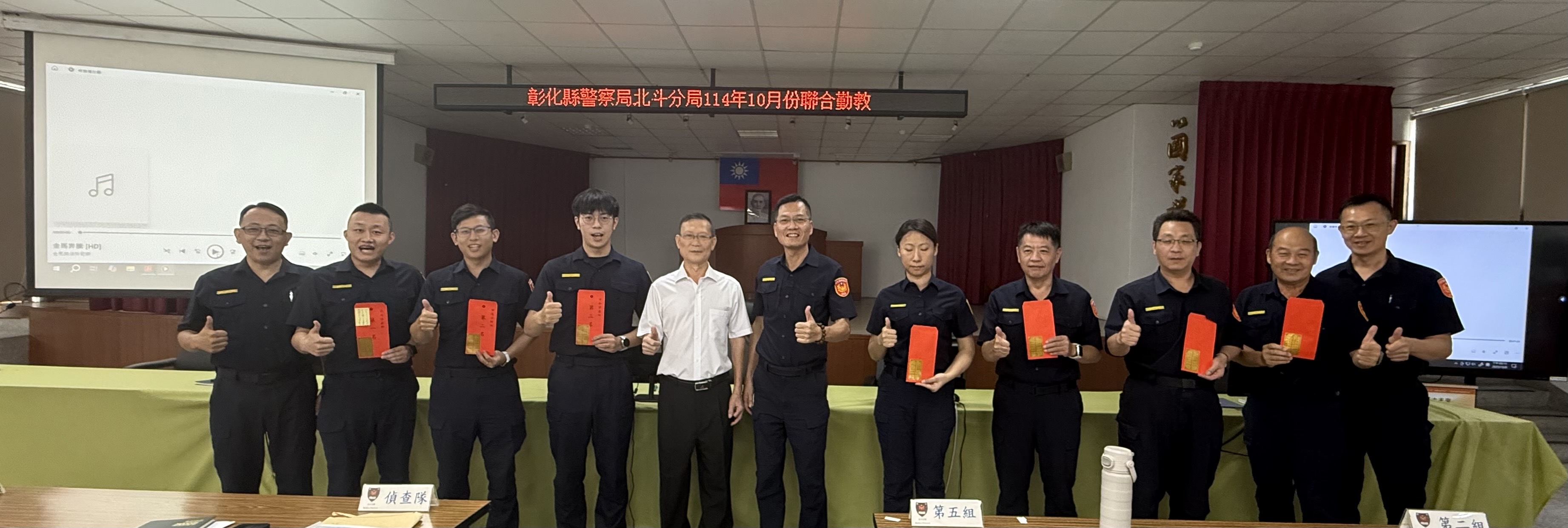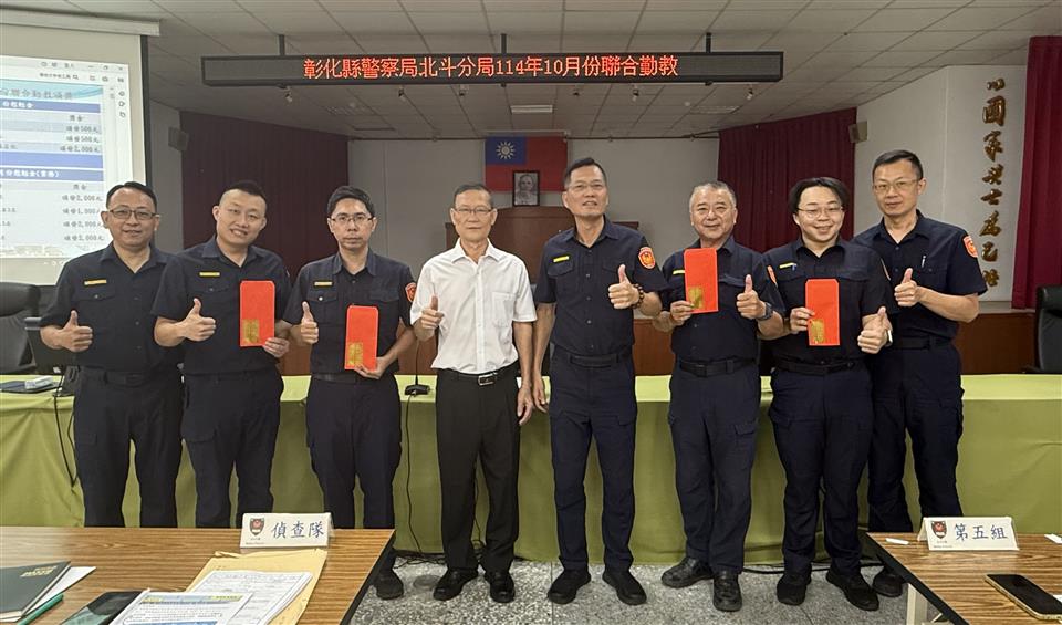 北斗警察分局於 10 月份聯合勤教期間,特別邀請北斗警友辦事處副主任盧明旺到場,針對近期破獲刑案及各項業務績優的亮眼表現,予以嘉勉表揚,藉此鼓舞同仁士氣。 各分駐(派出)所在 114 年 9 月份執行毒品掃蕩、詐欺防制及查緝車手等勤務中,展現積極作為,成功查獲多起毒品案件並攔阻詐騙金流,有效守護民眾財產與安全。此外,114 年上半年業務評核表現亮眼,會中由盧副主任親自頒發慰勉金予表現優異單位主管,肯定第一線同仁在各項工作中默默付出的辛勞,現場氣氛溫馨且振奮,讓同仁深受鼓舞。 北斗分局長楊志源特別感謝盧副主任在百忙中撥冗蒞臨分局頒發慰勉金並肯定同仁努力,讓第一線執勤員警感受到社會各界的支持與關懷。楊分局長表示,警察肩負維護治安與交通安全的責任,未來將持續強化毒品、詐欺及各類刑案的打擊作為,展現維護社會安全的決心。