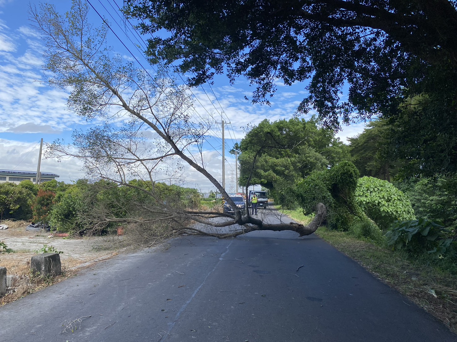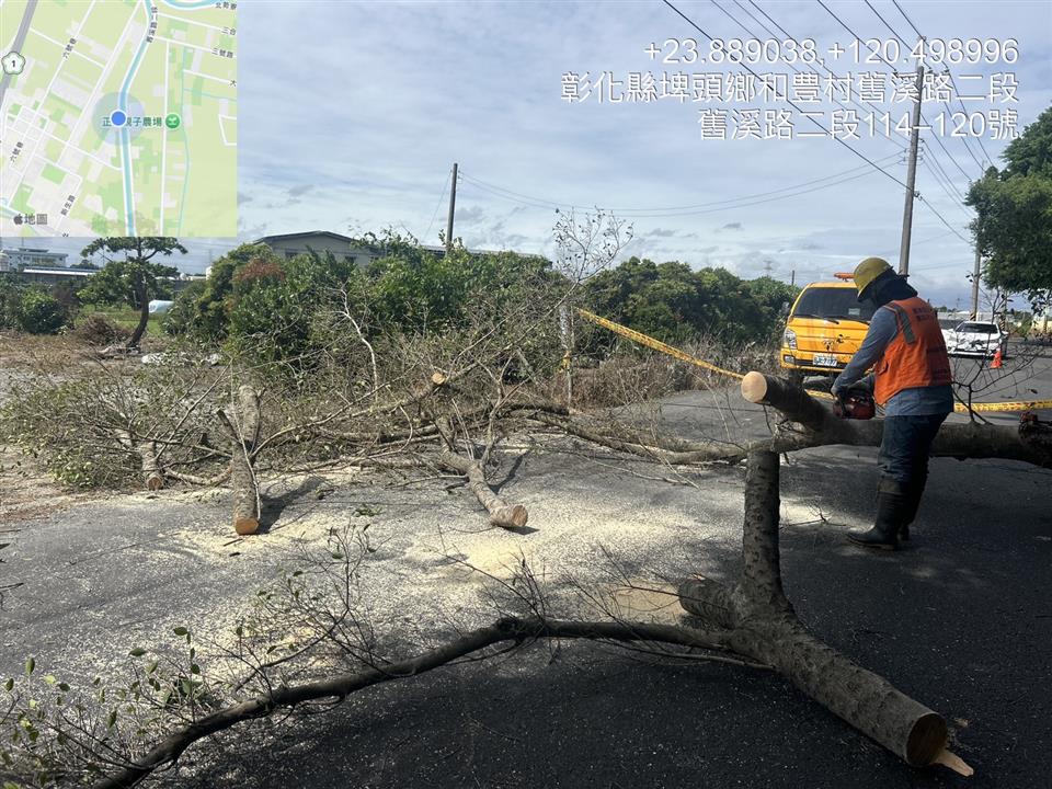 受風神颱風與東北季風共伴效應影響,10月22日11時10分許,北斗分局埤頭分駐所接獲民眾報案,指稱埤頭鄉和豐村舊濁水溪南邊防汛道路有路樹倒塌情形,影響交通安全,埤頭所員警獲報後立即趕赴現場處理,到場後發現倒塌路樹橫跨部分車道,恐影響通行安全,員警隨即設置交通錐與警示標誌,並引導車輛改道通行,避免交通堵塞與事故發生,同時通知縣府水利資源處派員到場清理,經相關單位通力合作,於14時20分順利排除障礙,現場交通恢復正常,警方即時應變的作為,獲得往來民眾肯定與讚賞。 北斗分局長楊志源表示,近期受颱風及東北季風共伴效應影響,易發生路樹倒塌情形,為確保民眾行車安全,警方將持續加強道路巡查,並與相關單位保持密切聯繫,以即時應變、迅速處理。提醒民眾,若發現道路障礙或其他危險情形,請立即撥打110通報,警方將第一時間到場協助,共同守護交通安全與民眾平安。