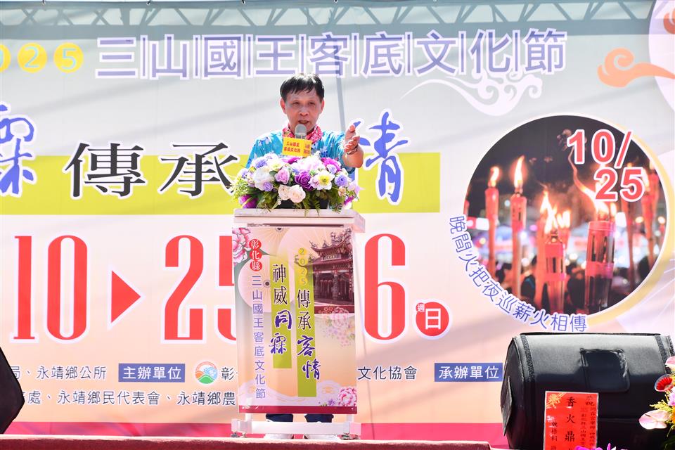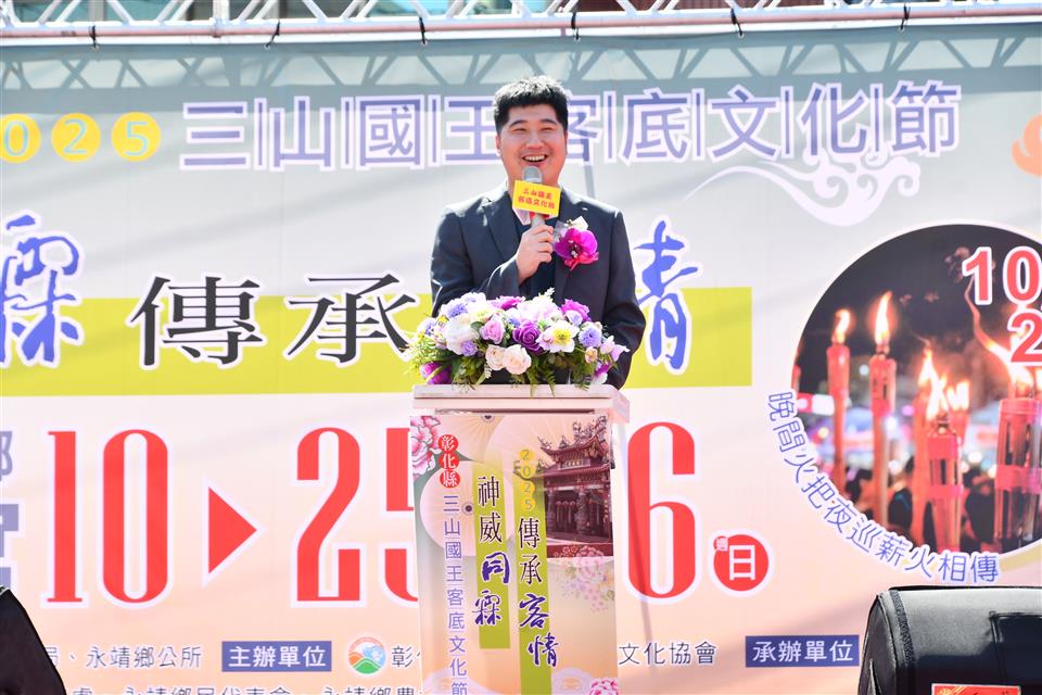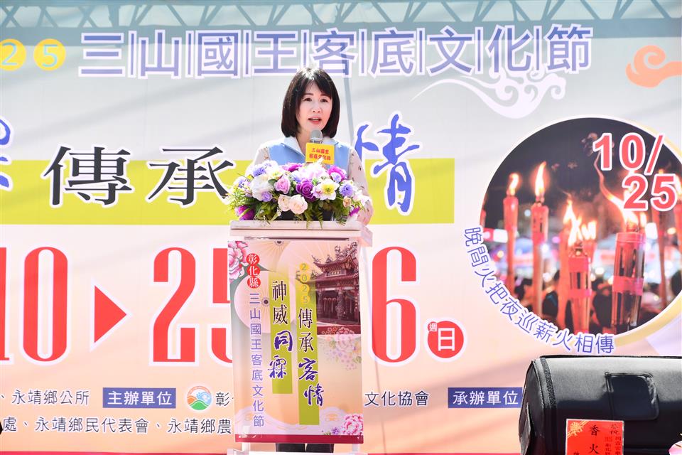 彰化縣三山國王客底文化節於10月25、26日在永靖鄉同霖宮熱鬧登場。昨(25)日晚間舉行火把迎神繞境祈福儀式,今(26)日上午舉行開幕式、下午朝聖典禮、晚間宮廟交接儀式。開幕式由縣長王惠美、三山國王客家文化協會會長胡祥畯、同霖宮主委黃一清等人參與。王縣長表示,彰化縣三山國王客家文化協會自91年起開始整合縣內39間宮廟擲筊輪流舉辦文化節活動。今年由同霖宮主辦,將縣內39間廟宇共117尊神尊齊聚一堂,為眾人祈福,讓信眾一次獲得所有神明的庇佑。感謝胡會長,每年的活動都辦得比往年更加盛大,期盼透過活動彰顯客家族群的寄託,也讓大家更認識永靖客庄。 王縣長表示,今年活動非常有特色,尤其是昨晚登場的夜間火把迎神繞境祈福,火把象徵陽光與正氣,可以驅邪避凶,同時代表迎來光明與福運。路程從永安宮沿著主要街道(西門路、永福路)一路走到今年承辦宮廟同霖宮。感謝黃主委的用心號召,雖然只有短短2公里的距離,但沿途約有600位信眾熱情參與,一同祈求地方風調雨順,凝聚地方人心。 王縣長指出,除了火把迎神繞境祈福外,還有三山國王朝聖典禮、客庄揚藝樂舞秀、客庄藝文「當好尞」(客語)體驗活動。加上走讀小旅行由當地文史人員帶領走讀「同霖宮」以及「忠實第」等永靖客庄景點,整合地方的人、文、地、產、景等資源,展現文化吸引力。透過活動讓民眾深入認識客家族群的發展歷史,達到尊重不同文化,也讓客家族群積極參與客家的文化重建及公共事務。 客家委員會副主委邱星崴表示,客家文化相當多元,以語言為例,除了大家熟知的四縣腔,還有海陸腔、大埔腔、饒平腔、詔安腔等,有個口訣叫做「四海大平安」,正好代表了這五種主要的腔調,也象徵祈願台灣平安的深意。除了語言,客家的信仰同樣多元,三山國王便是客家的經典信仰。桃竹苗地區有許多三山國王信仰,最初都是從彰化分香過去,說明客家文化的連結,遠比我們想像的更加深遠。 三山國王客家文化協會會長胡祥畯表示,感謝黃主委、主席、代表、村長的大力協助,為了舉辦這次的活動,前前後後共召開約20次的會議,祝福活動圓滿成功。 同霖宮主委黃一清表示,在今天大好之日,三山國王客底文化節熱鬧登場。活動有火把繞境、寫生、客家美食、舞蹈表演等,精彩豐富,歡迎大家一起參與。 永靖鄉長魏碩衛表示,感謝王縣長大力支持,補助經費讓活動辦理如此盛大,同時感謝客委會、胡主席、黃主委、與在地民意代表的協助,期望透過活動,讓大家更了解客家文化以及永靖鄉。 文化局表示,「同霖宮」主祀三山國王,陪祀天上聖母、觀音佛祖、福德正神及王爺奶,宮廟建於民國68年,透過每年的「彰化縣三山國王客底文化節」活動,讓民眾發現客家人在彰化平原活動的歷史足跡,重回歷史現場,體驗三山國王客庄文化,並對在地先民早年入墾的艱辛,建立家園的歷史淵源,有更深切的感受。 與會貴賓還有立法委員謝衣鳯、陳素月、客家委員會副主委邱星崴、彰化縣議員詹木根、張欣倩議員服務團隊、黃正盛議員服務團隊、三山國王客家文化協會會長胡祥畯、總幹事杜建模、永靖鄉長魏碩衛、代表會主席林致安、永靖鄉同霖宮主委黃一清、彰化縣文化局副局長吳文昇、縣政顧問張銘達、陳書友、永靖農會理事長詹日新、總幹事陳翠玲、中華傳統宗教總會副秘書長饒清錫、彰化縣客家諮詢委員會榮譽顧問邱美都、彰化縣貓羅溪客家文化協會理事長劉姿均、各級民意代表及地方士紳等。