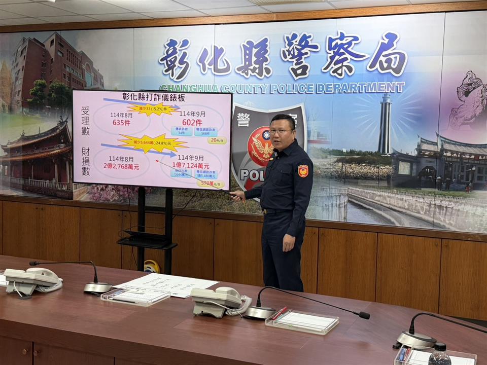 彰化縣警察局由局長陳明君親自主持記者會,透過打詐儀錶板,說明114年9月份彰化縣轄內詐騙現況,114年9月份受理件數602件及財損數新臺幣(以下同)1億7,124.7萬元;以每十萬人口數統計,彰化縣9月份平均受理詐欺案48.95件(全國排列第14),平均財損金額約1,392.4萬元(全國排列第15),治安相對穩定。 警察局114年1至10月執行打詐成果,累計查獲詐欺集團261件,詐欺集團成員計1,957人次,查扣汽車、現金、土地、房屋及虛擬貨幣等總計價值6億2,127萬餘元,攔阻詐騙金額達3億8,501萬餘元,合計阻斷詐團金流達10億餘元,警察局將持續加強守護縣民財產安全。 北斗分局於近期接獲金融機構行員通報,一名婦人欲解除定存並提領現款,行員懷疑其可能遭詐,隨即通知警方到場攔阻。員警趕抵後了解,發現該婦人經由詐騙集團主動加入LINE好友,以假交友聊天方式介紹投資黃金期貨,並至假投資網站註冊,先以現金跟假幣商面交購買虛擬貨幣,再將虛擬幣轉匯給詐騙集團進行儲值投資,在警方勸說攔阻下,才驚覺受騙,警方遂迅速組成查緝小組,並順利查獲前來取款之詐騙車手及追查該集團幕後成員,現場並查扣現金150萬元、手機及點鈔機等相關證物,全案依刑法詐欺罪移請臺灣彰化地方檢察署偵辦。 為加強民眾防詐意識,彰化縣警察局特別舉辦「10月份打詐記者會」,邀請國民歌后龍千玉擔任「防詐大使」,以親切形象向大家宣導「假檢警詐騙」防範觀念,龍千玉在活動中表示,近年假冒警察、檢察官的詐騙手法層出不窮,詐騙集團常以「帳戶涉及刑案」、「需要監管」為由,誘使被害人交出金融卡或匯款至所謂「監管帳戶」,導致民眾血本無歸。更以溫暖的語氣提醒大家:「接到可疑電話先冷靜,不要被嚇到,掛掉電話撥165查證最安全,不要輕信電話或LINE訊息中的威脅話術」,一起共同打造識詐、防詐、反詐的安全社會環境。 局長陳明君呼籲民眾提高警覺,近年詐騙集團手法不斷翻新,勿輕信假冒慈善捐款或電子支付平台的詐騙訊息,詐騙集團利用民眾對花蓮災情的關心,假冒慈善機構或政府單位名義,散布「花蓮救災募款」連結,誘使民眾點擊並輸入個人資料或匯款捐款,實為詐財陷阱。另本月23日總統正式公布「中央政府因應國際情勢強化經濟社會及民生國安韌性特別預算案」,民眾務必認明普發現金官網「10000.gov.tw」,近期已有詐騙集團假冒財政部名義發布的假簡訊或Email電子郵件進行詐騙,提醒社會大眾務必提高警覺,政府一定不會要求民眾加入Line官方帳號或利用電子支付領取1萬元,民眾如有疑問就打165反詐騙專線。