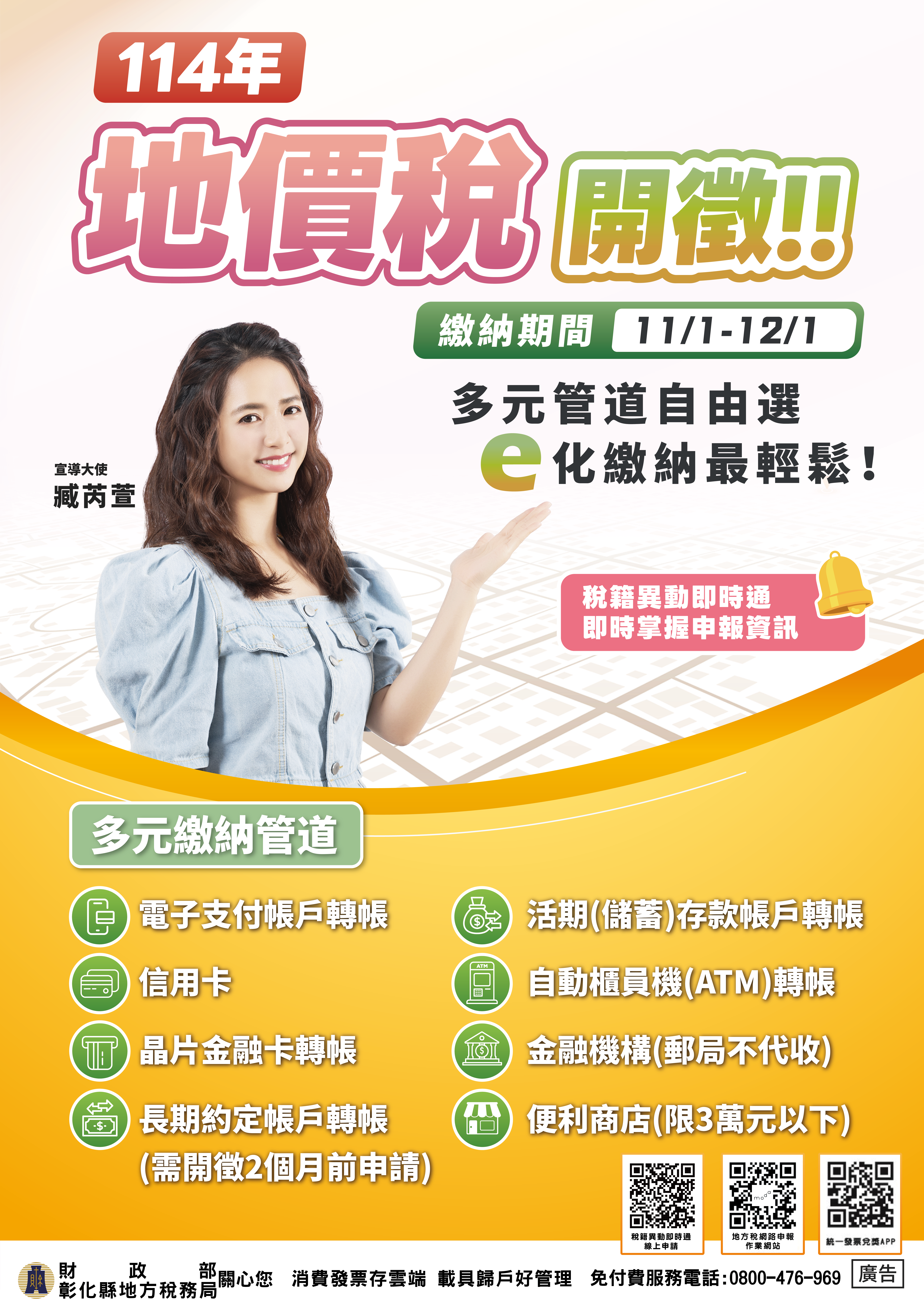 114年地價稅開徵,繳納期限至11月30日(遇例假日順延至12月1日)止,繳款書已於近期陸續寄發,請民眾如期繳納,以免逾期被加徵滯納金;如未收到或遺失繳款書,可撥打電話、網路申請或到稅務局、各鄉鎮市公所服務櫃台申請補發。 地價稅課稅的期間是1月1日到12月31日,以每年8月31日地政機關登記之土地所有權人為納稅義務人,並以納稅義務人在同一直轄市或縣(市)內所有土地之地價總額計算,因此民眾在彰化縣持有2筆以上的土地,只會收到1張地價稅單。 彰化縣地方稅務局提醒,繳稅方式除可持稅單到金融機構繳納外,亦可到便利商店(稅額3萬元以下)繳納或透過自動櫃員機(ATM)、信用卡、晶片金融卡、活期(儲蓄)存款帳戶及電子支付帳戶等方式繳稅。除此之外,還可使用行動裝置掃描繳款書上QR-Code連結至網路繳稅服務網站(https://paytax.nat.gov.tw),或透過開辦行動支付工具繳稅服務業者之APP繳納。另已辦理活期(儲蓄)存款帳戶轉帳繳稅的民眾,請在114年12月1日24時前在帳戶內預留足額存款,以利扣款。 如有任何疑問,請撥打稅務局免付費服務電話0800-476969洽詢。