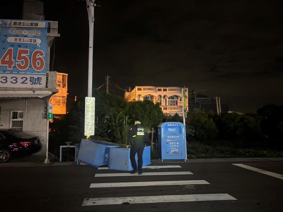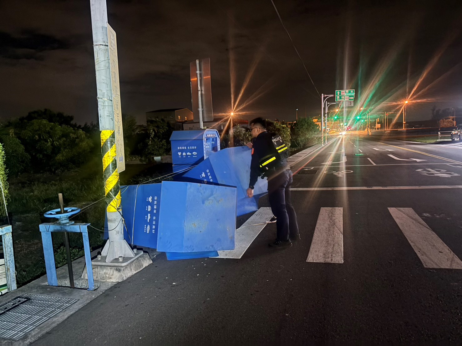 由於天氣不穩瞬間颳起陣風,導致落葉及民眾放置各式物品(舊衣回收箱)因承受不起強風而四處飛散佔據道路影響行車安全,員警路過發現場協助將其清除恢復道路通行,備受路過駕駛及附近住家民眾讚許。 鹿港分局福興分駐所警員林仕峻、傅琪婷,日前執行轄區巡邏勤務時,於22時40分許行經福興鄉番花路2段附近,車道上有1只舊衣回收箱阻礙通行,林、傅2員路過時發現前路車輛怎會都突然打方向燈繞行而過,心中存有疑惑,直至抵達現場時才看清楚狀況,加上當時正值深夜,因此立即下車徒手將舊衣回收箱移置到路旁安全處,使現場交通暫時恢復順暢,並通知相關單位前來善後,路過車主及附近民眾見員警捲袖清除的舉動感到相當窩心,頻頻感謝警方的幫忙,讓用路人能安心使用道路。 本案警員林仕峻、傅琪婷處理事故態度積極、敏覺性、能及時給予關懷及協助,發揮同理心精神,能感同身受民眾焦急心態,並善用溝通技巧使民眾情緒恢復平穩,民眾對警方作為表達高度肯定與感謝,充分提升警察的正面形象。