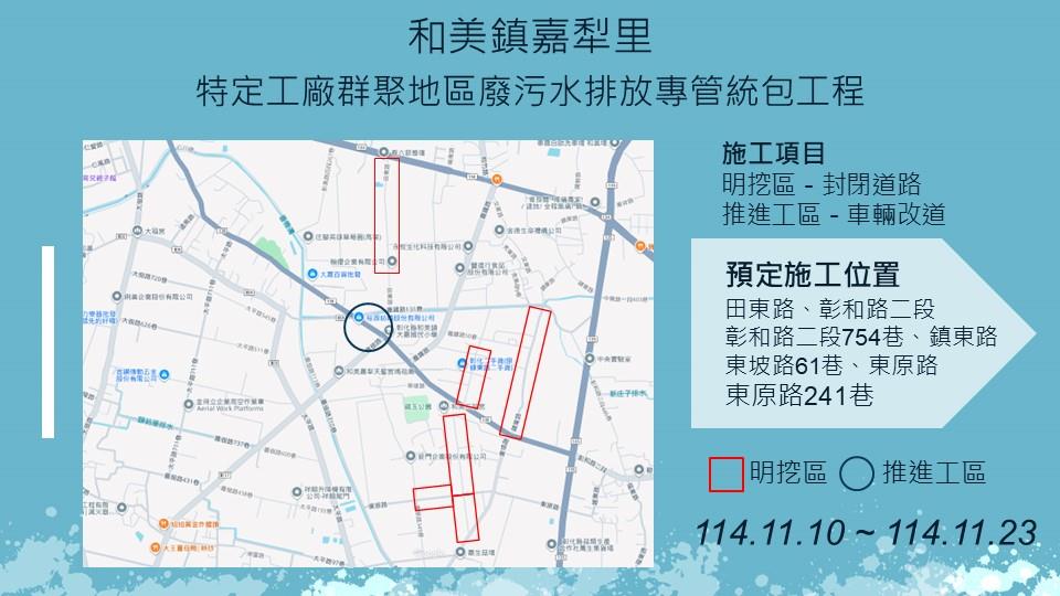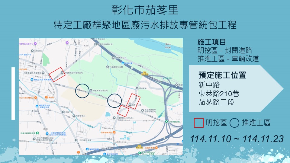 【彰化市茄苳里、和美鎮嘉犁里特定工廠廢污水排放專管工程施工公告】 彰化縣政府水利資源處於彰化市茄苳里及和美鎮嘉犁里進行特定工廠污水排放專管建設工程,於11月10日至11月23日預定施工範圍及管線施工路段,如圖示,工程採分段分區方式施工,相關期程將視現場施工情形調整,部分路段實施車道分流及縮減,敬請多加小心! 1、 彰化縣彰化市茄苳里特定工廠群聚地區廢污水排放專管統包工程,將於新中路、茄苳路二段進行明挖作業;於東萊路210巷進行推進作業。 2、 彰化縣和美鎮嘉犁里特定工廠群聚地區廢污水排放專管統包工程,將於田東路、彰和路二段754巷、鎮東路、東坡路61巷、東原路、東原路241巷進行明挖作業;於彰和路二段(近大嘉國小)進行推進作業。