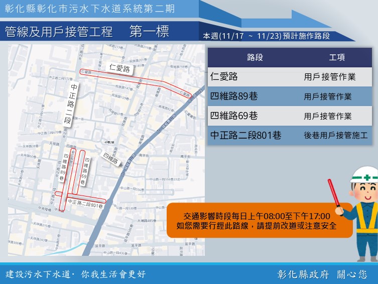 【彰化市污水下水道施工公告11/17(一)~11/23(日)】 內政部國土管理署下水道工程分署於彰化市區正進行彰化市污水下水道系統管網工程,於三民路、中正路、中山路等重要市區道路進行施工,本週各區施工工項及路段如下,相關期程將視施工情形調整,部分路段實施車道分流及縮減,用路人可多加留意施工路段,注意用路安全,造成不便之處,敬請見諒! 1、 彰化市污水下水道系統第二期管線及用戶接管工程第一標 ,於仁愛路、四維路69巷、四維路89巷,進行用戶接管作業;於中正路二段801巷,進行後巷用戶接管施工作業。 2、 彰化市污水下水道系統第二期管線及用戶接管工程第二標,於永安街平交道附近、三民路362號附近、三民路與中民街口、中山路二段838號附近,進行推進作業。 3、 彰化市污水下水道系統第二期管線及用戶接管工程第三標,於華山路(近魚市場),進行推進作業。