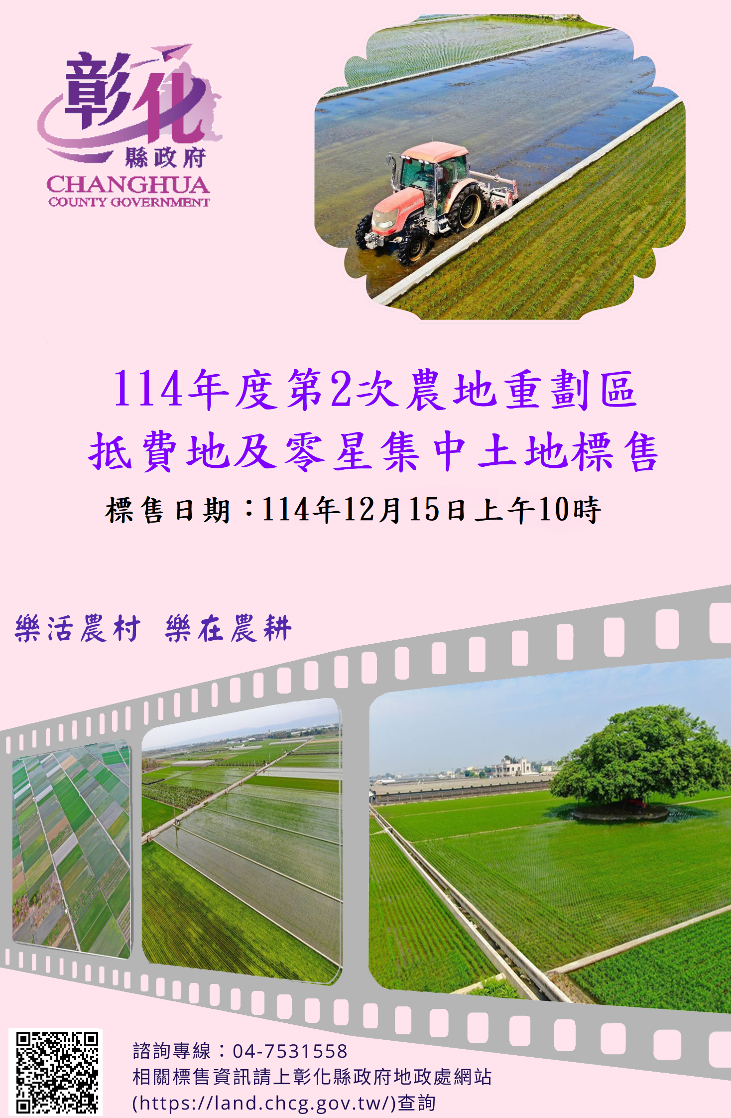 彰化縣政府訂於114年12月15日(星期一)上午10時辦理農地重劃區抵費地標售,此次標售土地分布於芳苑鄉、埔鹽鄉、福興鄉等11個鄉鎮,共計26筆,皆採現況標售,有興趣者可自行實地查勘(土地坐標詳本府地政處網站),了解土地現況、周邊環境,踴躍投標。 本縣農地重劃後土地具有臨路、灌排水便利、產權明確等優勢,有利於農耕使用,本次標售可供農用土地底價每平方公尺1,358元至5,600元不等,其中以芳苑鄉芳寮段400地號(面積2,461平方公尺)、鹿港鎮鹿洋段263地號(面積1,573.53平方公尺)、芳苑鄉芳寮段406地號(面積1,529平方公尺)土地等3筆土地面積較大,坵塊方整,欲擴大農場規模或想要擁有農地體驗耕作樂趣者,可把握難得機會喔。 有意願的民眾請自即日起至開標前1日辦公時間內(例假日除外),至土地所轄鄉鎮公所、地政事務所及本府地政處閱覽、領取投標資訊,或至本府地政處網站(https://land.chcg.gov.tw/)-業務專區項下之土地標售參閱下載,並於開標日上午9時信箱開啟前,寄達至彰化郵局第1025號信箱,如有疑問,可電洽彰化縣政府地政處重劃科詢問(電話:04-7531558)。