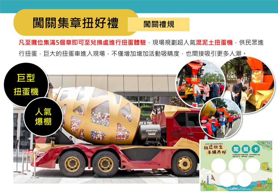 一年一度「彰化縣社區營造博覽會」即將熱鬧登場!活動將於本週日(11/30)下午1時在北斗奠安宮停車場盛大舉行,集結全縣42個社區(含協會及個人)與60個主題攤位,毫無保留地全面展現彰化各處社區的特色亮點與社造成果。縣長王惠美邀請大家蒞臨參與,走入社區、體驗創意,逛遊社區。一起在悠閒的週末午後,伴隨著灑下金黃色光輝的湛藍天際,走入鄉間聚集的人潮,看見屬於彰化縣每個鄉鎮的迷人敘事。 現場除精彩藝文展演、市集展售、闖關活動及手作體驗外,最吸睛的莫過於全台限定的「巨型混凝土扭蛋車」!以大型混凝土車改裝而成,讓人感受彷彿走進巨人王國的震撼,活動當日於現場攤位闖關集滿5個章即可免費獲得1次扭蛋抽獎機會,數量有限,抽完即止。凡於現場消費滿200元,還可參加「好康摸彩」,65吋液晶電視、氣炸鍋、烤箱等超值好禮等您帶回家! 此外,自即日起至12月28日期間,還有8條「魅力走讀~社區小旅行」,有快樂趣~田中老街巡禮、圈芬-探索芬園風味x文化漫時光、東螺泥巴控窯趣、田尾迷路小旅行、巡禮寶地斗溫情-文化美食𨑨迌去、百年紅磚之鑰-七彩寶石之謎、廍同凡響的社區輕旅行、卡里善之樹村落實境解謎,報名方式自即日起洽承辦單位報名,提供約千人名額,額滿即止,邀請大家展開步伐,用足跡感受這片土地獨特的肌理,嗅聞每個地方的人文風情。更多活動詳情,請上彰化縣文化局網站查詢: https://www.bocach.gov.tw/comunty/