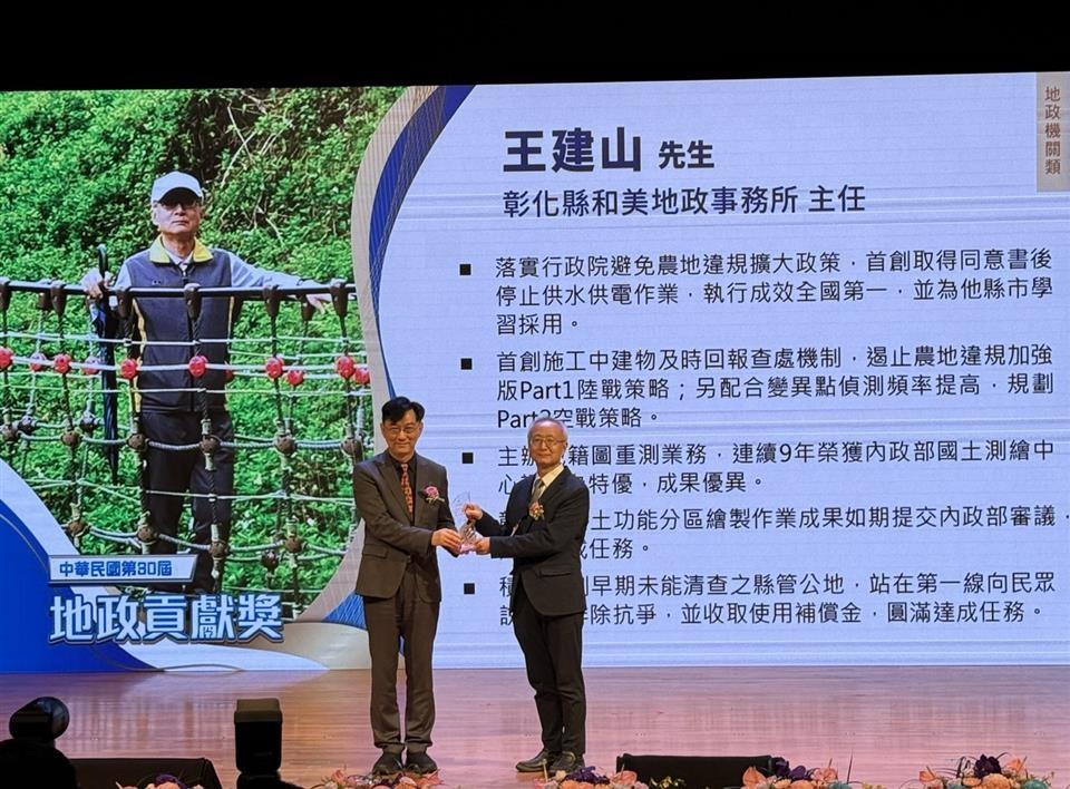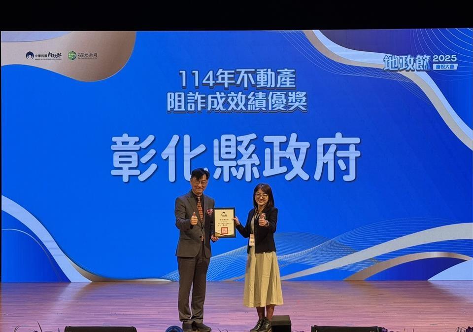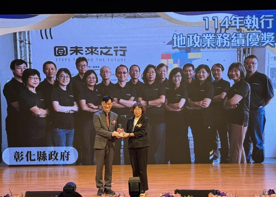 彰化縣政府地政處榮獲內政部114年對縣(市)政府地政業務督導考評「縣(市)組地政業務總考評績優獎」、「113年地籍圖重測考評優等獎」、「113年圖解數化地籍圖整合建置及都市計畫地形圖套疊考評優等獎」、「直轄市、縣(市)政府不動產阻詐成效績優獎」及和美地政事務所王建山主任榮膺中華民國第30屆「地政貢獻獎」等5大獎。彰化縣長王惠美於11月底擴大主管會報中表揚,並鼓勵同仁再接再厲,為民眾提供更優質的地政服務。 地政處表示,地政業務為地方建設及民眾安居的根基,本縣地政團隊積極推出20項年度創新,以提升整體服務品質,其中,「反詐騙2.0防護升級實施計畫—共同守護財產安全」,從事前預防、事中警示到事後追蹤,全面提升不動產交易的安全防線;「測量資訊系統化 成果共享爭議少」透過測量檔案整合與共享,有效提升作業效率並降低鑑界錯誤率,增進民眾信賴;亦持續推動18項服務優化與創新擴散措施,擴及服務民眾觸及面,例如:「預售備查抵叨位 乎我來報你知」結合Google Maps平台,建置「彰化縣預售屋地圖」,協助民眾即時掌握預售屋資訊;「土地財產健檢揪感心」方案更擴大實施至各地政事務所,透過貼心服務展現地政團隊對社會的關懷與責任,深獲內政部考評委員及長官肯定。 今年本縣地政團隊榮獲5大獎項肯定,充分展現了努力打拼的豐碩成果與奉獻精神。未來地政團隊將持續肩負起土地管理與保障民眾權益的責任,秉持為民服務的初心和與時俱進的工作態度,積極推動創新與便民措施,共同打造美好彰化幸福城市的願景,邁向永續發展的未來。